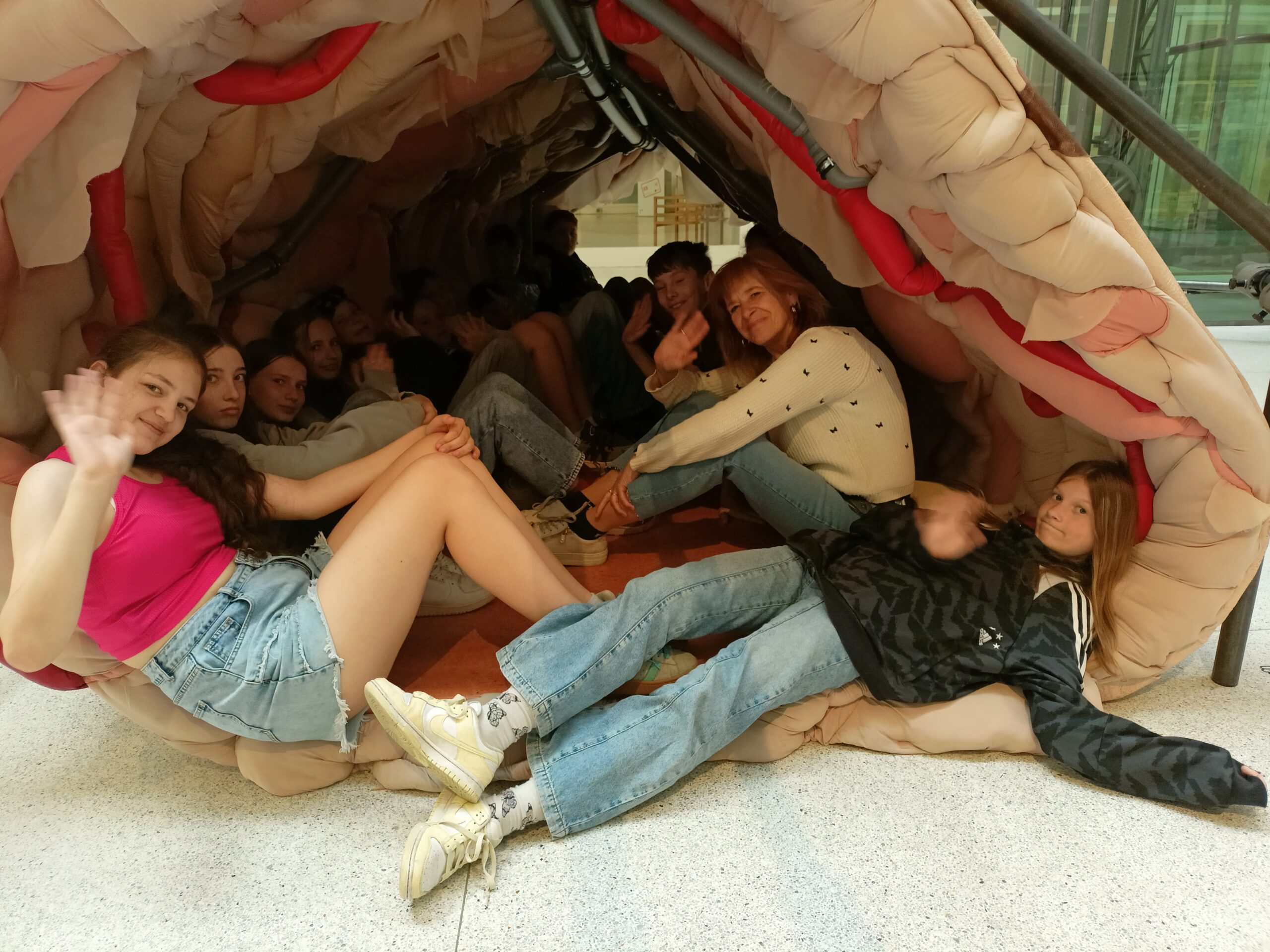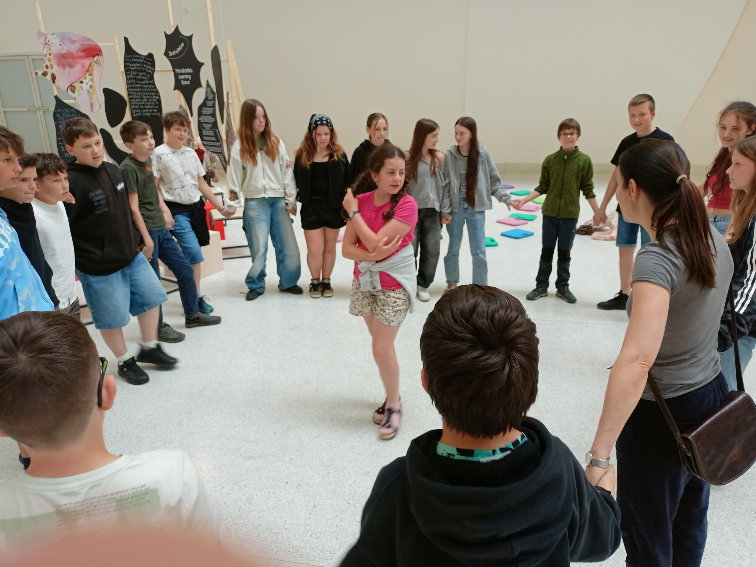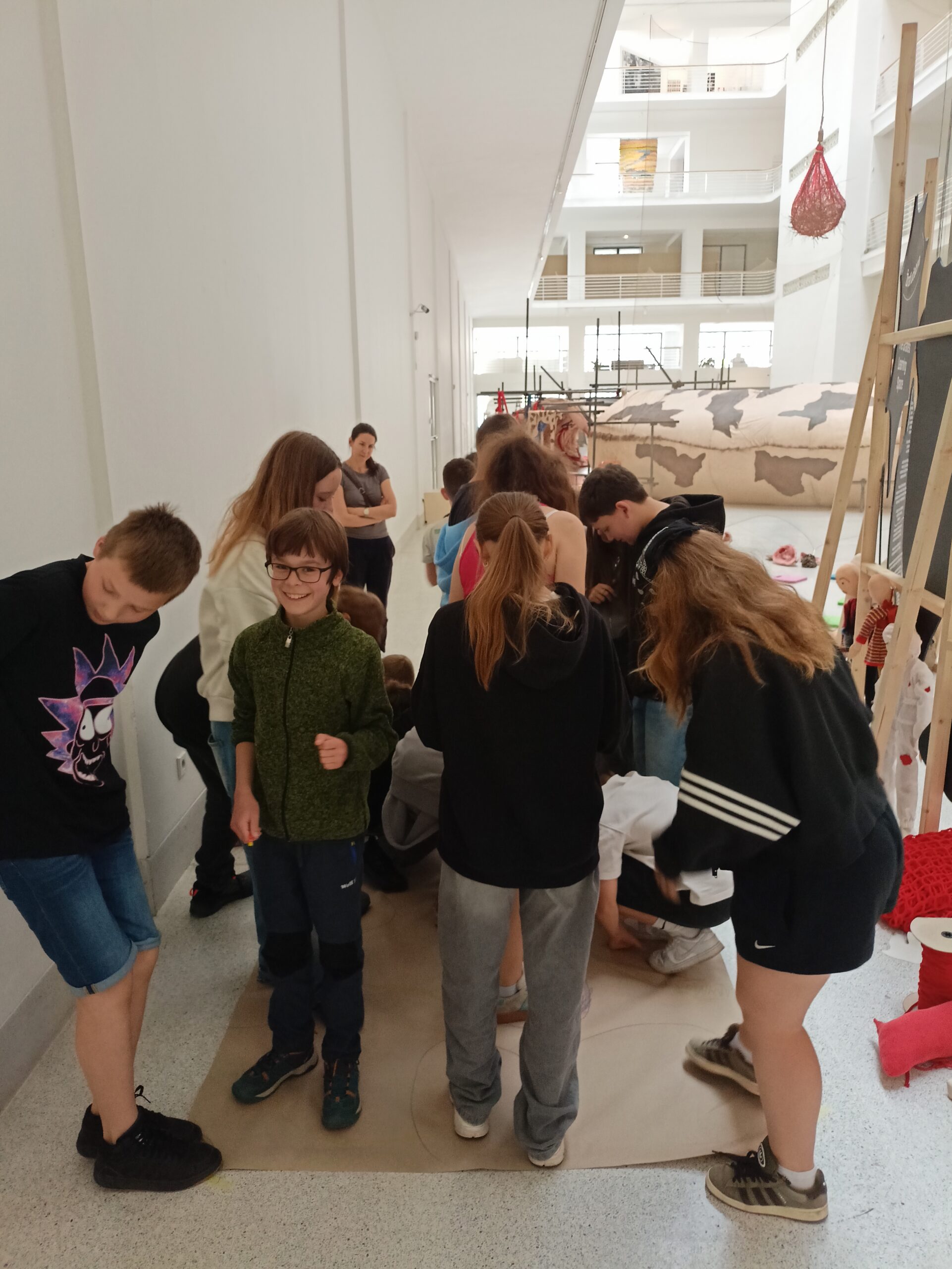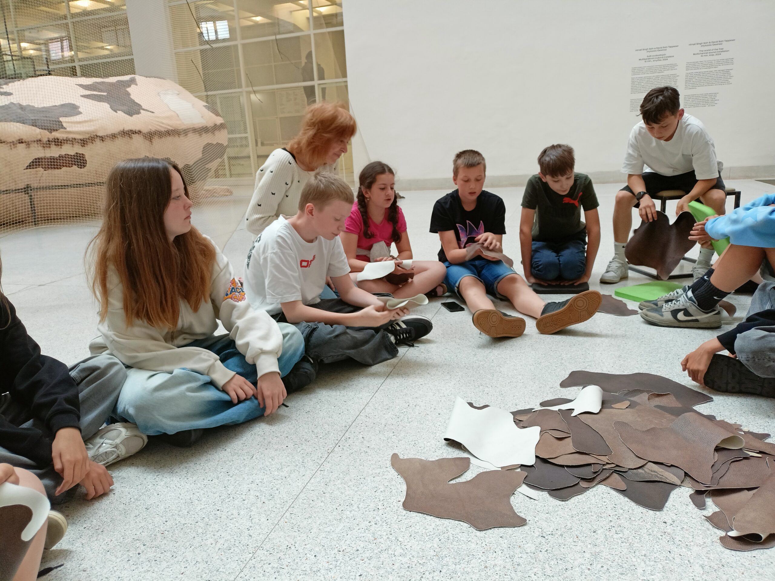 Ve Veletržním paláci (Dvoraně Veletržního paláce), nás čekal prostor s velkou instalací, ve kterém jsme se všichni mohli společně procházet, sami se v něm ukrýt, prozkoumávat ho, naslouchat zvukům uvnitř a vyslechnout krátké audio příběhy. Umělkyně Eva Koťátková připravila netradiční prostor improvizující zvětšený krk Žirafy Lenky, která krátce žila v Pražské ZOO. Její životní osud umělkyni natolik fascinoval, že ji přiměl k tvorbě interaktivního prostoru pro návštěvníky a účastníky workshopů. Součástí tohoto prostoru byla učebna s texty, textilní objekty, odlitky jednotlivých částí těla žirafy, popis jejího osudu. Niternost a fascinace prostorem nás doslova ohromila. Součástí workshopu byli i edukační hry, které byly na téma prostor, izolace a sebevyjádření svého prostoru. Mohli jsme i napsat osobní vzkaz autorce výstavy. Niternost, vjemy a fascinace konceptem a prostorem výstavy v nás vyvolala dojmy rozjímání o přírodě, životě, o konci života, odkazu přírody, vlastním prostoru potažmo o jeho sdílení. Výstavu vřele doporučujeme všem!!! A jedno přání žáků z prožitého workshopu? Mít tak podobný a niterný prostor k rozjímání i ve škole!…