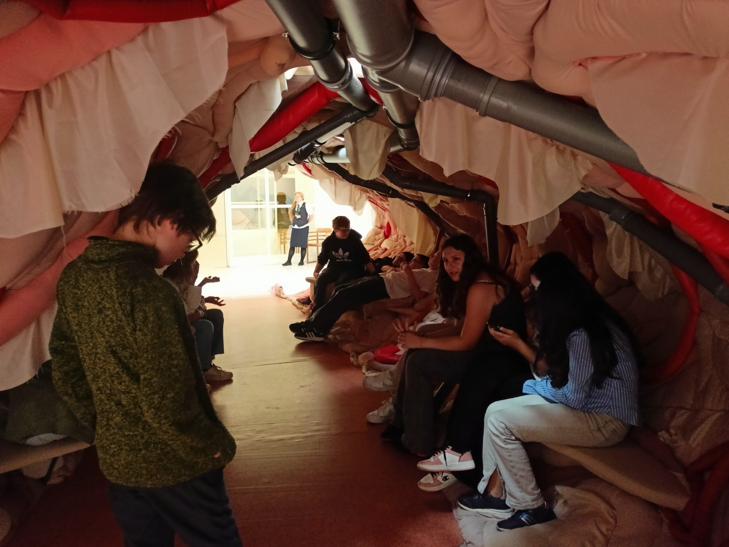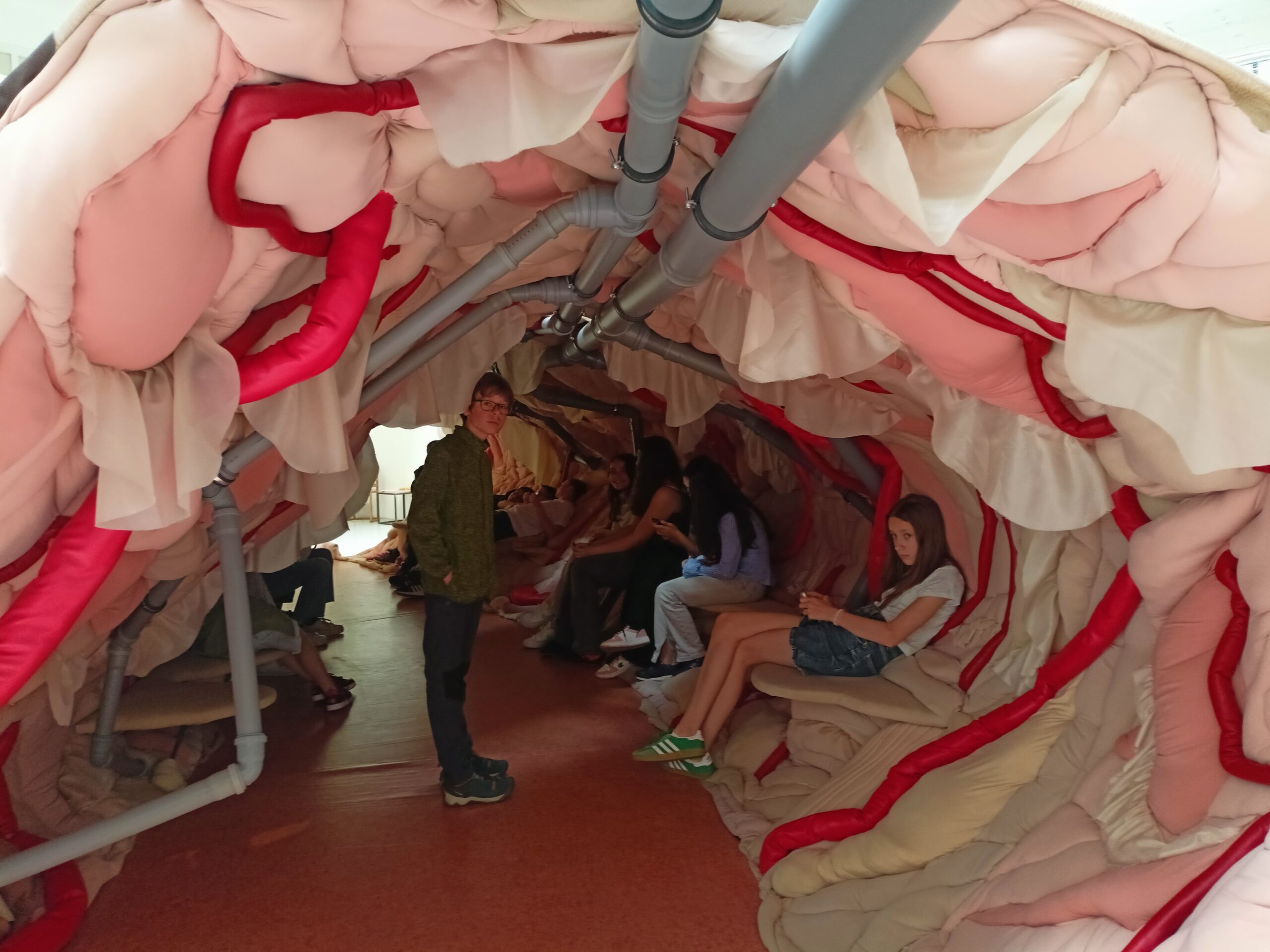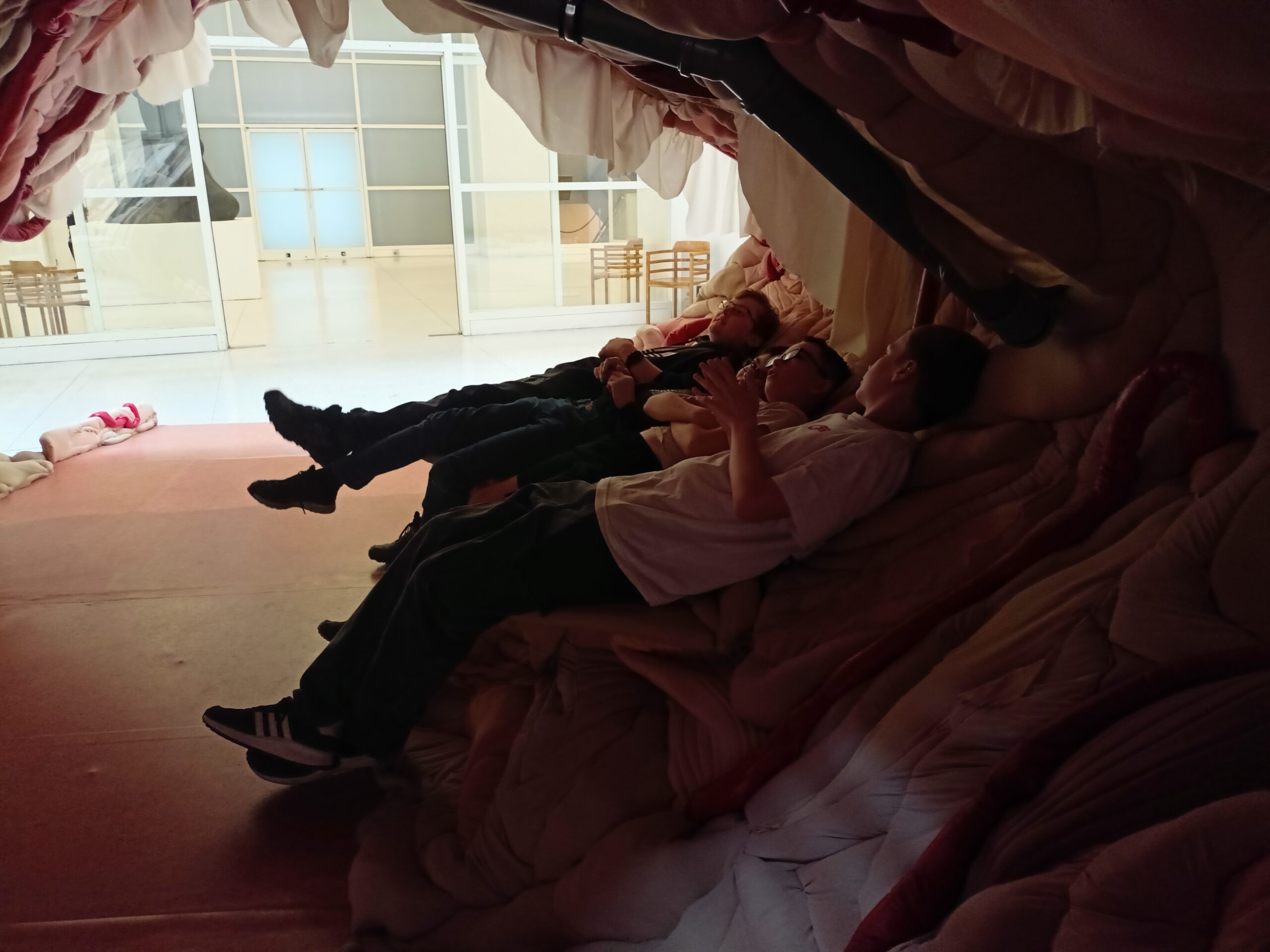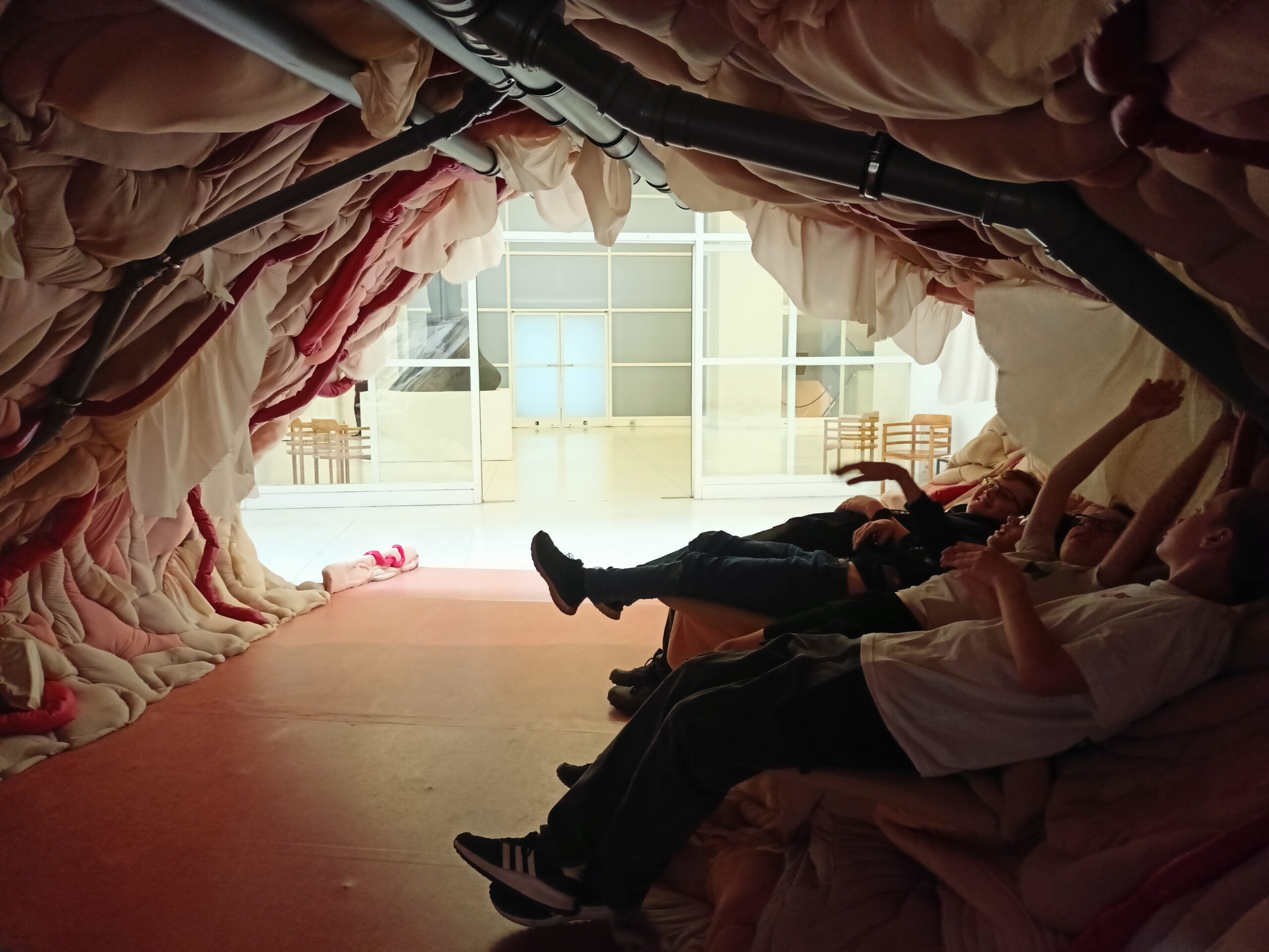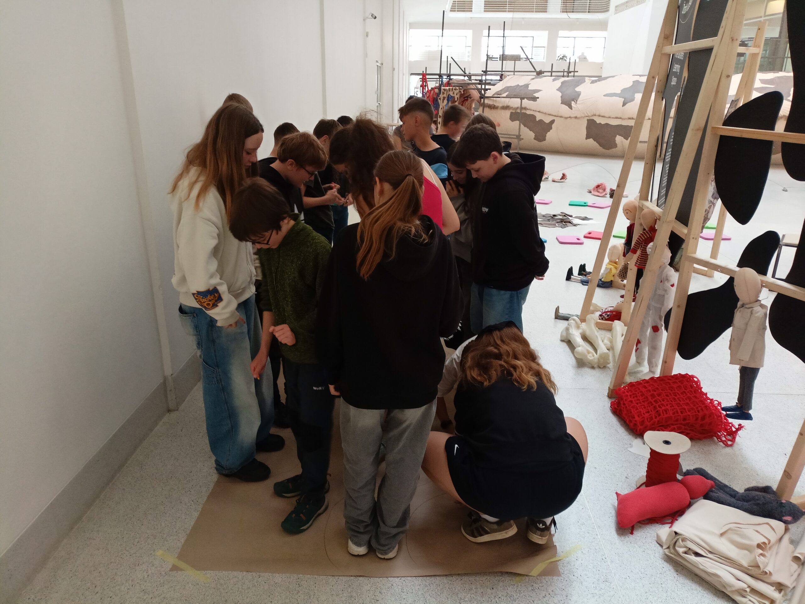 Ve Veletržním paláci (Dvoraně Veletržního paláce), nás čekal prostor s velkou instalací, ve kterém jsme se všichni mohli společně procházet, sami se v něm ukrýt, prozkoumávat ho, naslouchat zvukům uvnitř a vyslechnout krátké audio příběhy. Umělkyně Eva Koťátková připravila netradiční prostor improvizující zvětšený krk Žirafy Lenky, která krátce žila v Pražské ZOO. Její životní osud umělkyni natolik fascinoval, že ji přiměl k tvorbě interaktivního prostoru pro návštěvníky a účastníky workshopů. Součástí tohoto prostoru byla učebna s texty, textilní objekty, odlitky jednotlivých částí těla žirafy, popis jejího osudu. Niternost a fascinace prostorem nás doslova ohromila. Součástí workshopu byli i edukační hry, které byly na téma prostor, izolace a sebevyjádření svého prostoru. Mohli jsme i napsat osobní vzkaz autorce výstavy. Niternost, vjemy a fascinace konceptem a prostorem výstavy v nás vyvolala dojmy rozjímání o přírodě, životě, o konci života, odkazu přírody, vlastním prostoru potažmo o jeho sdílení. Výstavu vřele doporučujeme všem!!! A jedno přání žáků z prožitého workshopu? Mít tak podobný a niterný prostor k rozjímání i ve škole!…
