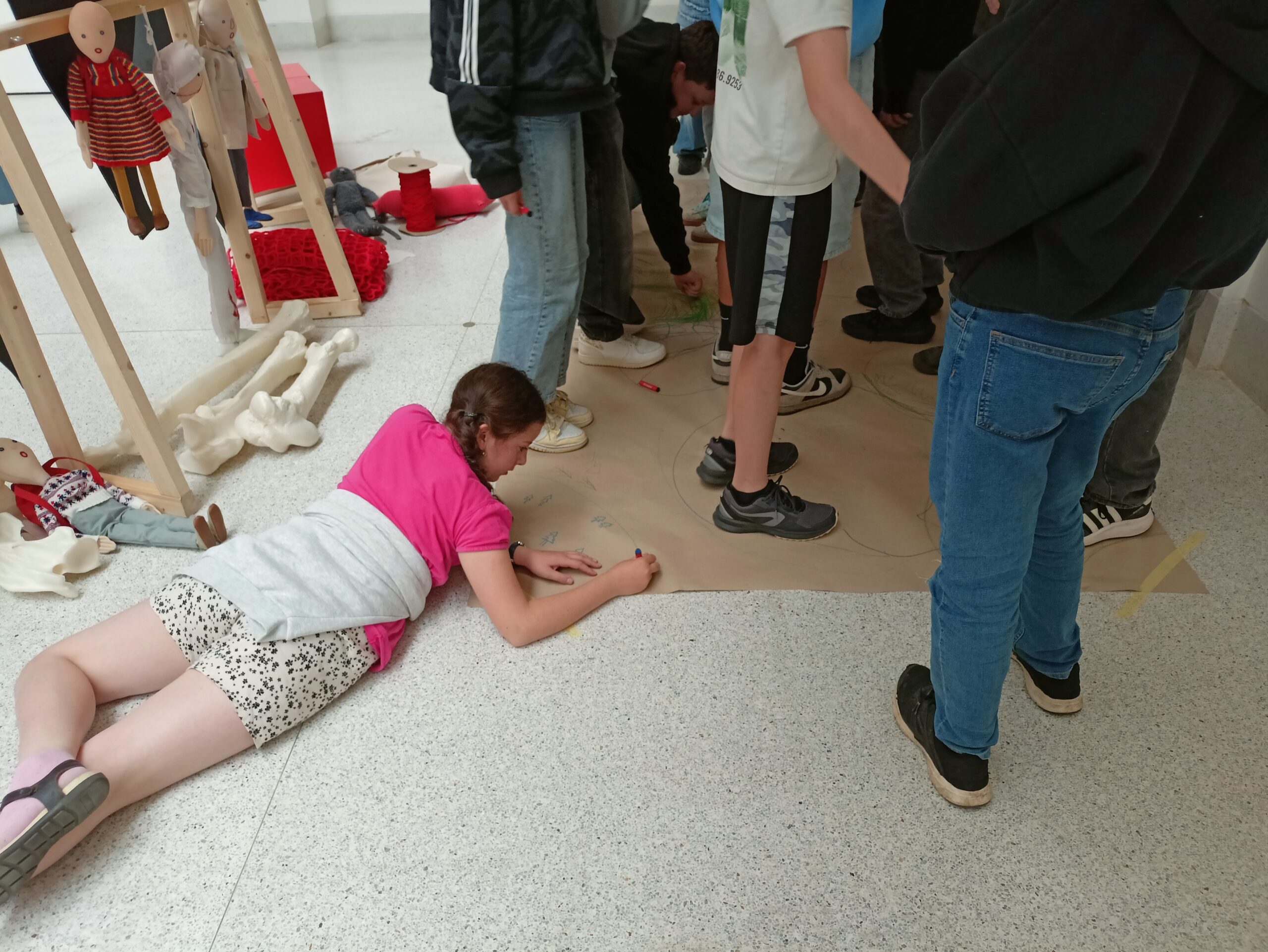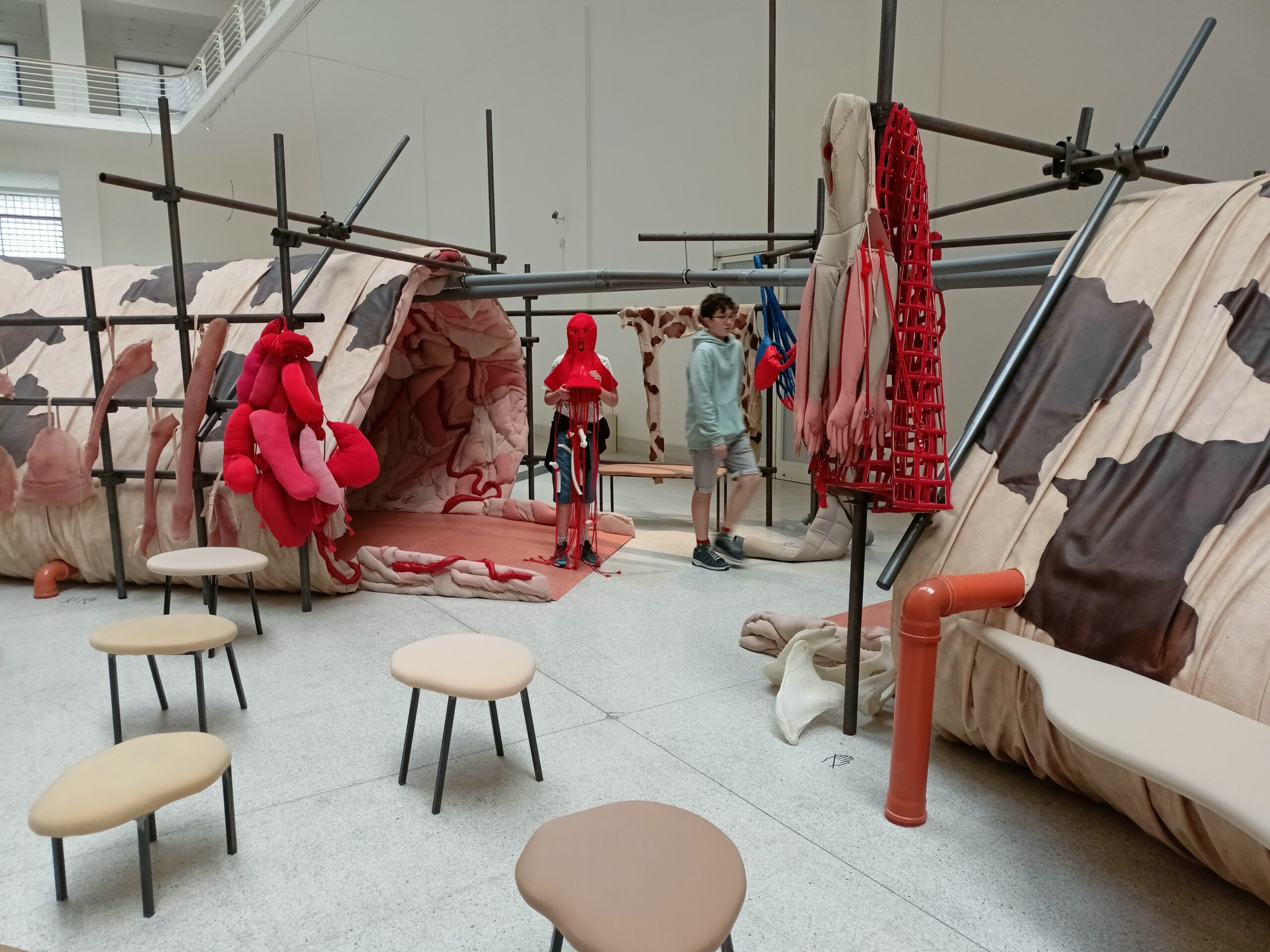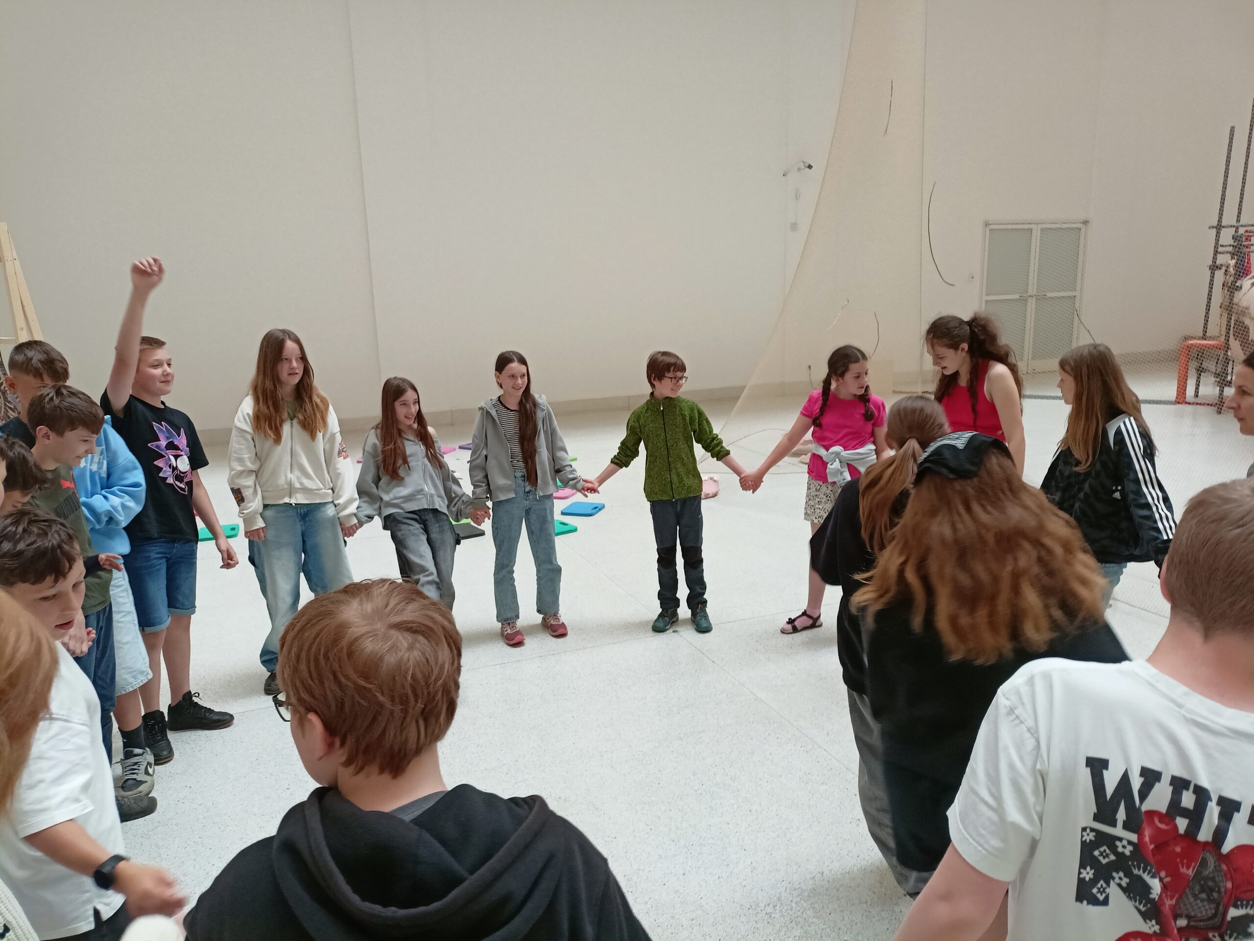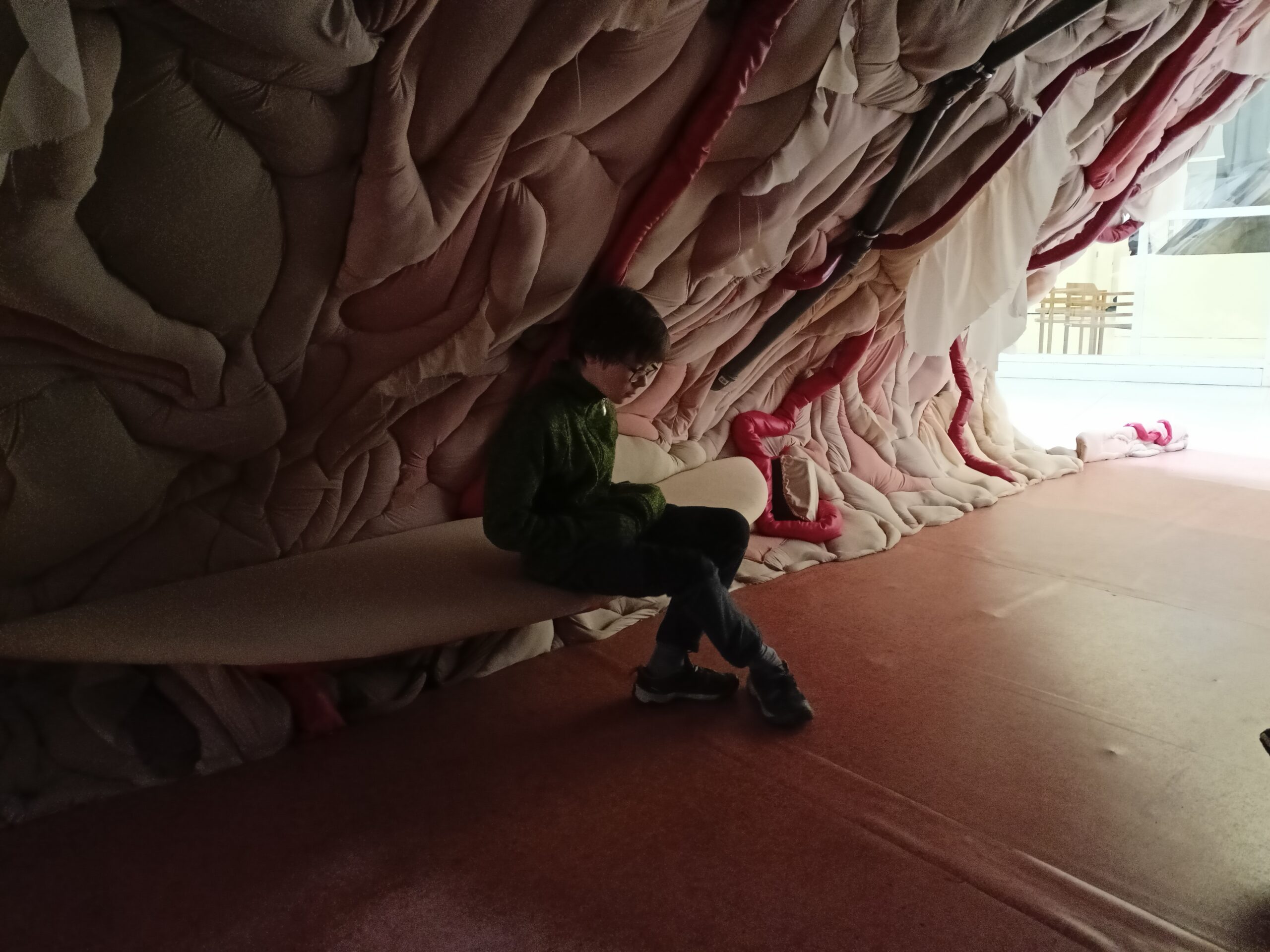 Ve Veletržním paláci (Dvoraně Veletržního paláce), nás čekal prostor s velkou instalací, ve kterém jsme se všichni mohli společně procházet, sami se v něm ukrýt, prozkoumávat ho, naslouchat zvukům uvnitř a vyslechnout krátké audio příběhy. Umělkyně Eva Koťátková připravila netradiční prostor improvizující zvětšený krk Žirafy Lenky, která krátce žila v Pražské ZOO. Její životní osud umělkyni natolik fascinoval, že ji přiměl k tvorbě interaktivního prostoru pro návštěvníky a účastníky workshopů. Součástí tohoto prostoru byla učebna s texty, textilní objekty, odlitky jednotlivých částí těla žirafy, popis jejího osudu. Niternost a fascinace prostorem nás doslova ohromila. Součástí workshopu byli i edukační hry, které byly na téma prostor, izolace a sebevyjádření svého prostoru. Mohli jsme i napsat osobní vzkaz autorce výstavy. Niternost, vjemy a fascinace konceptem a prostorem výstavy v nás vyvolala dojmy rozjímání o přírodě, životě, o konci života, odkazu přírody, vlastním prostoru potažmo o jeho sdílení. Výstavu vřele doporučujeme všem!!! A jedno přání žáků z prožitého workshopu? Mít tak podobný a niterný prostor k rozjímání i ve škole!…