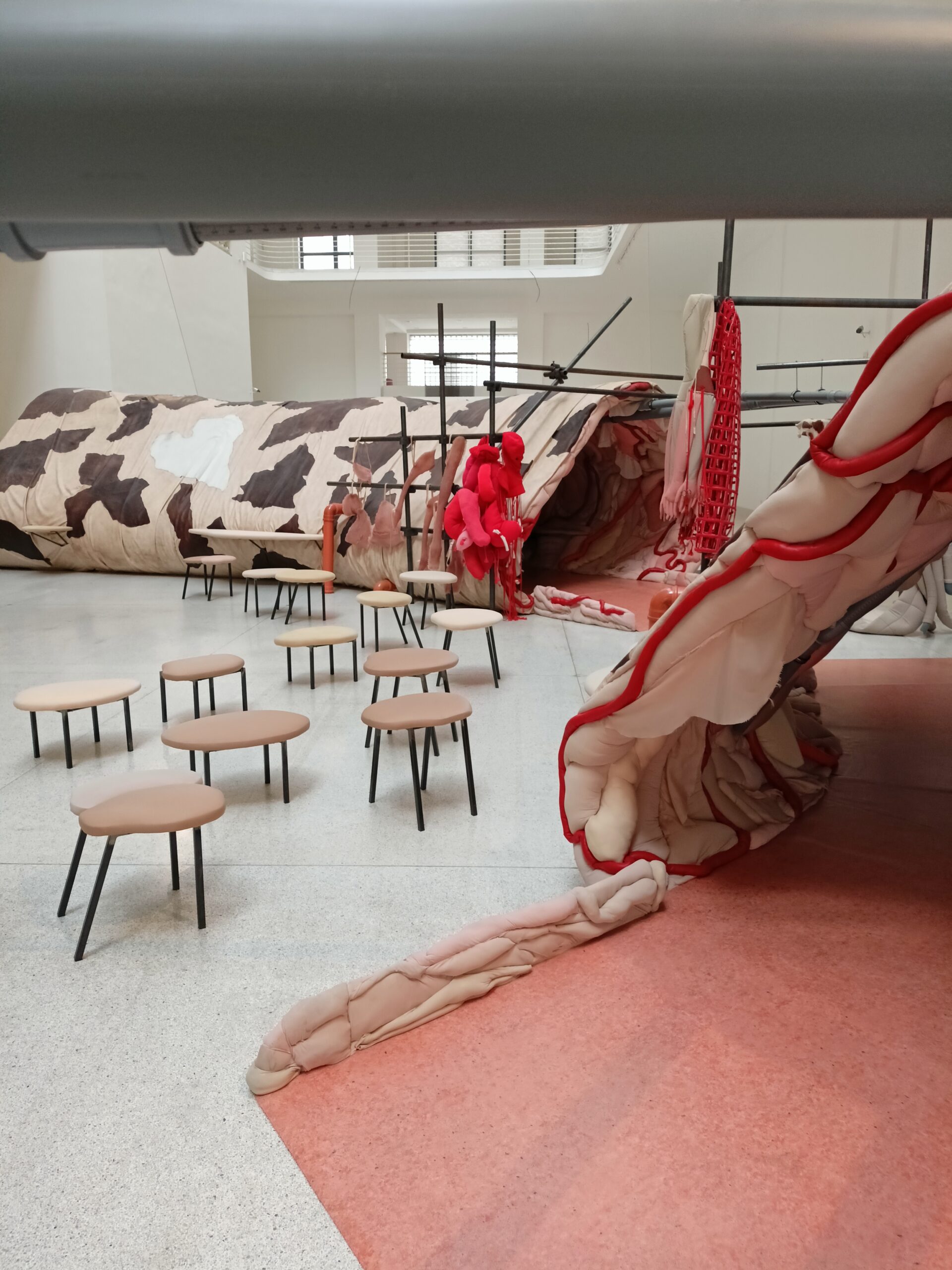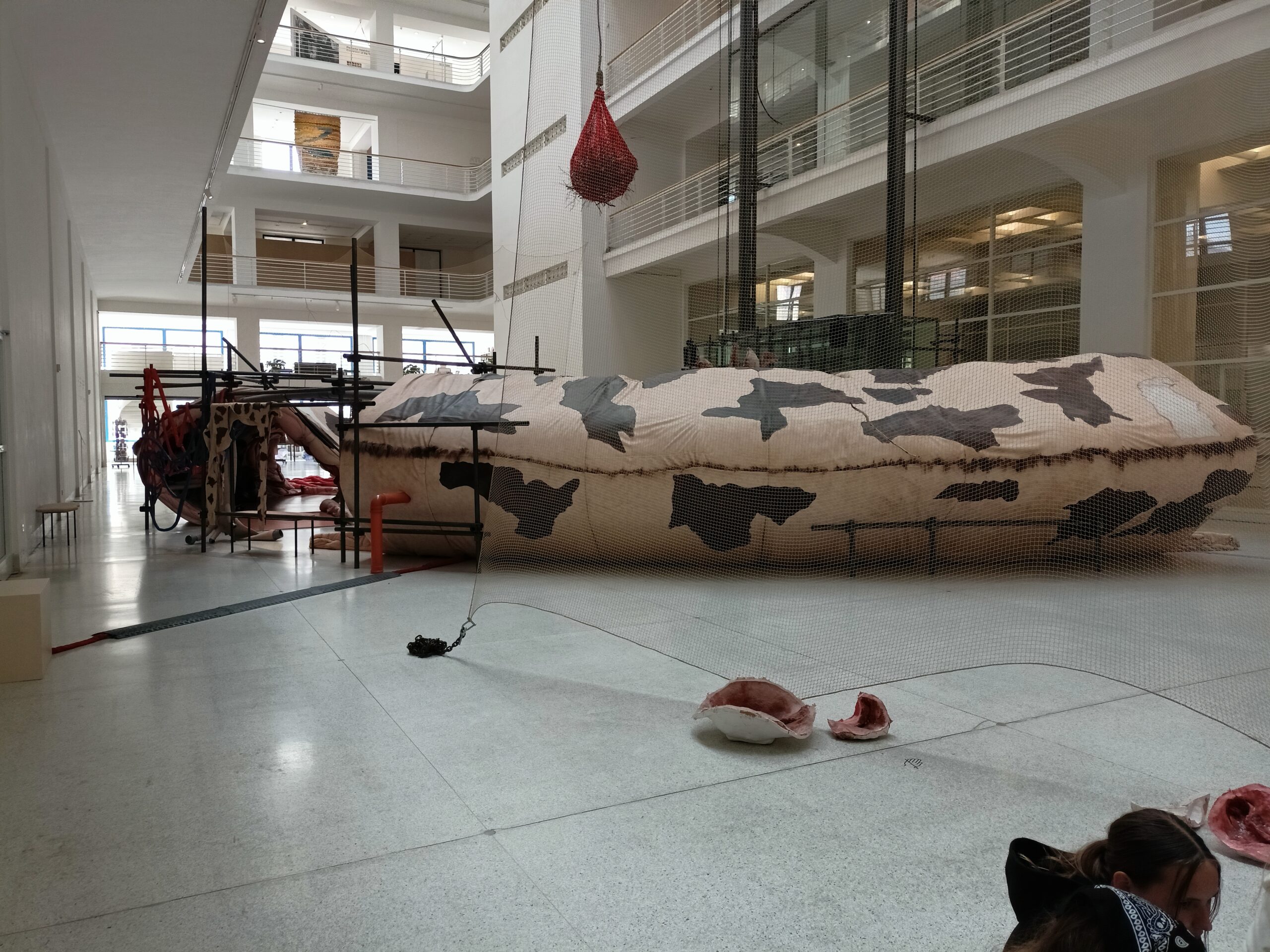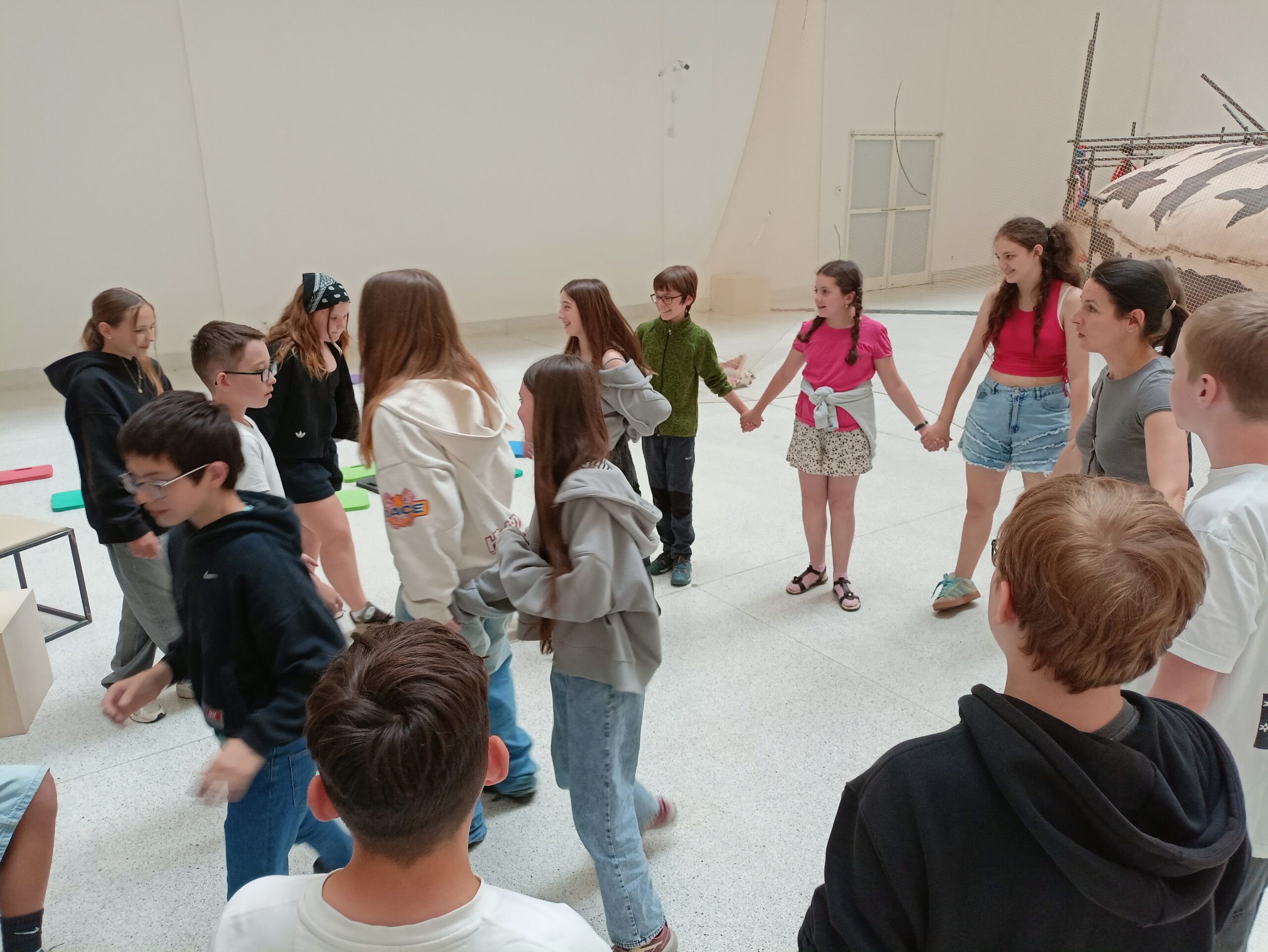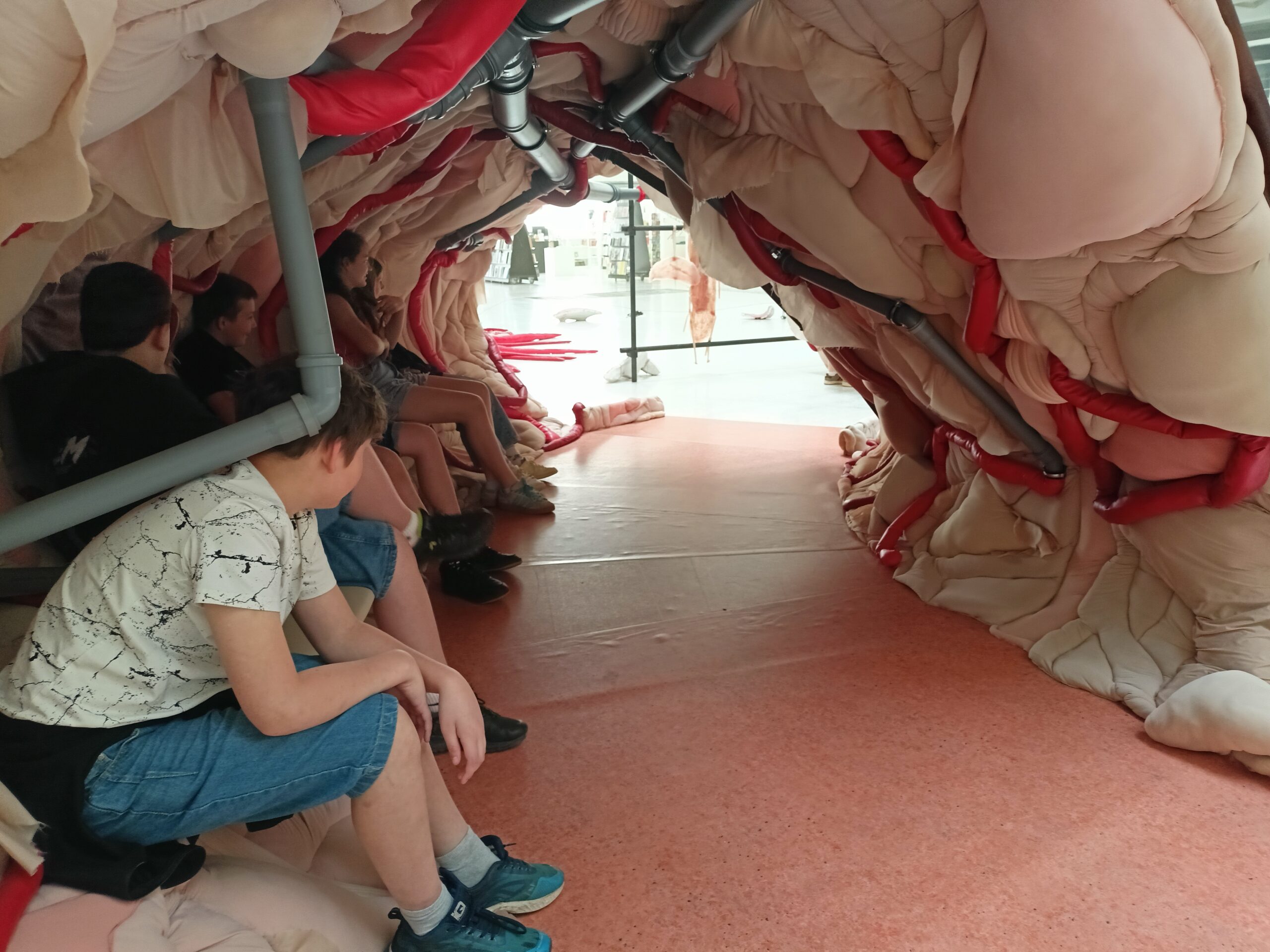Ve Veletržním paláci (Dvoraně Veletržního paláce), nás čekal prostor s velkou instalací, ve kterém jsme se všichni mohli společně procházet, sami se v něm ukrýt, prozkoumávat ho, naslouchat zvukům uvnitř a vyslechnout krátké audio příběhy. Umělkyně Eva Koťátková připravila netradiční prostor improvizující zvětšený krk Žirafy Lenky, která krátce žila v Pražské ZOO. Její životní osud umělkyni natolik fascinoval, že ji přiměl k tvorbě interaktivního prostoru pro návštěvníky a účastníky workshopů. Součástí tohoto prostoru byla učebna s texty, textilní objekty, odlitky jednotlivých částí těla žirafy, popis jejího osudu. Niternost a fascinace prostorem nás doslova ohromila. Součástí workshopu byli i edukační hry, které byly na téma prostor, izolace a sebevyjádření svého prostoru. Mohli jsme i napsat osobní vzkaz autorce výstavy. Niternost, vjemy a fascinace konceptem a prostorem výstavy v nás vyvolala dojmy rozjímání o přírodě, životě, o konci života, odkazu přírody, vlastním prostoru potažmo o jeho sdílení. Výstavu vřele doporučujeme všem!!! A jedno přání žáků z prožitého workshopu? Mít tak podobný a niterný prostor k rozjímání i ve škole!…