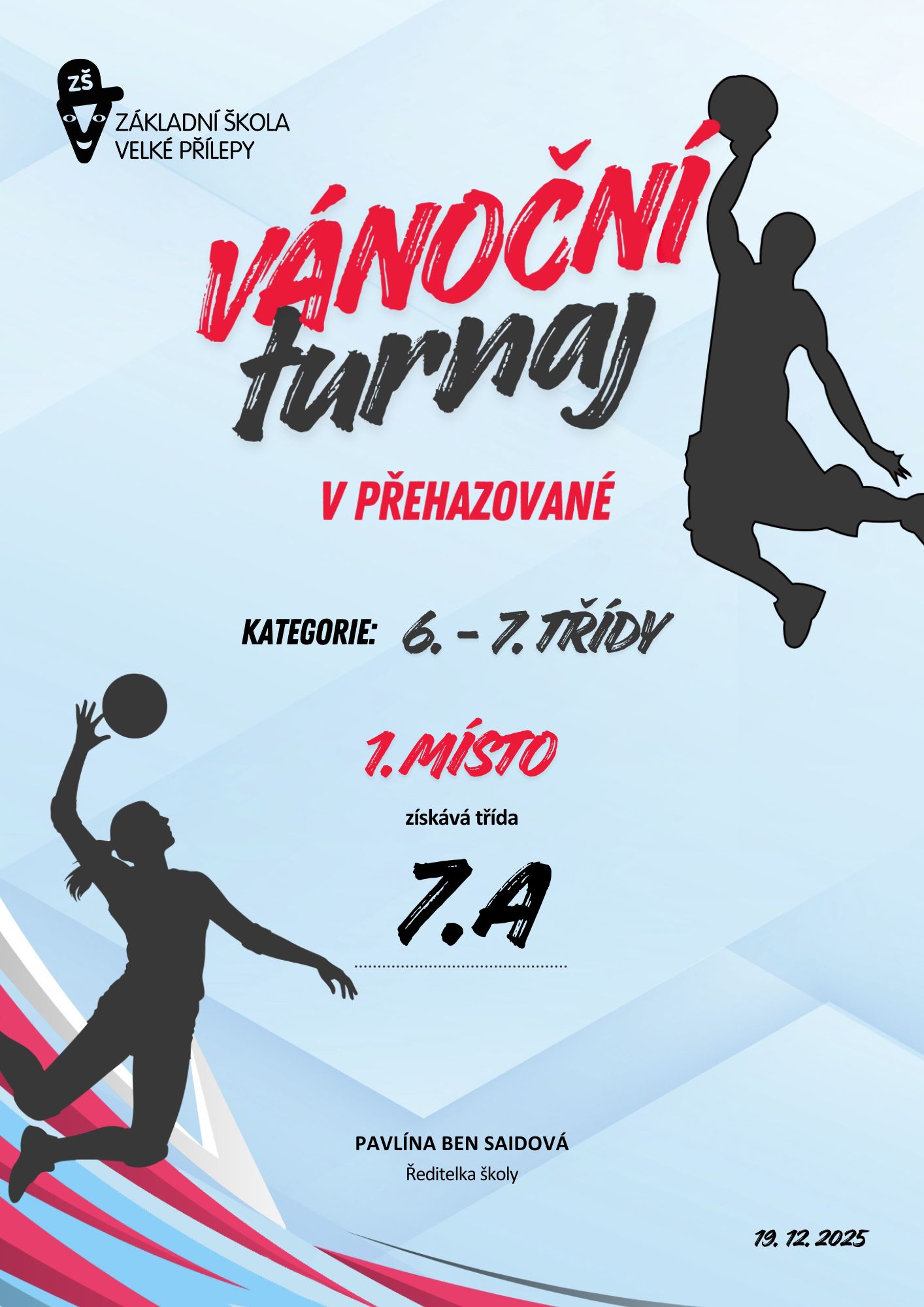 V pátek 19. 12. proběhl na naší škole vánoční turnaj v přehazované pro druhý stupeň. V první části se o umístění popraly šesté a sedmé třídy. Soutěžilo se ve smíšených týmech a nejúspěšnější byla třída VII. A, druhé místo obsadila VII. B, bronz patřil VI. A a čtvrté místo obsadila VI. B.