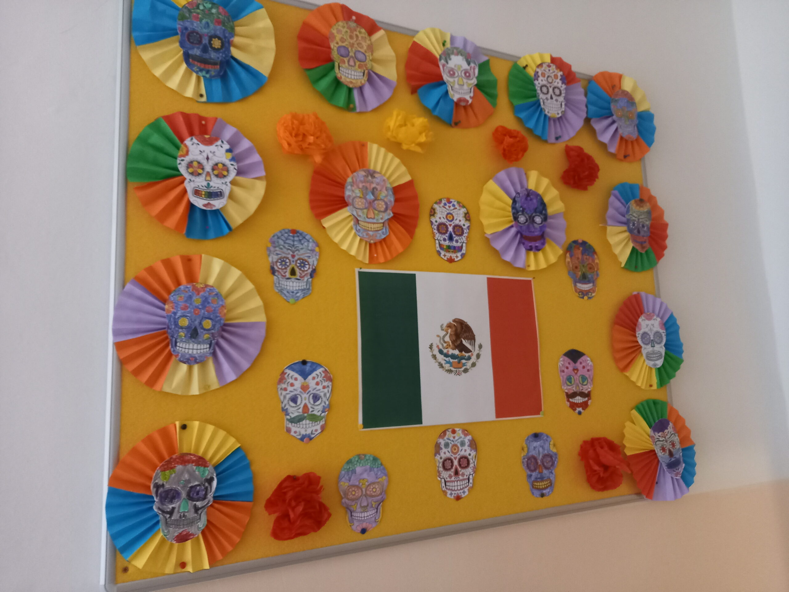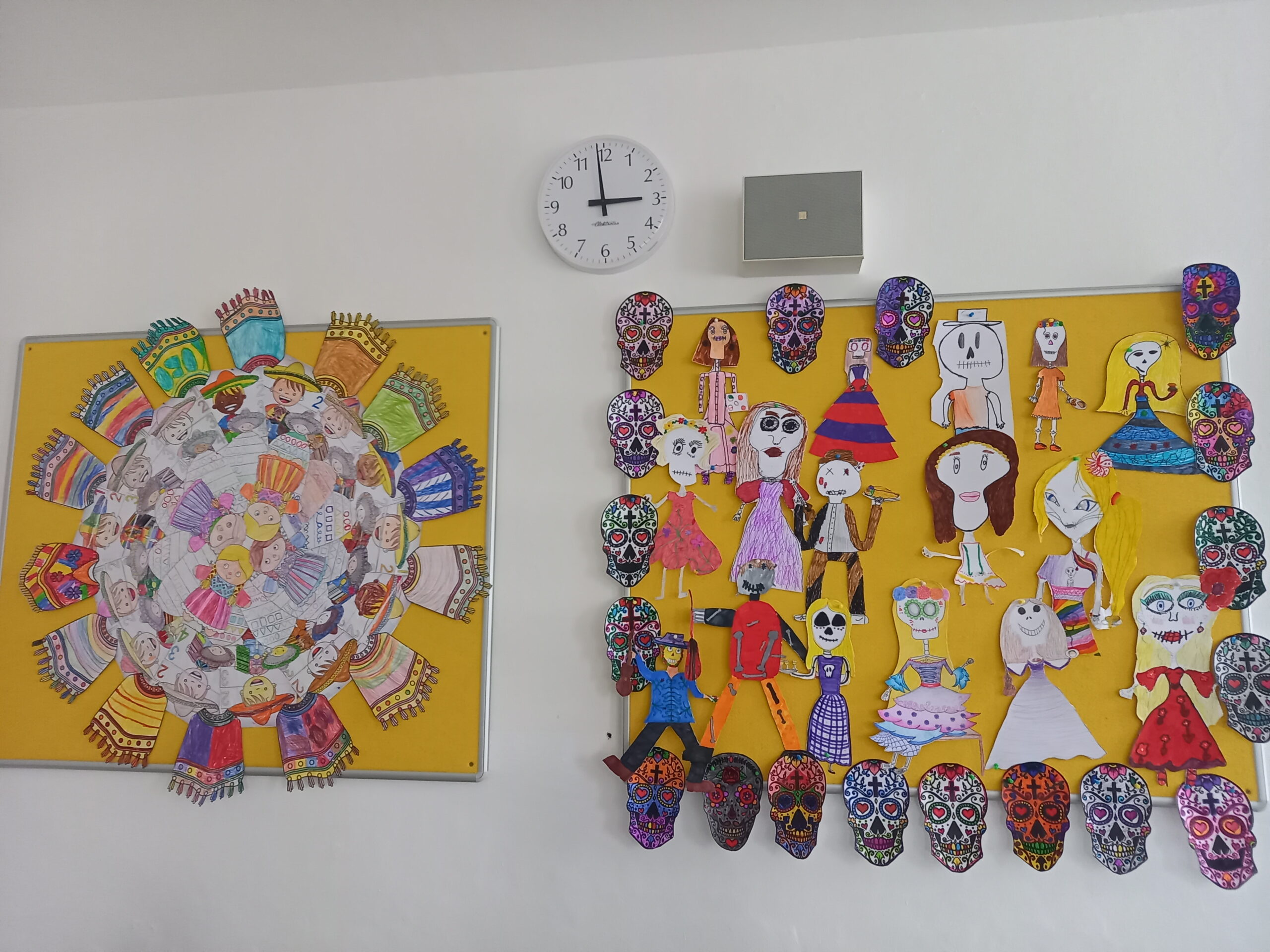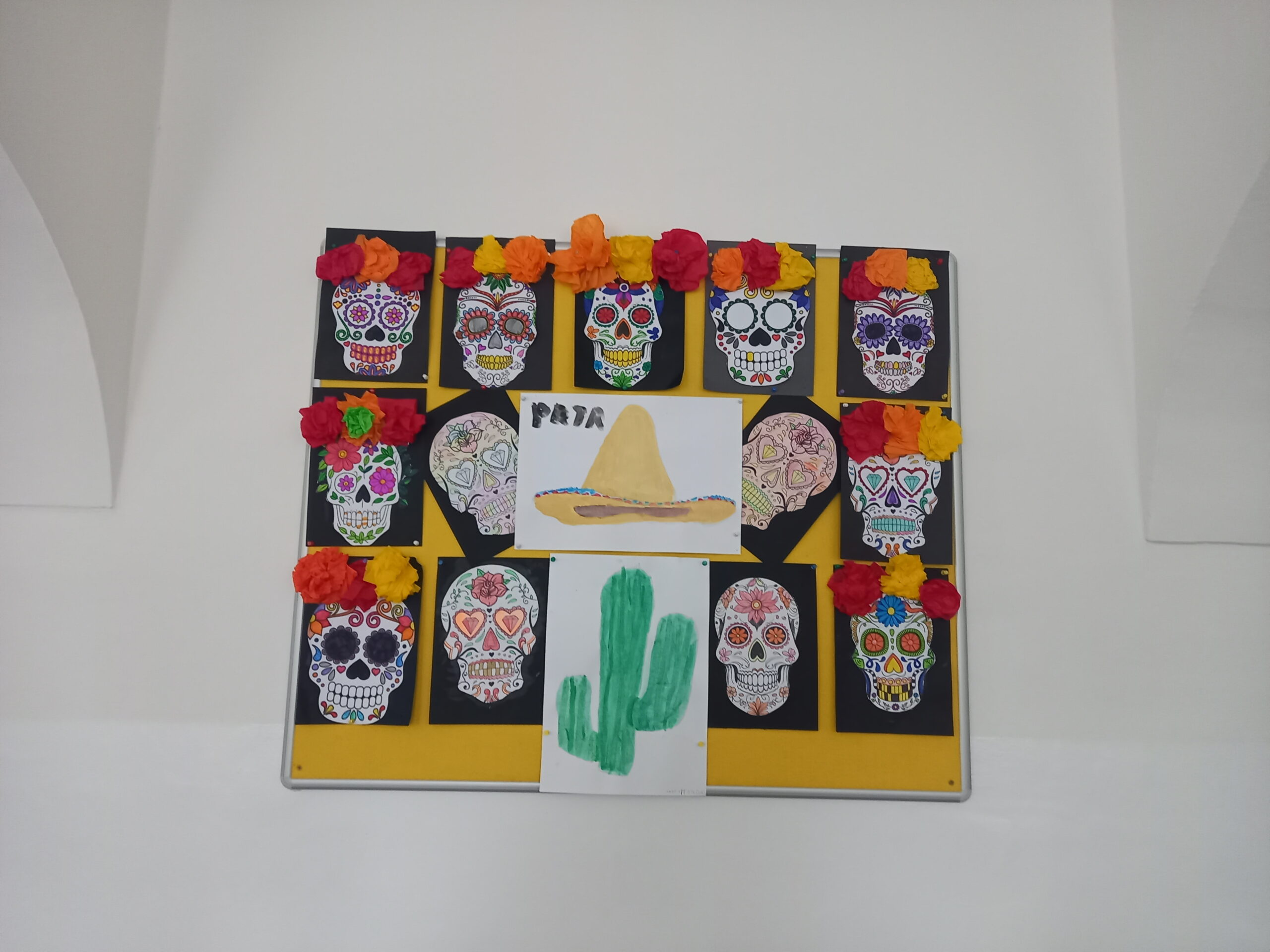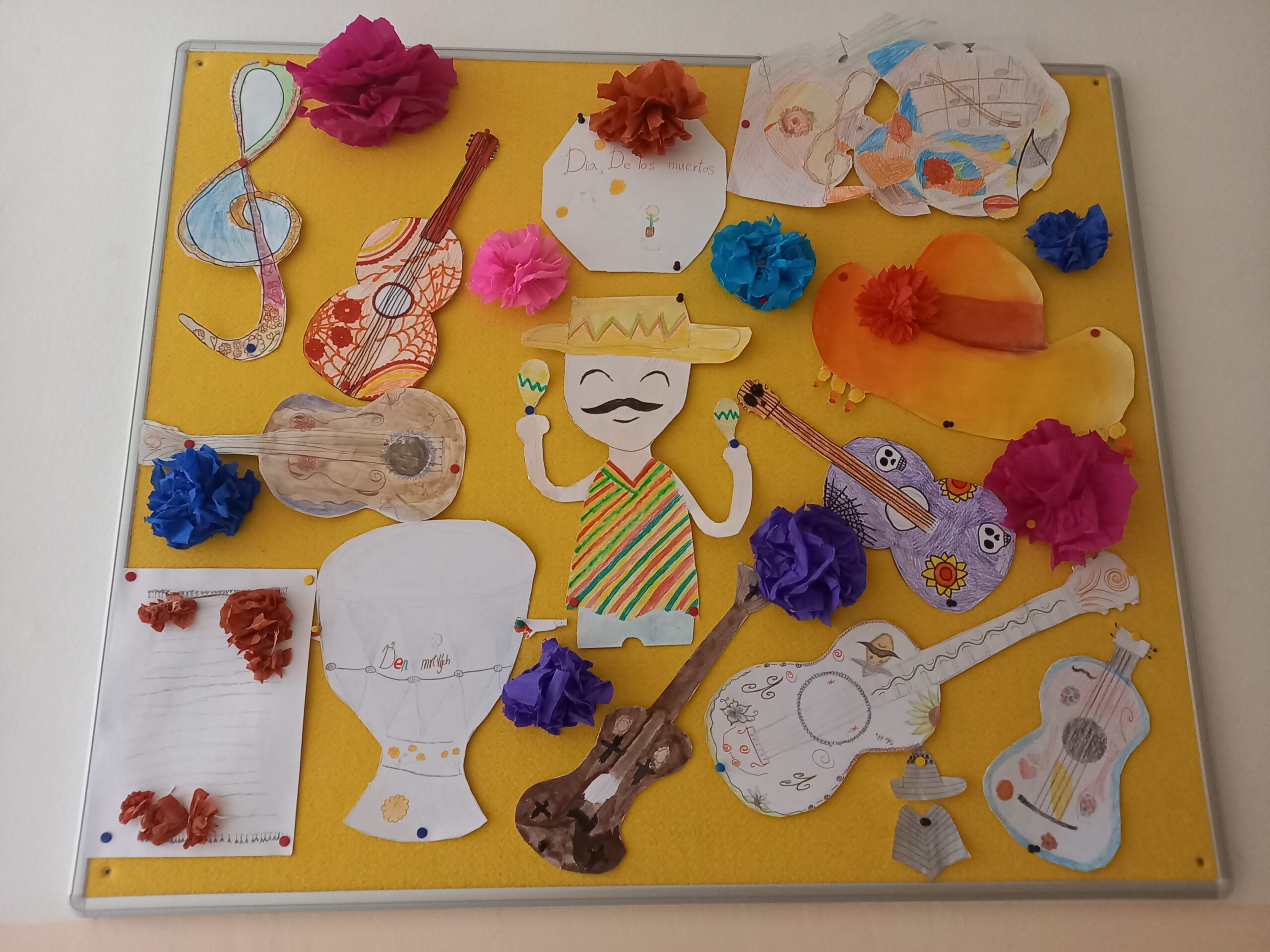 Ale hlavně tomuto dni předcházela bohatá činnost na 1. stupni, abychom v obou výdejnách pocítili mexickou atmosféru. Malovaly se masky muertos, ponča, typické hudební nástroje, sombrera, tvořily se papírové tortilly a tacos k nakousnutí, povídalo se o Mexiku, o zemi pro nás tak vzdálené a pouštěla se svěží mexická hudba. Ve družině byl i čas na zhlédnutí animovaného filmu mexické oslavy Svátku zemřelých Coco.