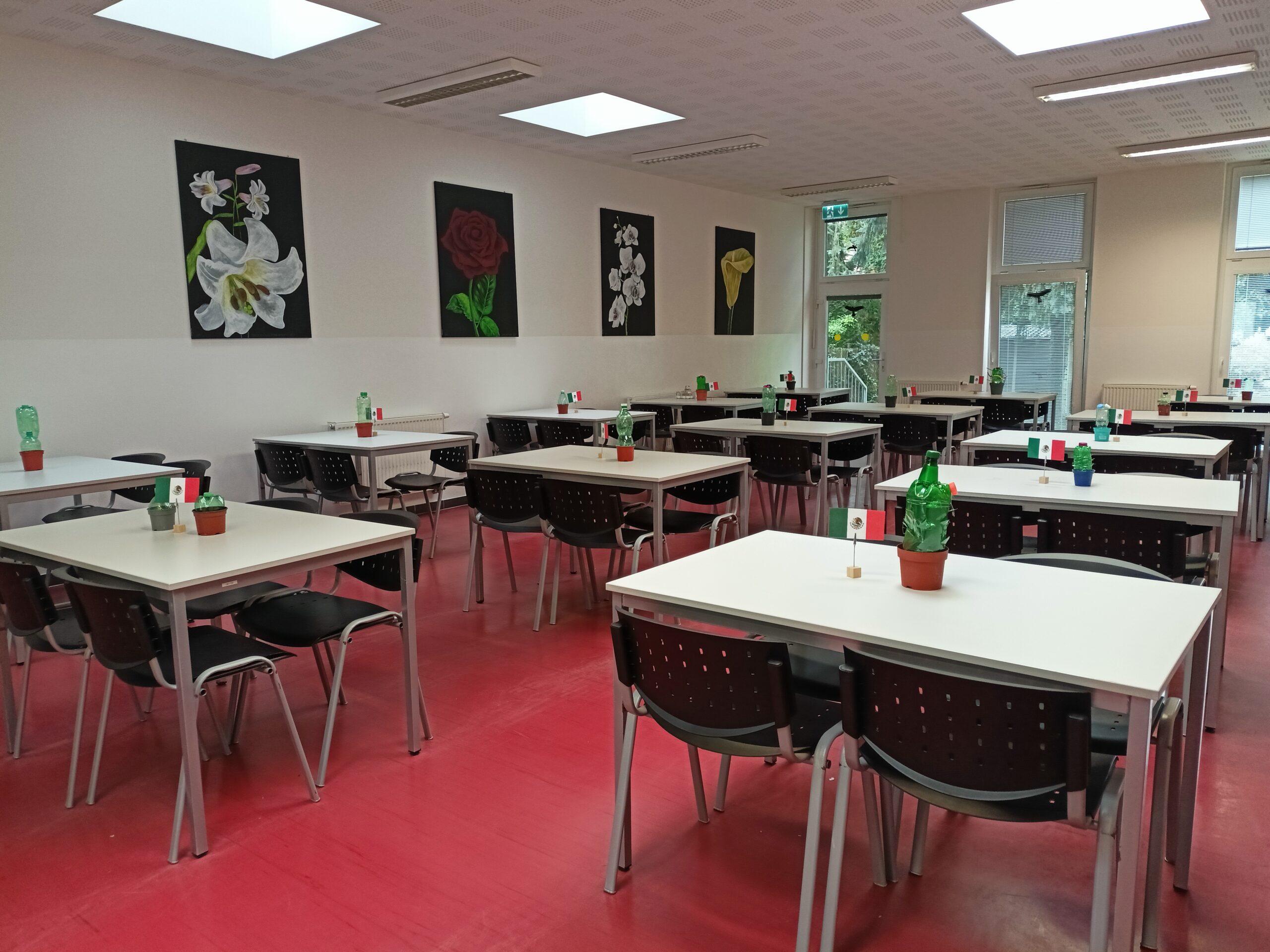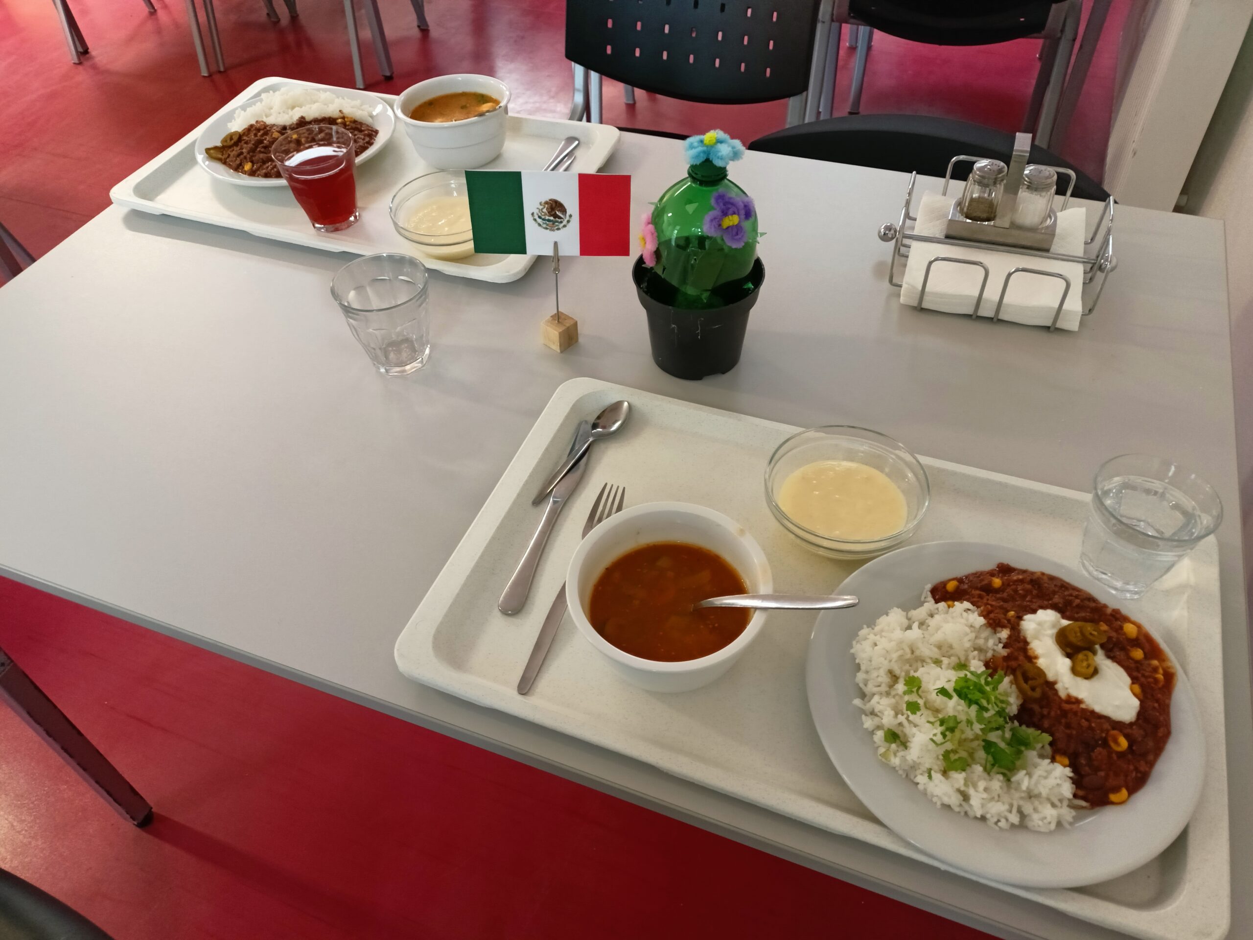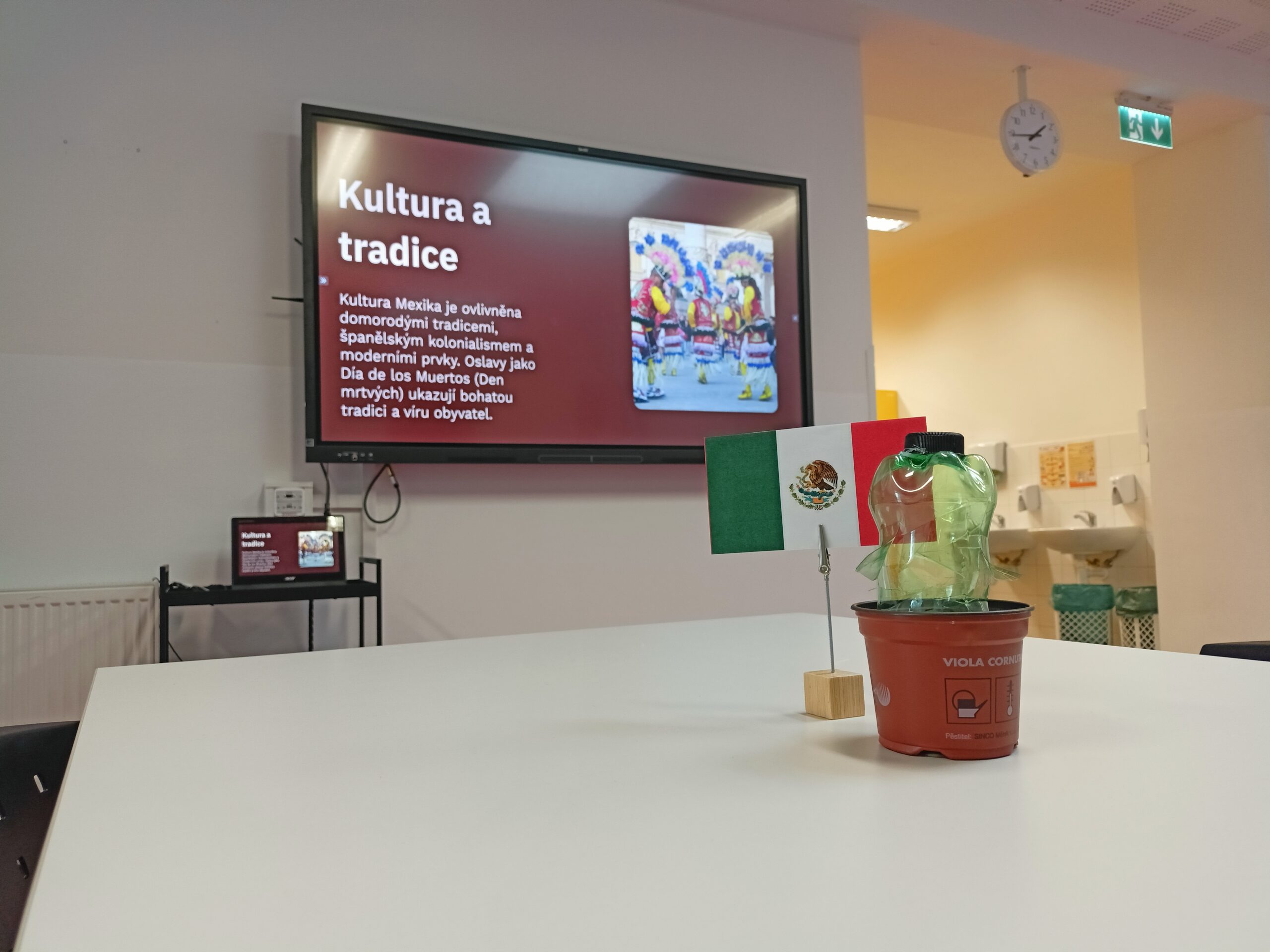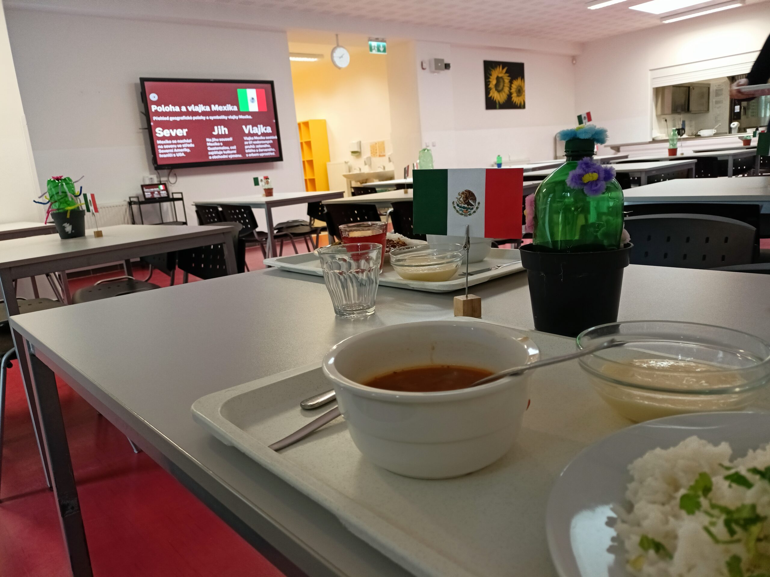 Na 2.stupni jsme si v hodinách zeměpisu také povídali o Mexiku jako zemi krásné přírody, pestré historie a cíli turistického ruchu. Více jsme se zaměřili na výklad o vlajce Mexika, protože to se běžně neučíme. Deváťáci připravili zajímavé prezentace o státu, historii, ale i kuchyni a konkrétním jídlu, které v jídelně ve smyčce běžely na interaktivní tabuli během oběda. Stoly ozdobily vlaječky Mexika a kaktusy z PET lahví.