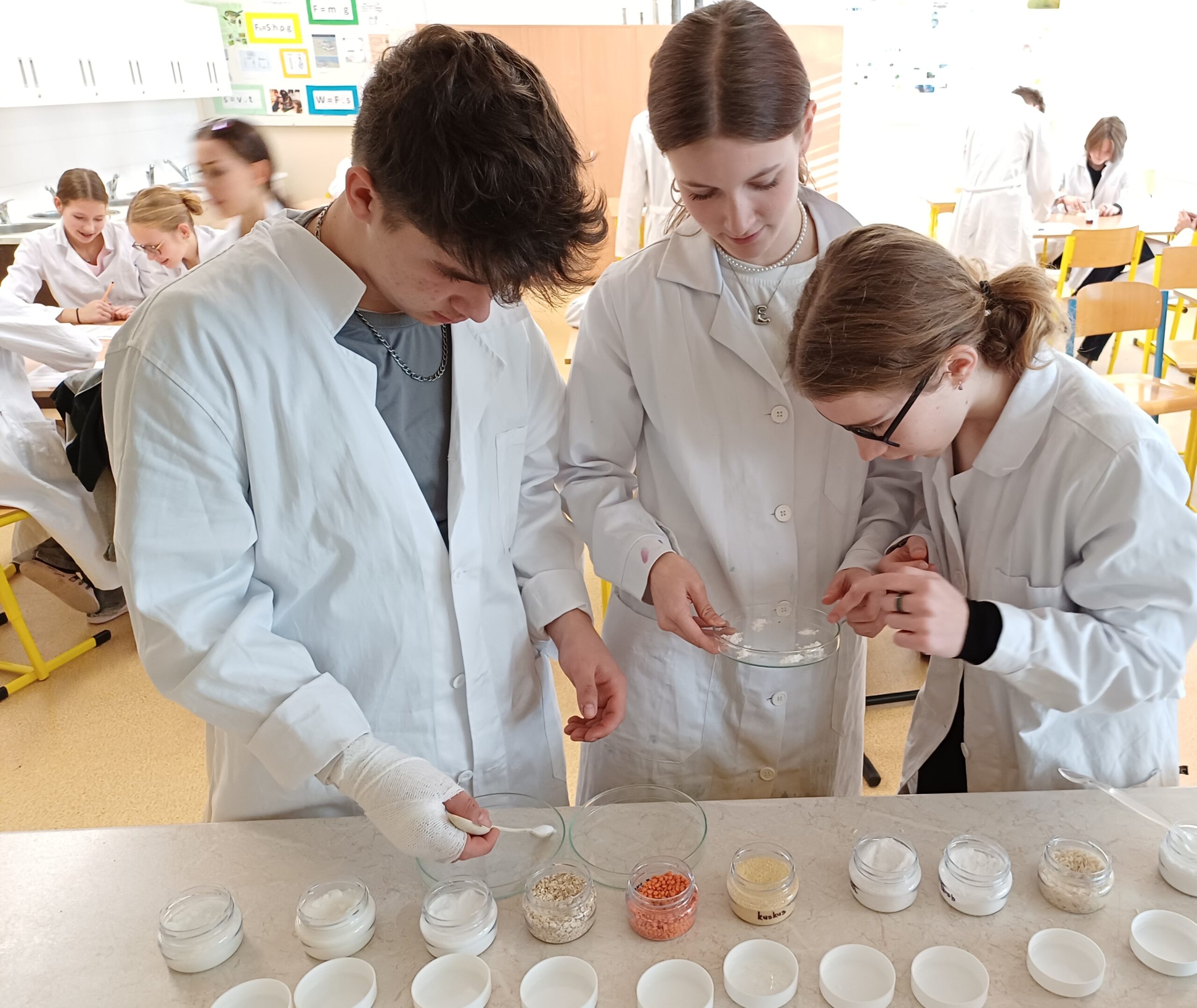 Žáci 9. ročníku si zahráli na vědce a zjišťovali, ve kterých nabízených potravinách je polysacharid škrob. Měli k dispozici tři činidla, z nichž jen jedno bylo důkazní. Součástí bádání bylo nejprve zjistit, které činidlo dokáže škrob odhalit. Poté provést kvalitativní analýzu nabízených vzorků potravin. Ty si volili podle svého zájmu.