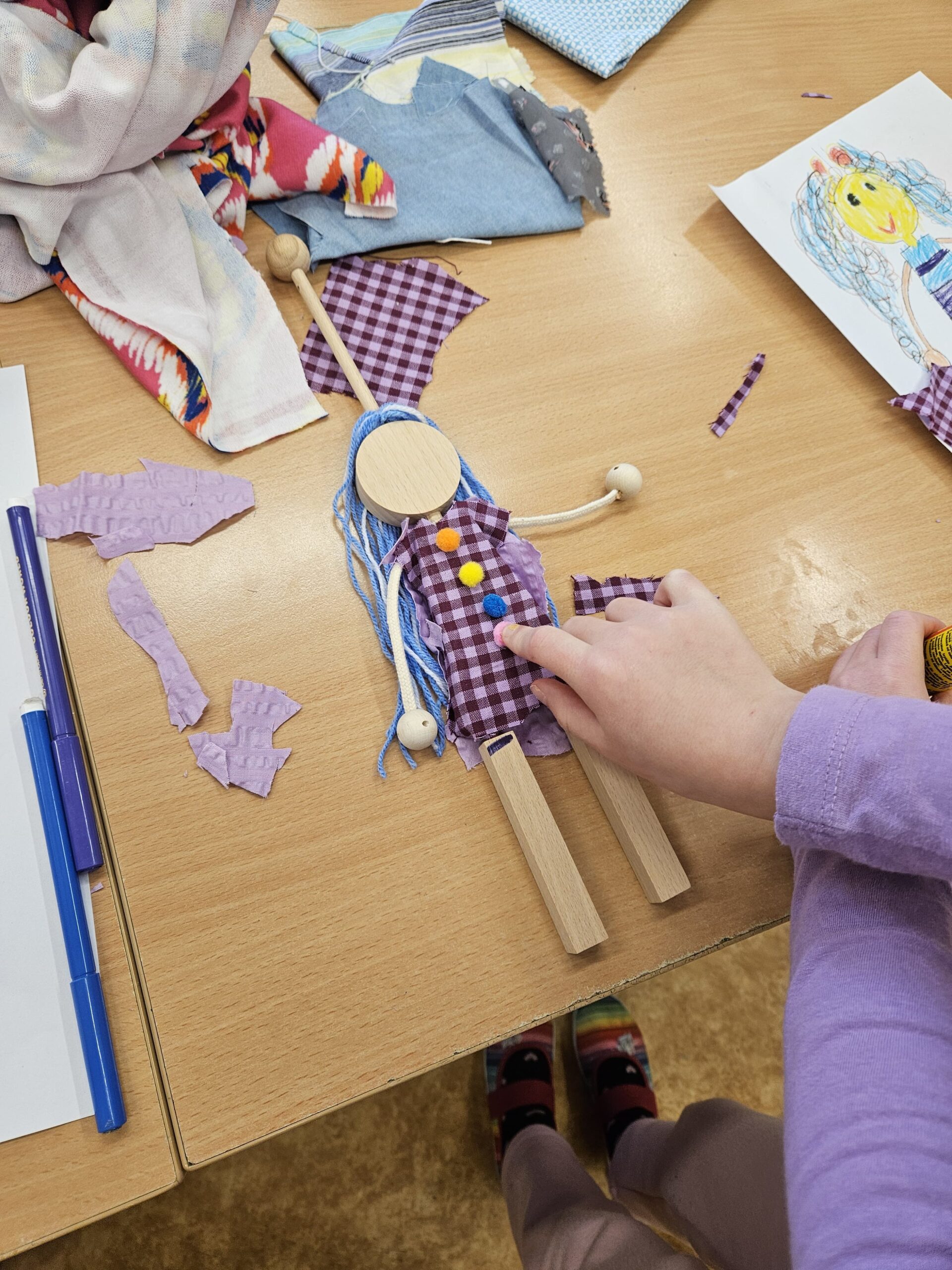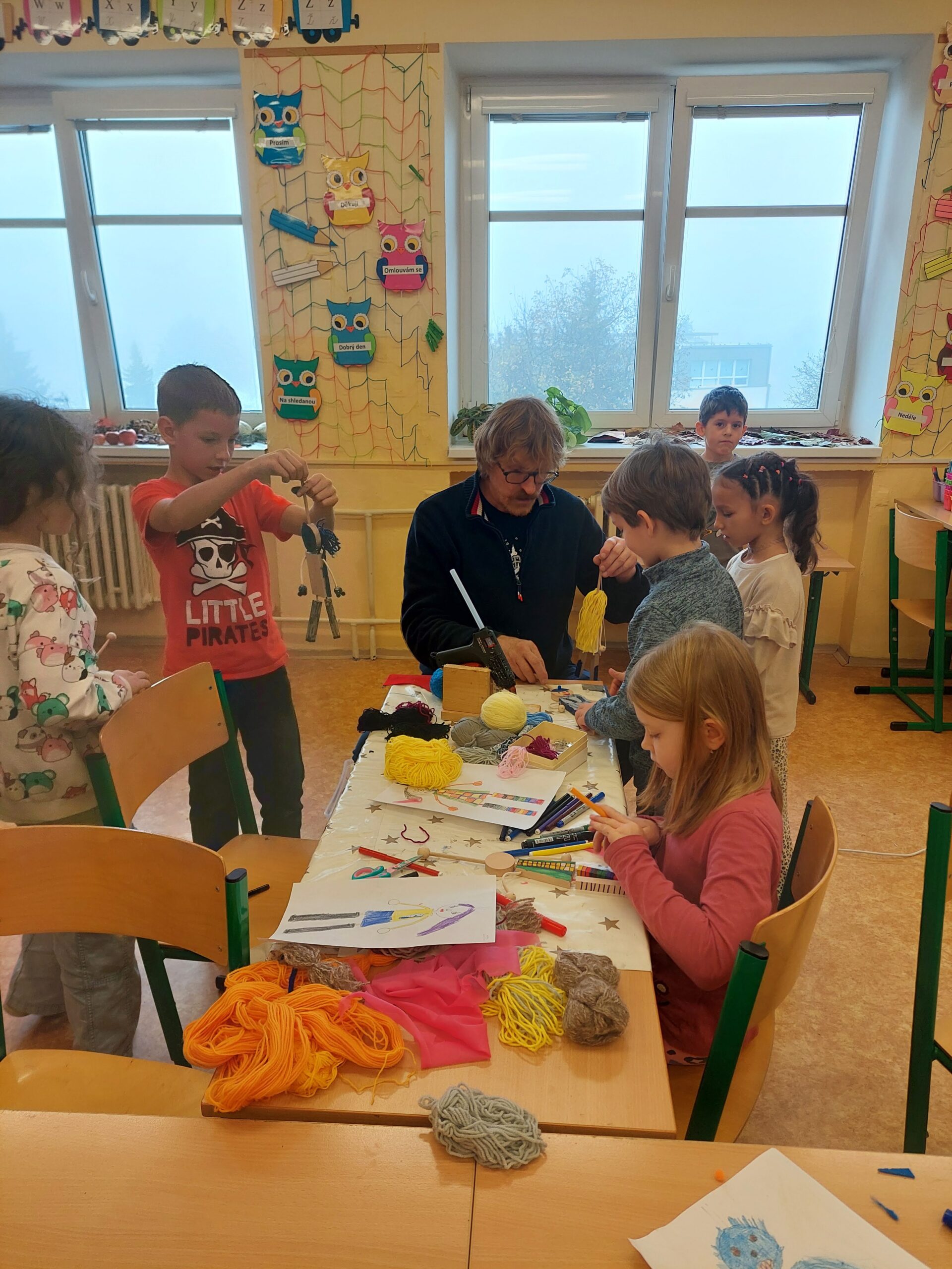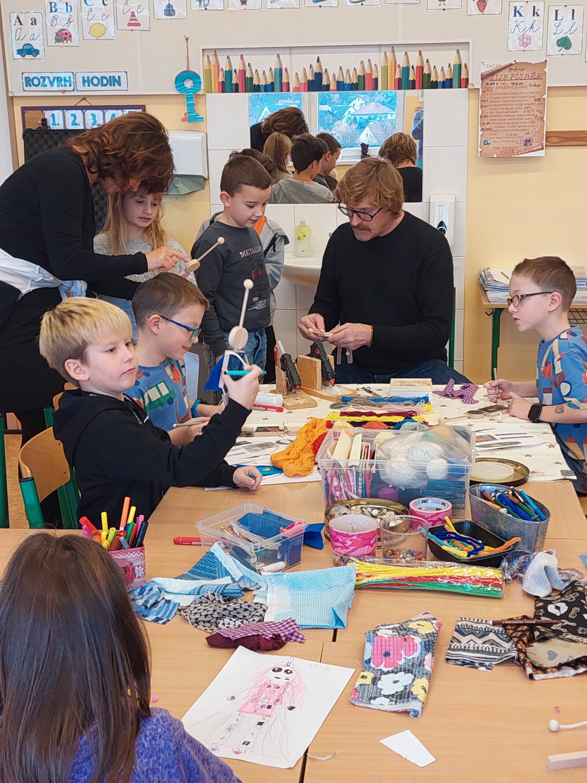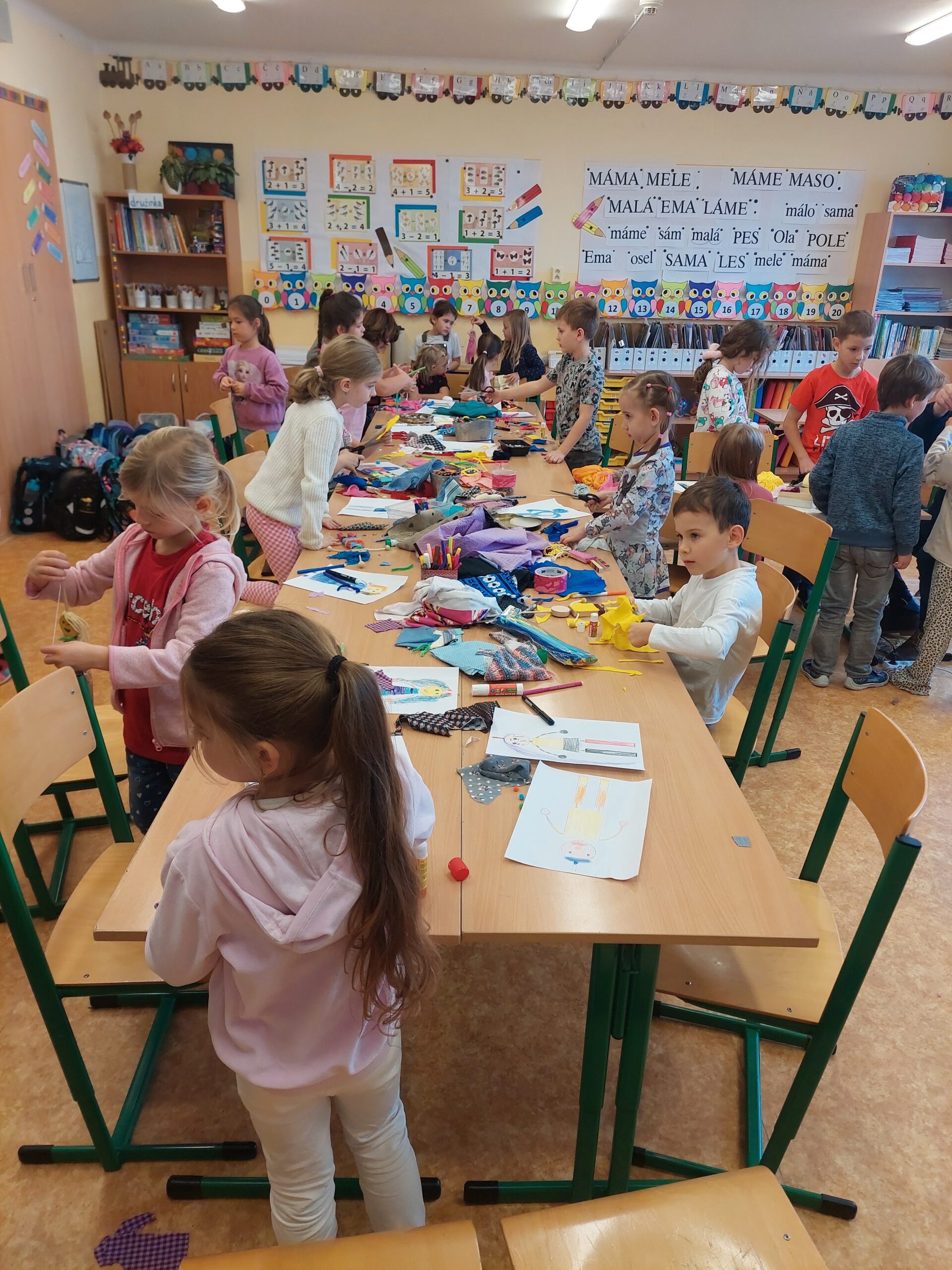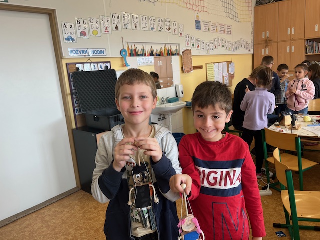 Pohádkou však radost dětí neskončila. Mohly si na chvíli vést loutku, ale hlavně si každý jednu svou loutku vyrobil a odnesl domů. Tvoření děti zcela pohltilo. Jen se podívejte na fotky. Uvidíte, jak se jim to povedlo!