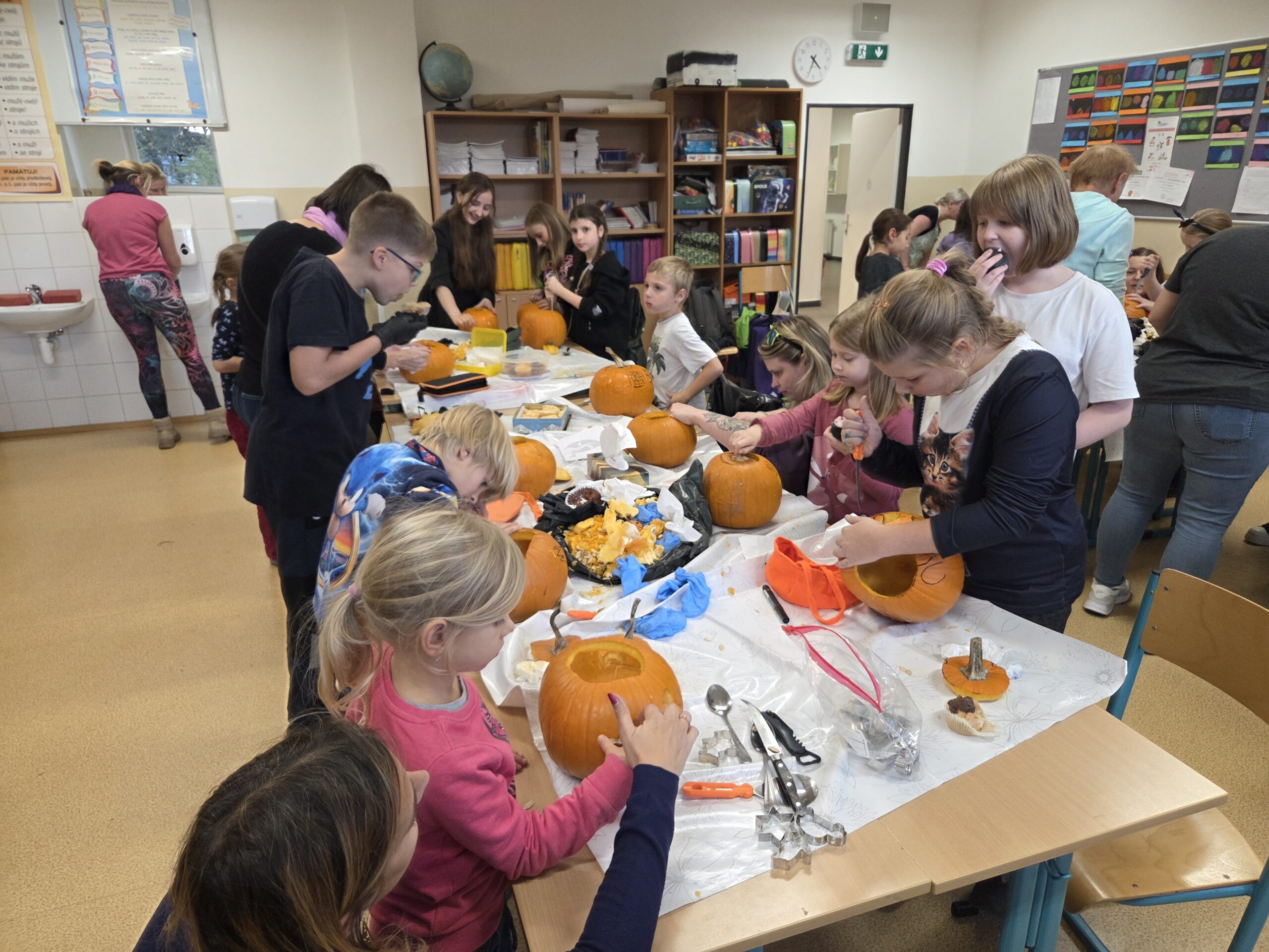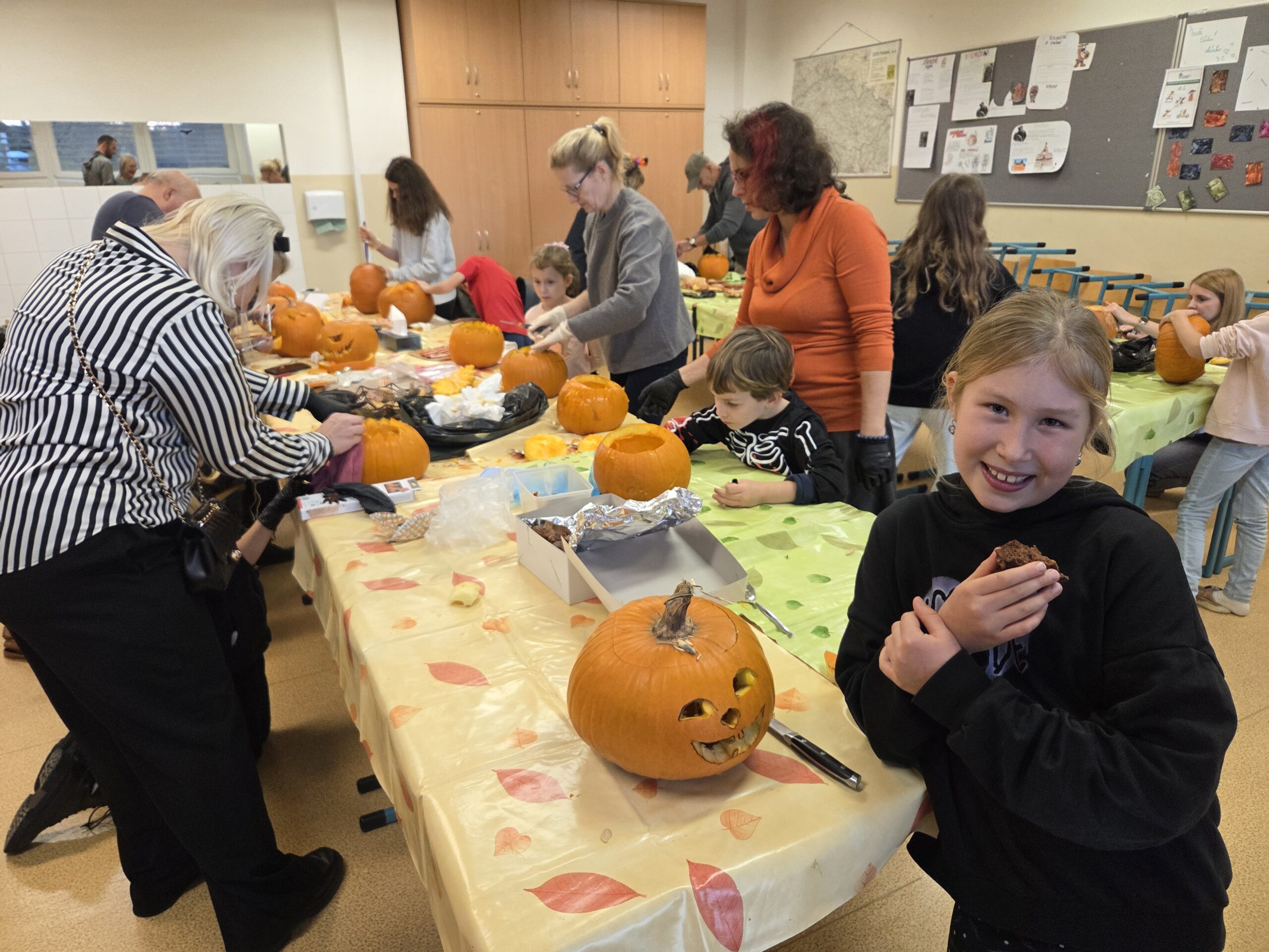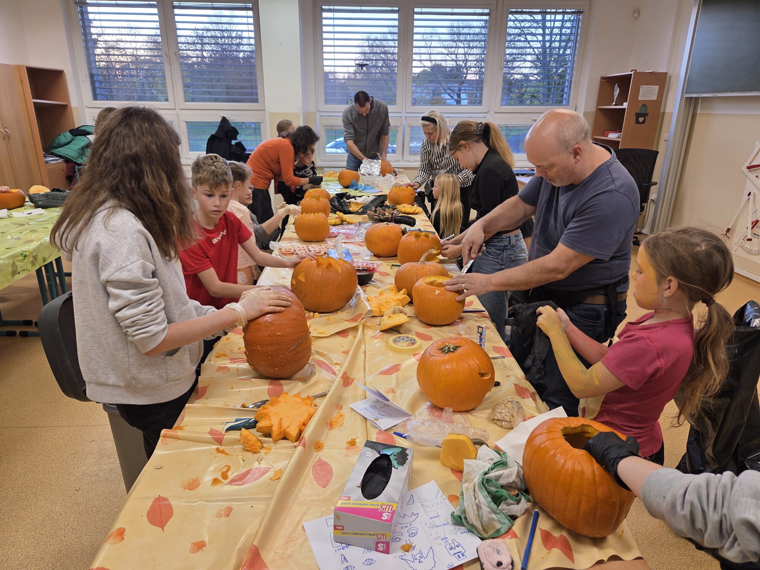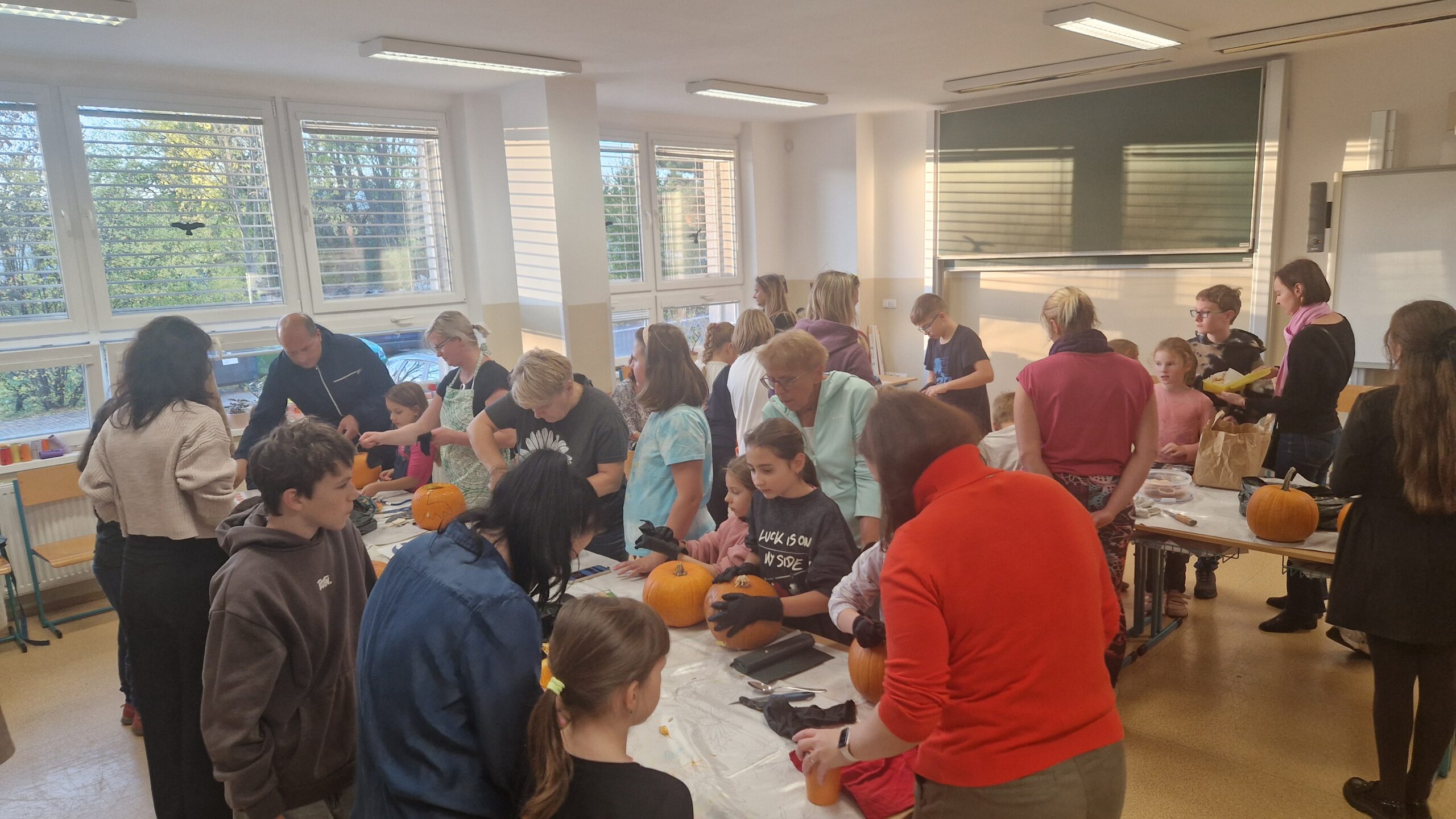 Hlavními aktéry byli samozřejmě žáci, především z 1. stupně, kteří s velkým nadšením přetvářeli dýně v originální a strašidelné lucerny. Bylo radost sledovat jejich kreativitu a soustředěnou práci. Akce se letos vyznačovala mimořádnou účastí celých rodin. Přišly maminky, tatínkové, sourozenci i prarodiče. Zaznamenali jsme, že se do samotného vyřezávání a dlabání dýní zapojilo neobvykle velké množství tatínků, kteří svým dětem obětavě pomáhali s náročnějšími částmi, a tím přispěli k hladkému průběhu akce.