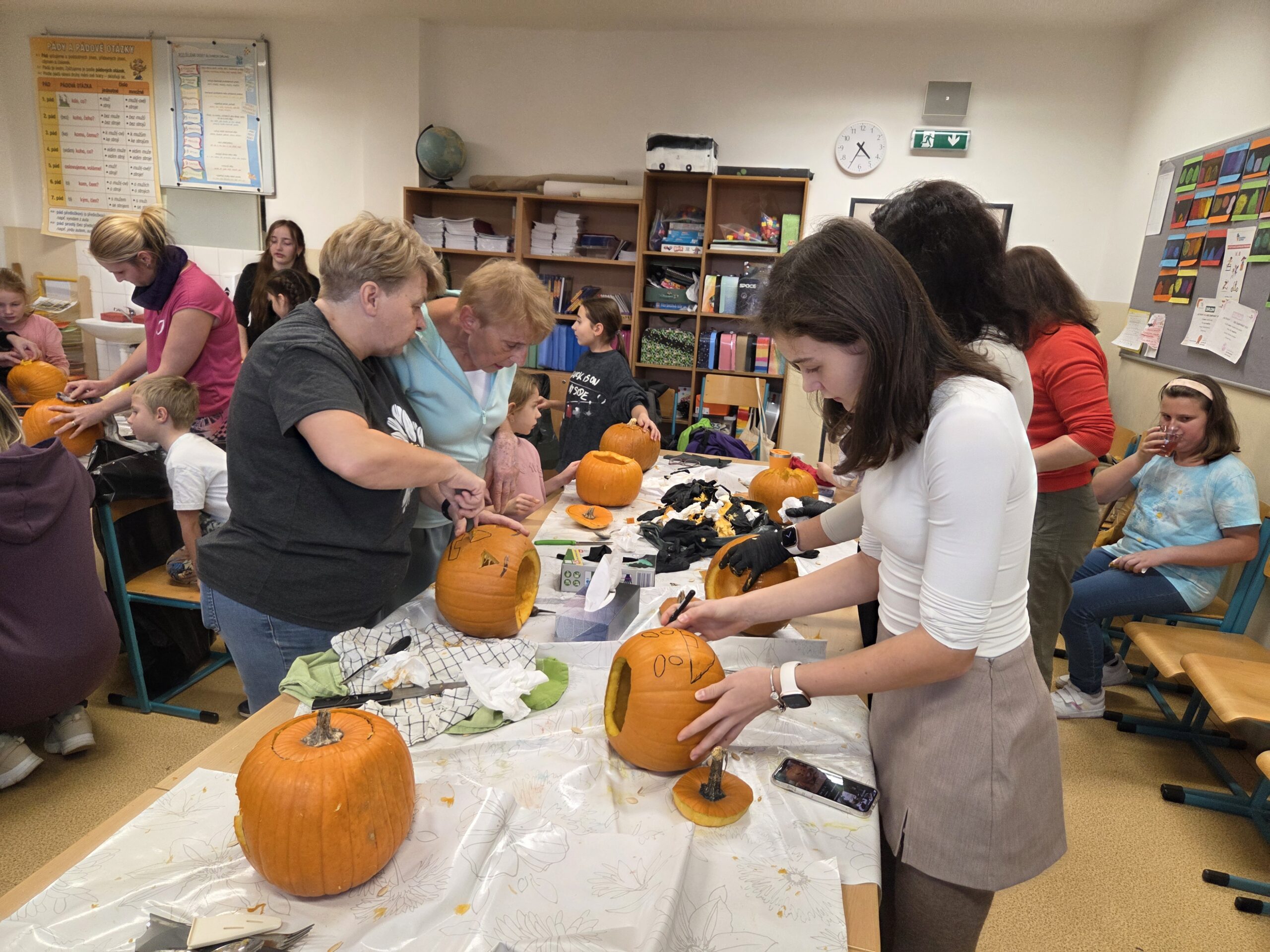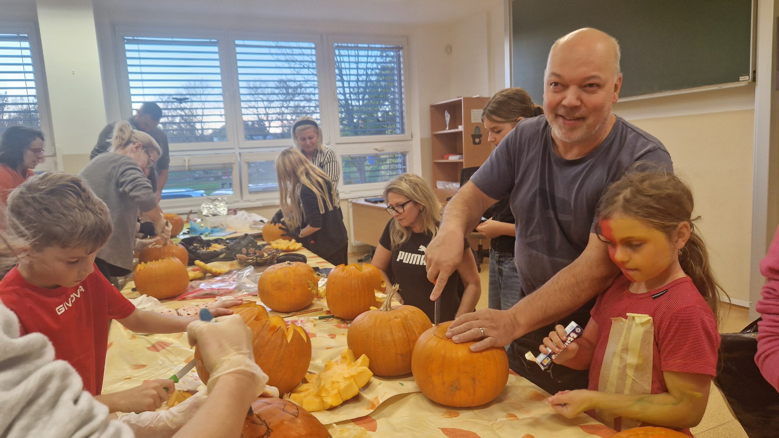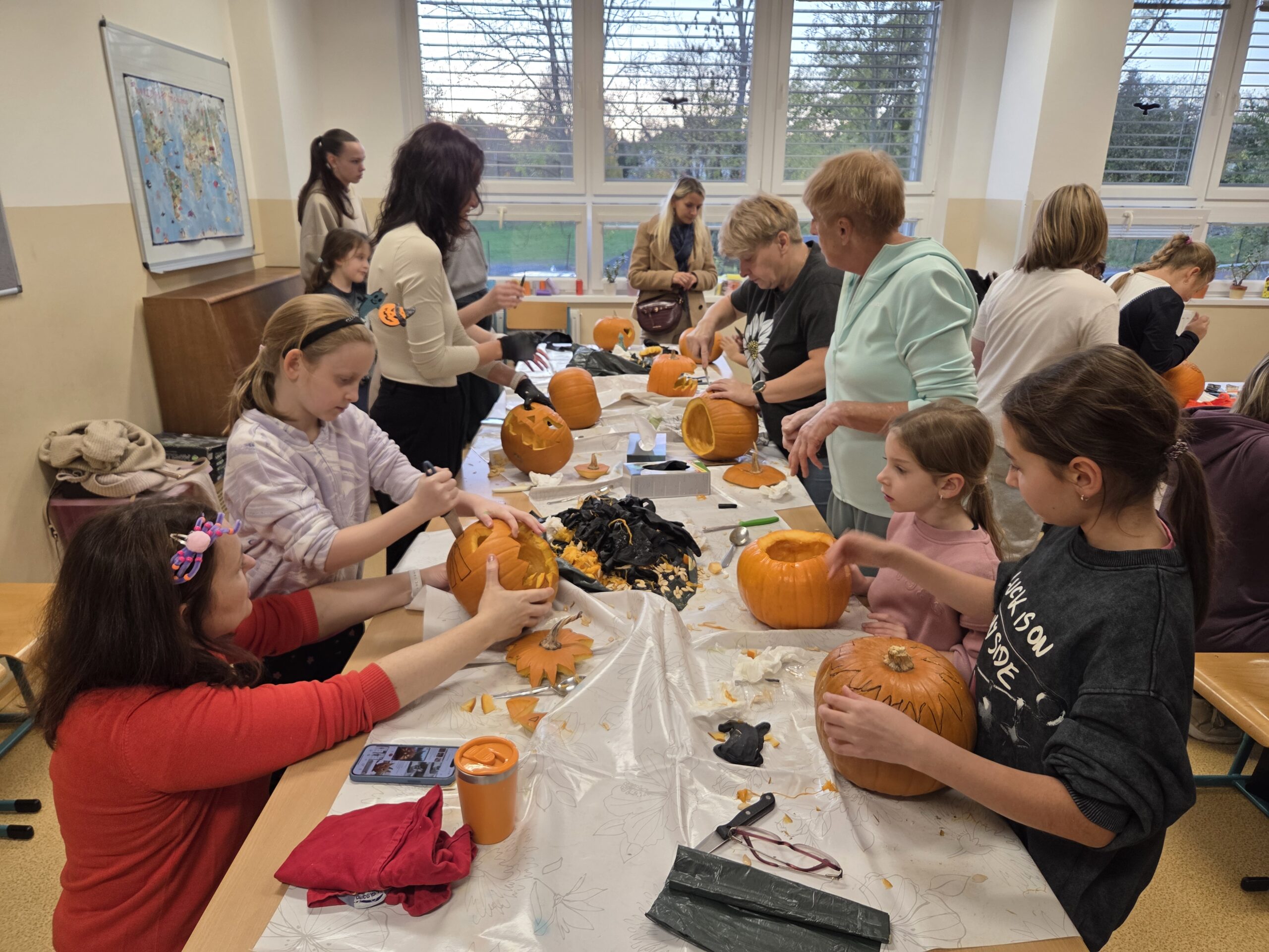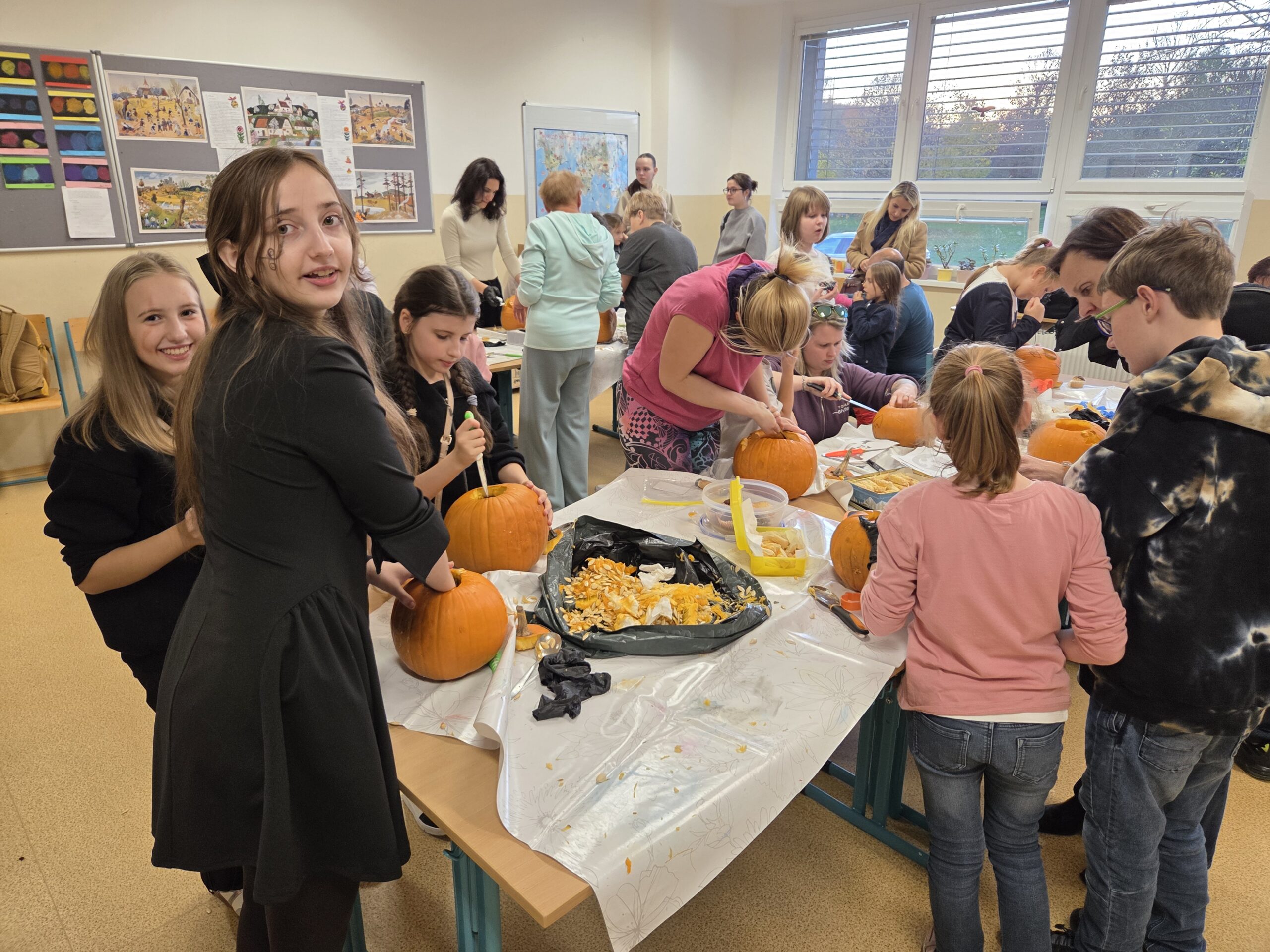 Hlavními aktéry byli samozřejmě žáci, především z 1. stupně, kteří s velkým nadšením přetvářeli dýně v originální a strašidelné lucerny. Bylo radost sledovat jejich kreativitu a soustředěnou práci. Akce se letos vyznačovala mimořádnou účastí celých rodin. Přišly maminky, tatínkové, sourozenci i prarodiče. Zaznamenali jsme, že se do samotného vyřezávání a dlabání dýní zapojilo neobvykle velké množství tatínků, kteří svým dětem obětavě pomáhali s náročnějšími částmi, a tím přispěli k hladkému průběhu akce.