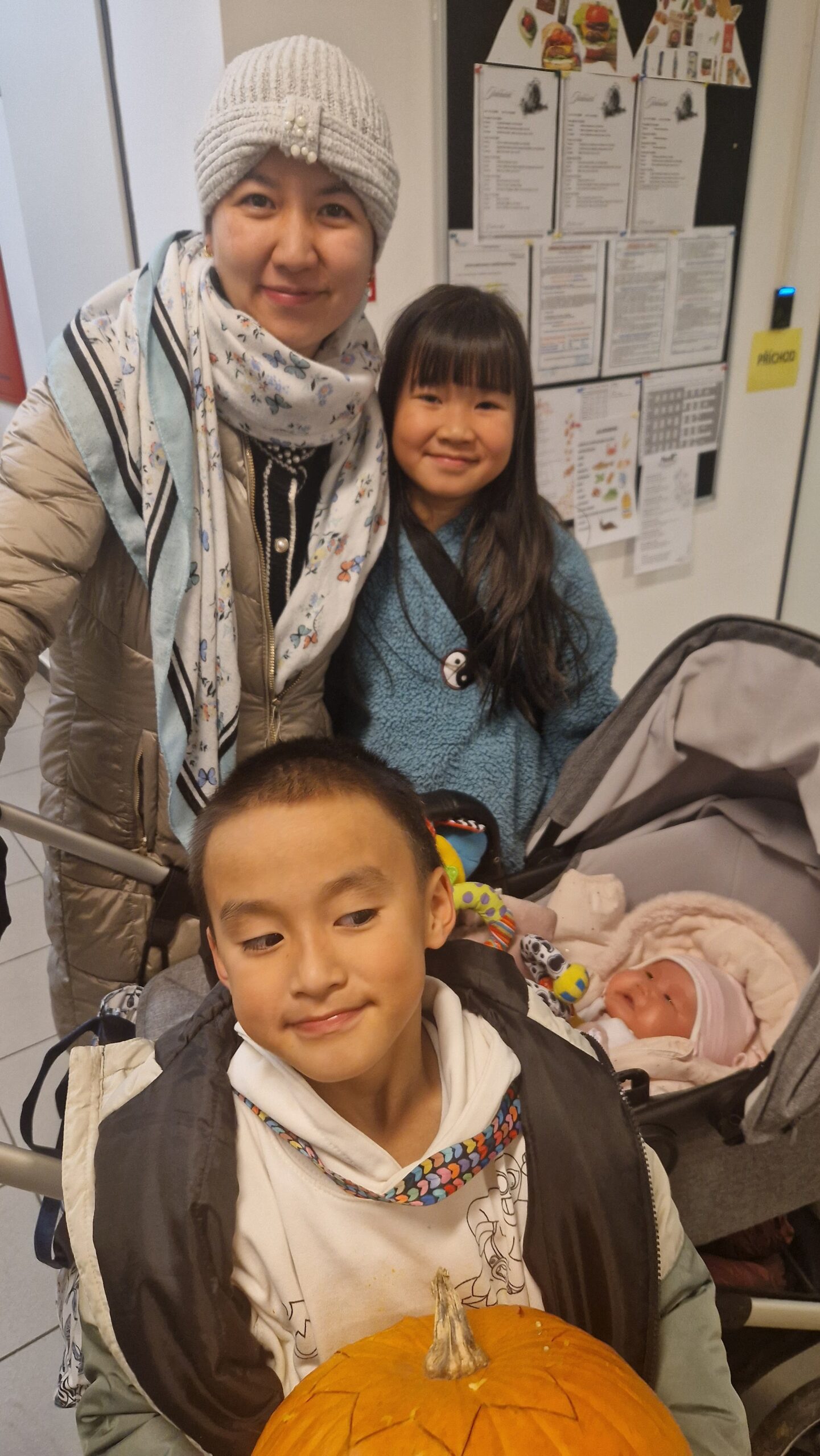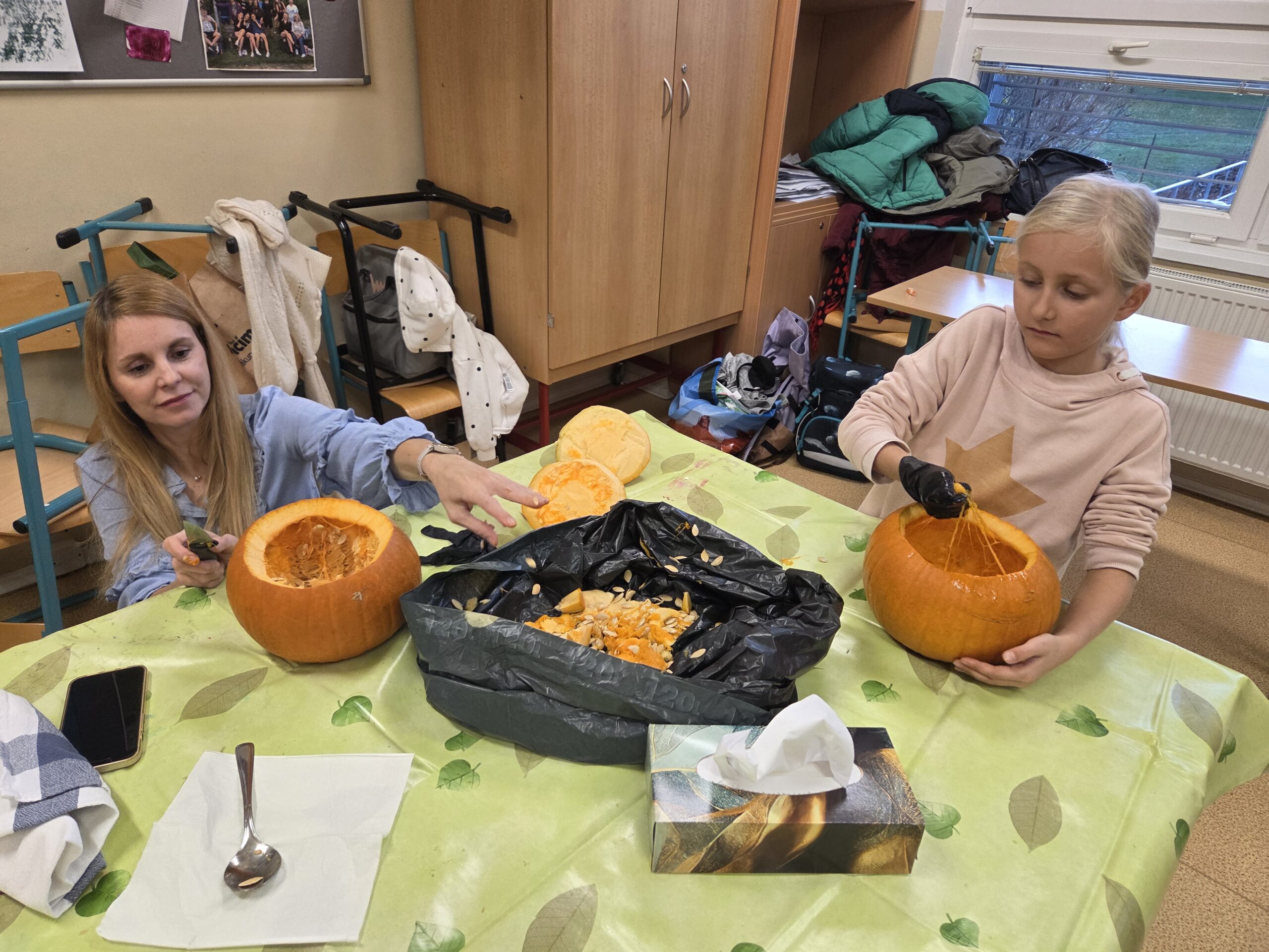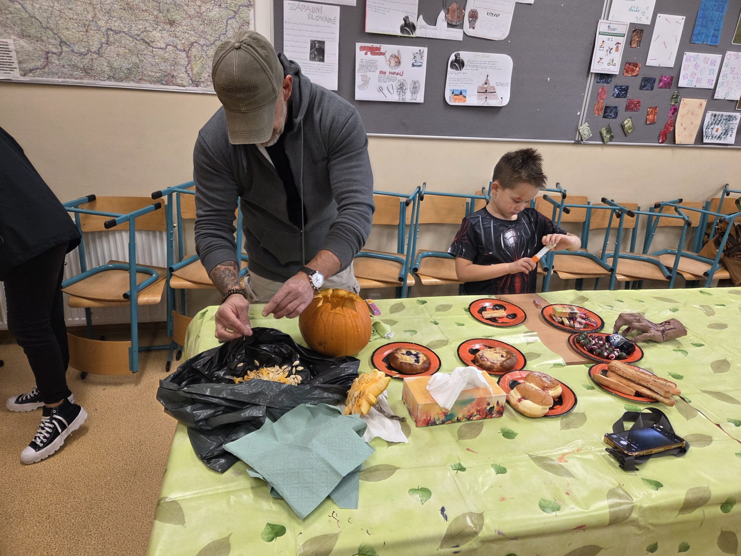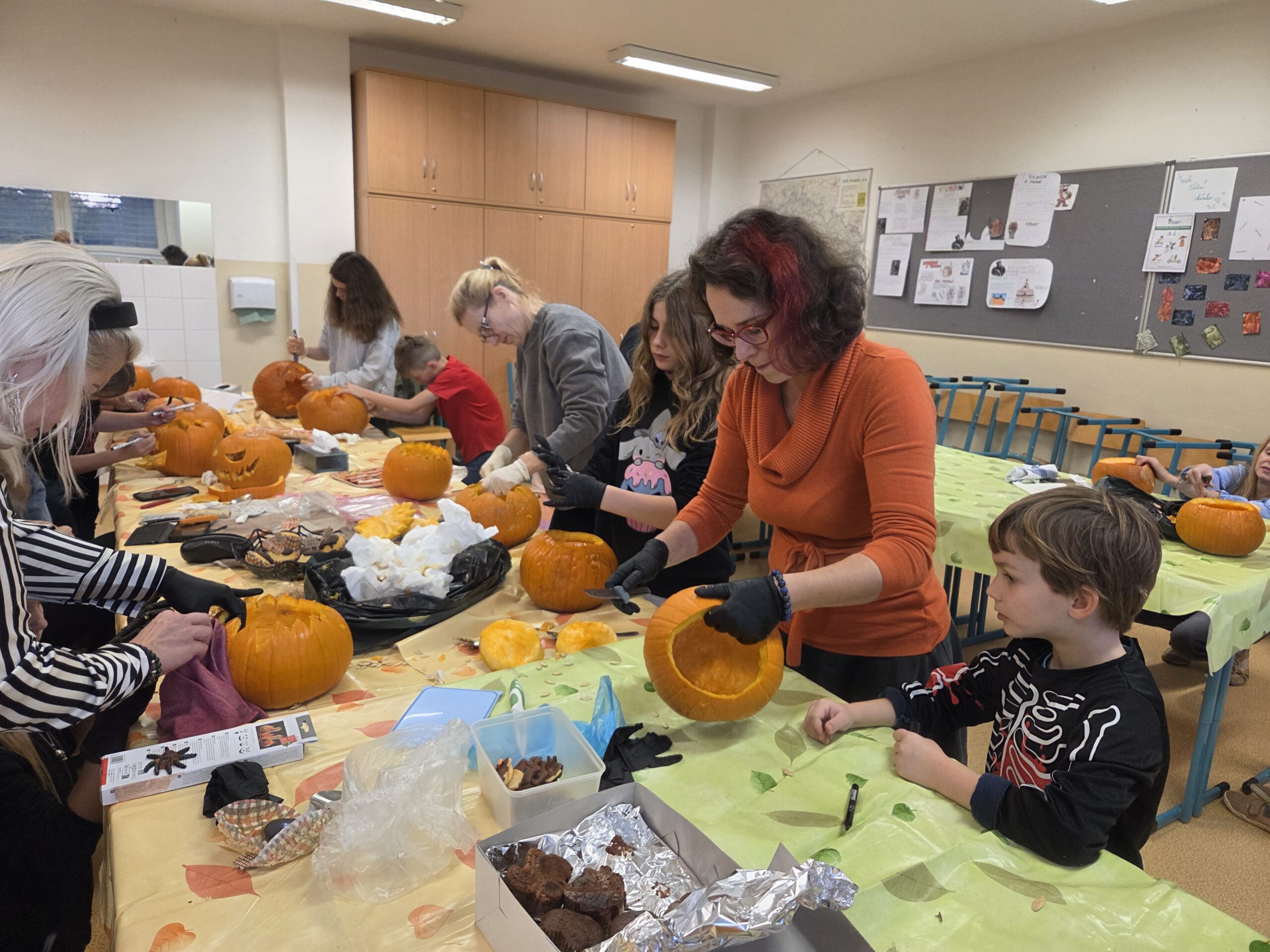 Zatímco u stolů panovala čilá pracovní atmosféra s dýňovou dužinou všude kolem, o druhou, neméně důležitou část akce se postaraly maminky. Přinesly s sebou bohatou nabídku domácích muffinů, koláčů, sušenek a jiných dobrot, které skvěle doplnily podzimní odpoledne a posloužily k zaslouženému občerstvení.