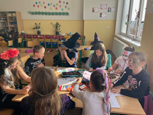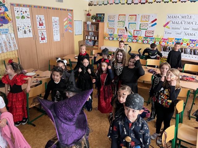 V pátek 31. 10. si  žáci v 1. třídě zpestřili vyučování tématem Halloweenu. Ráno se všichni sešli v kostýmech ve vyzdobené třídě a mohlo se začít.