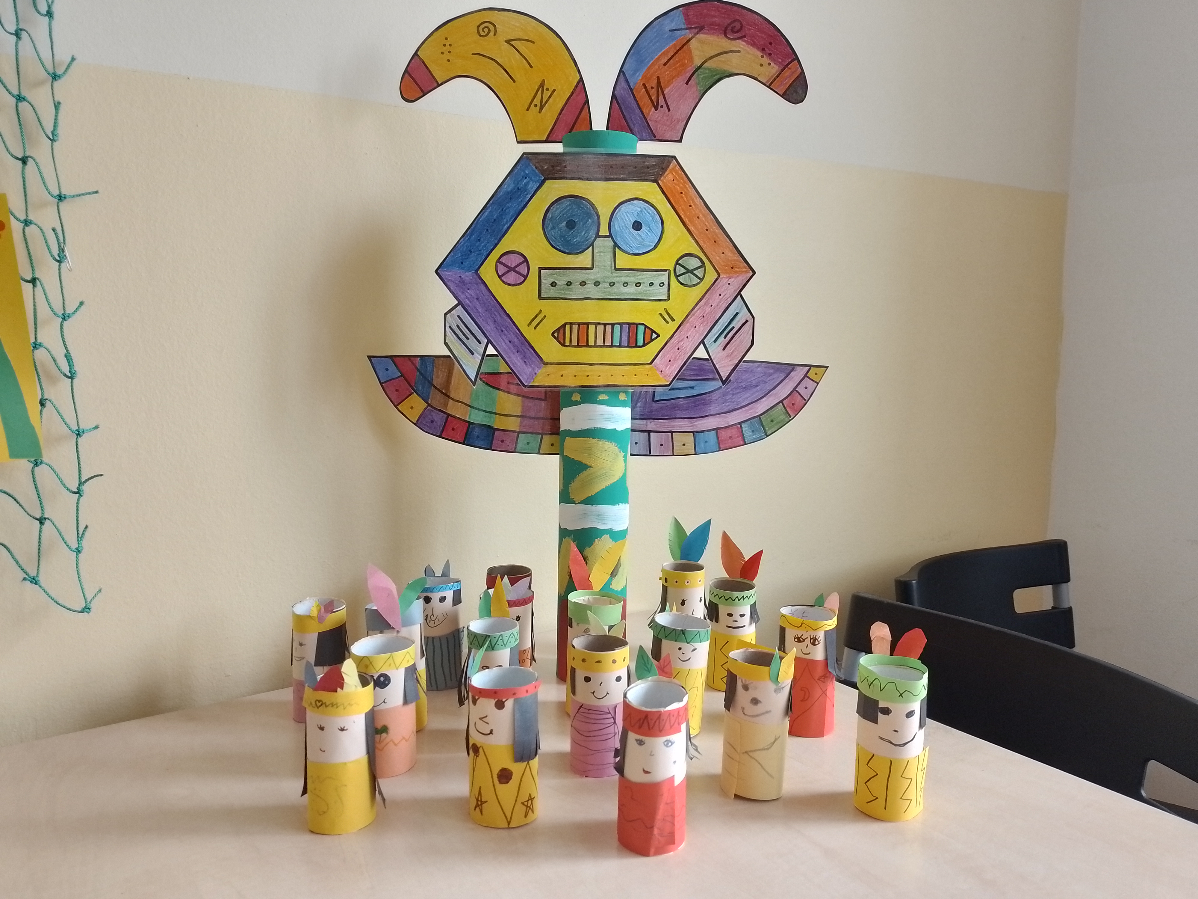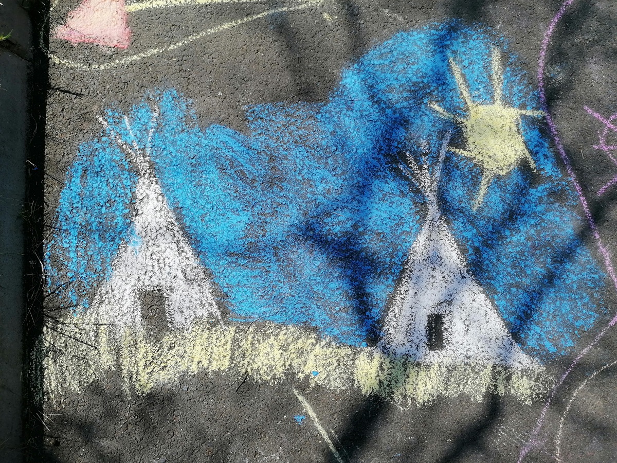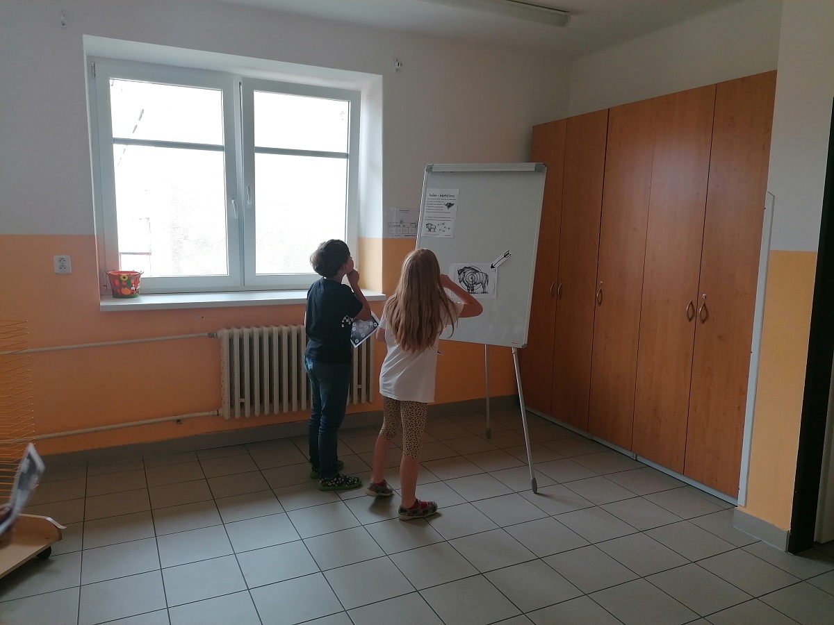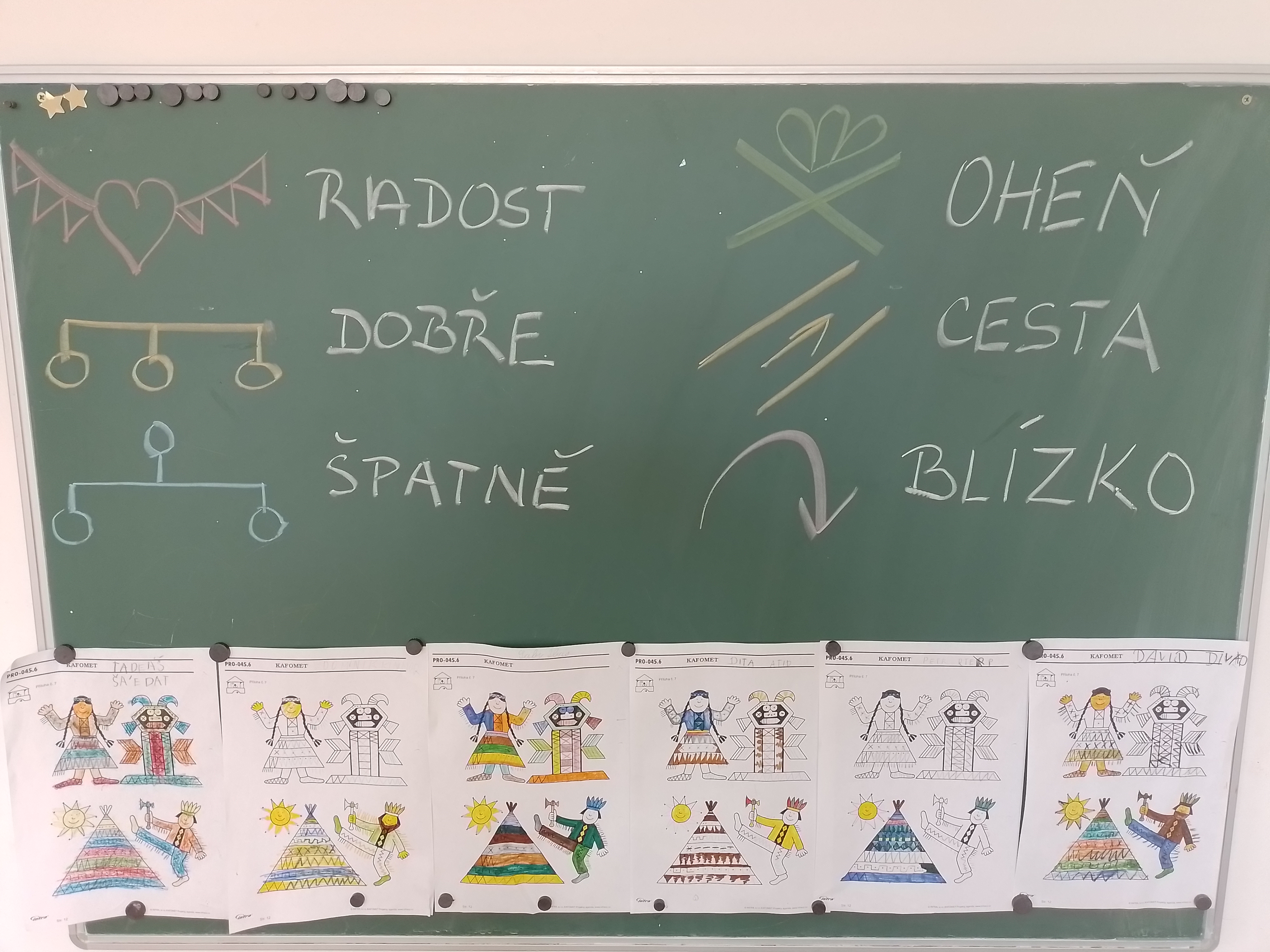 Květen je pro nás indiánský měsíc – vyprávěli jsme si o Indiánech, tvořili spolu indiánské písmo, každý si podle svých vlastností zkusil vymyslet indiánské jméno – takže tu máme např. Bystrého kapra, Normální kuře, Rychlého králíka apod.