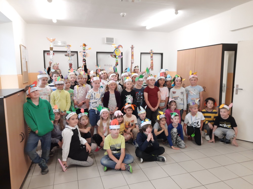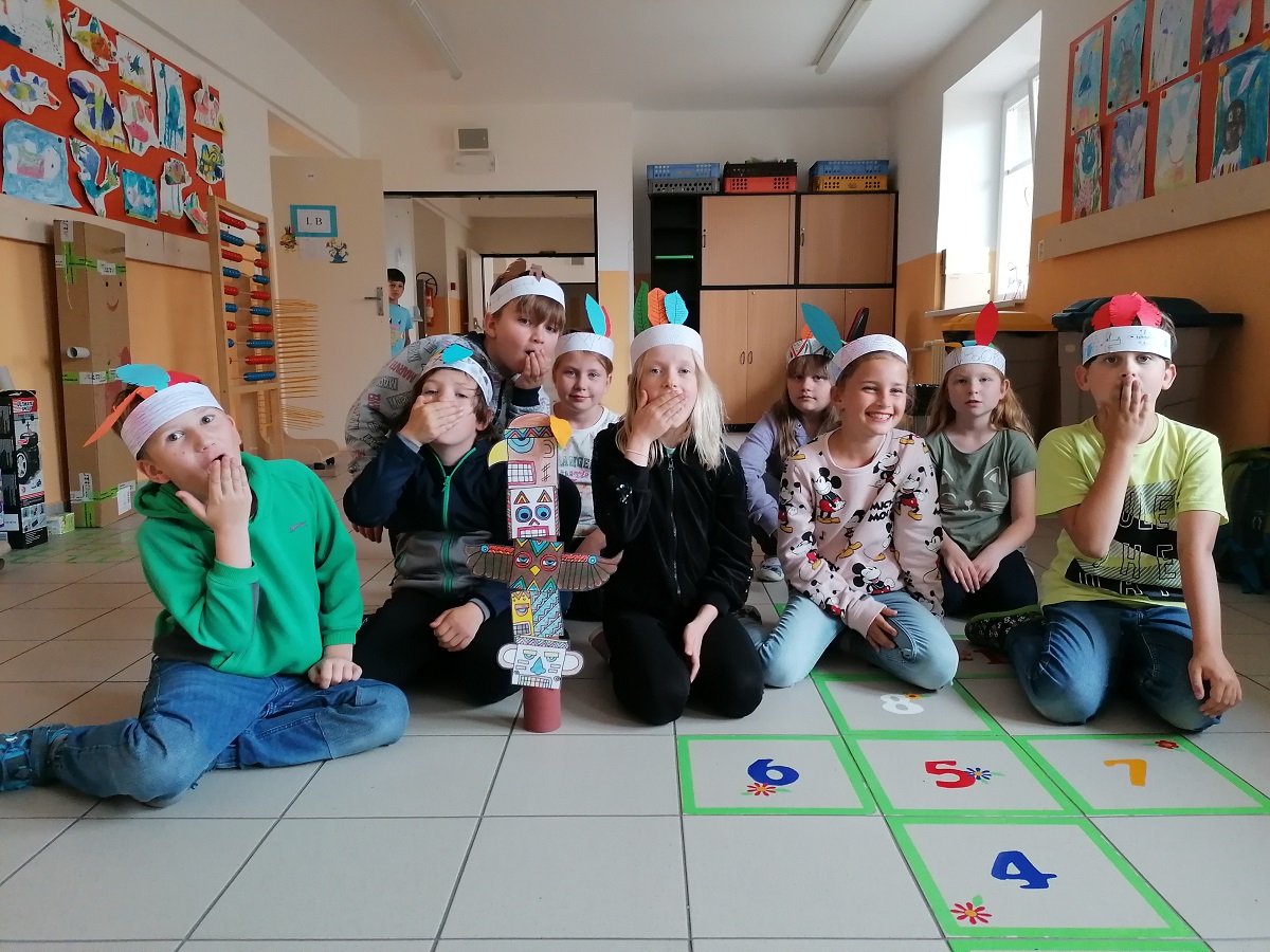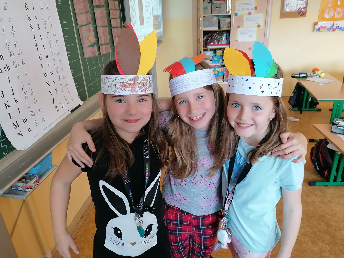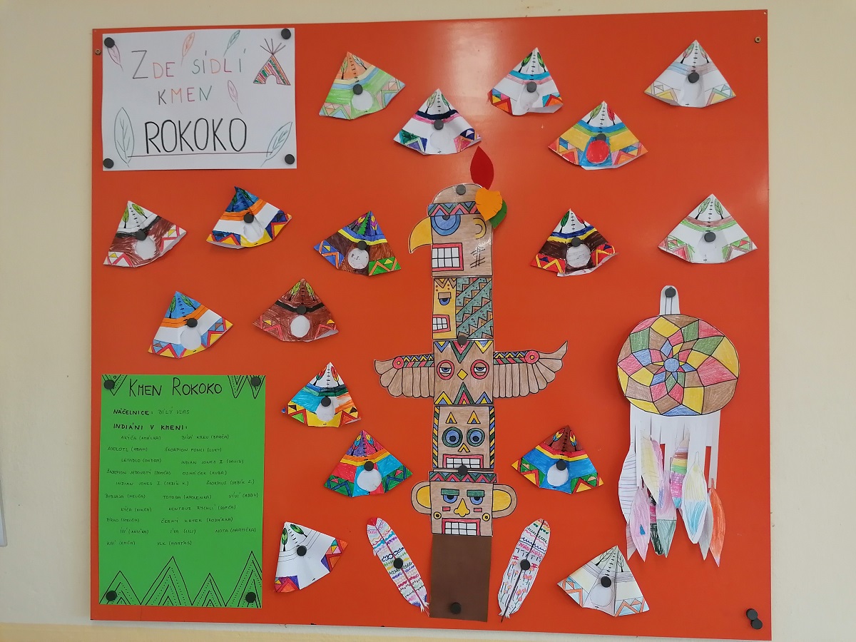 Pro náš „Kmen bystrých orlů“ jsme vytvořili vlastní totem, šifrovali si navzájem úkoly naším písmem, vyráběli krásné čelenky a zdobili je různobarevným peřím, kde každá barva znamená nějakou specifickou vlastnost – každý podle toho, jak sám sebe vnímá. Měsíc zakončíme indiánským pětibojem.