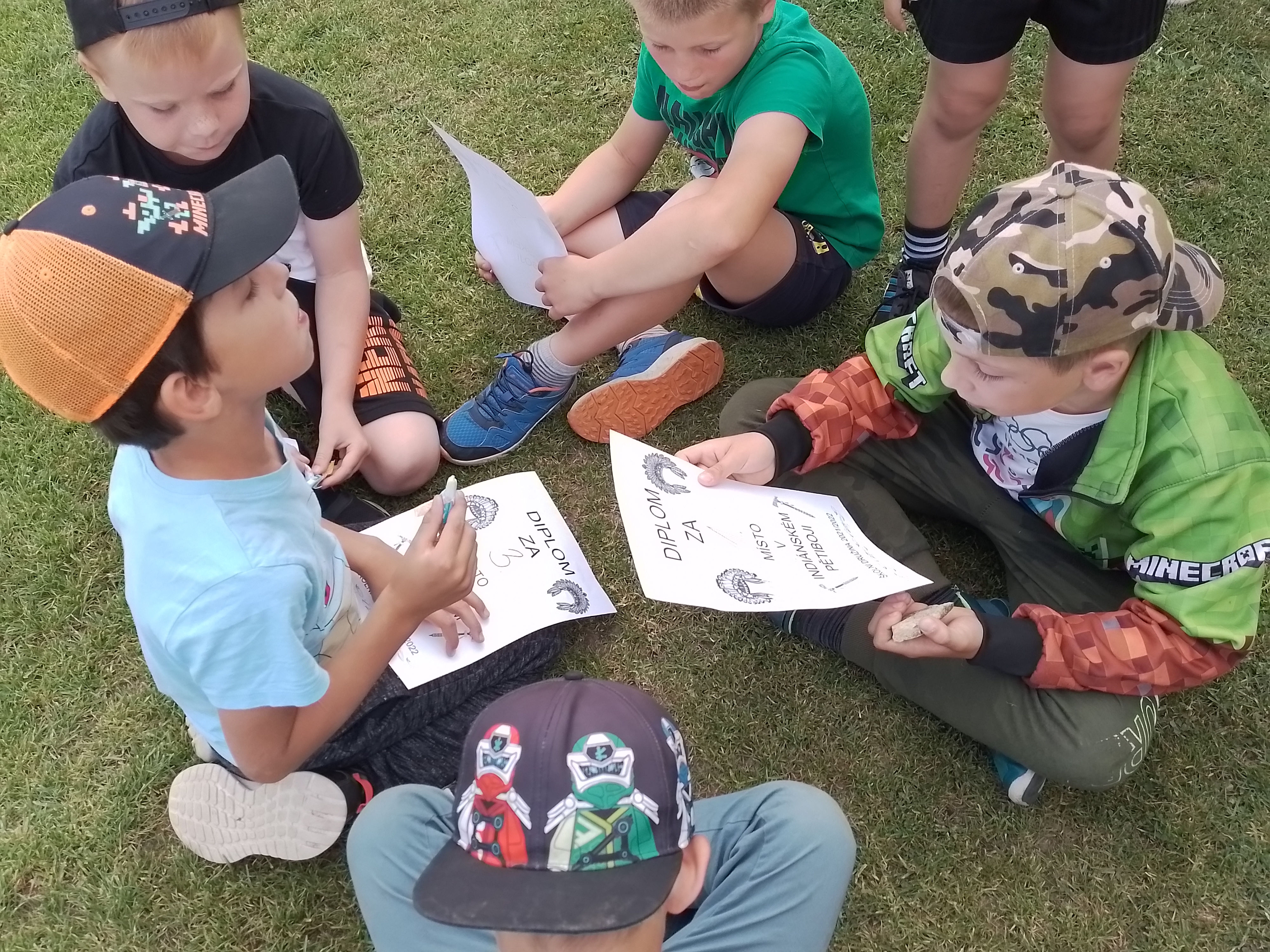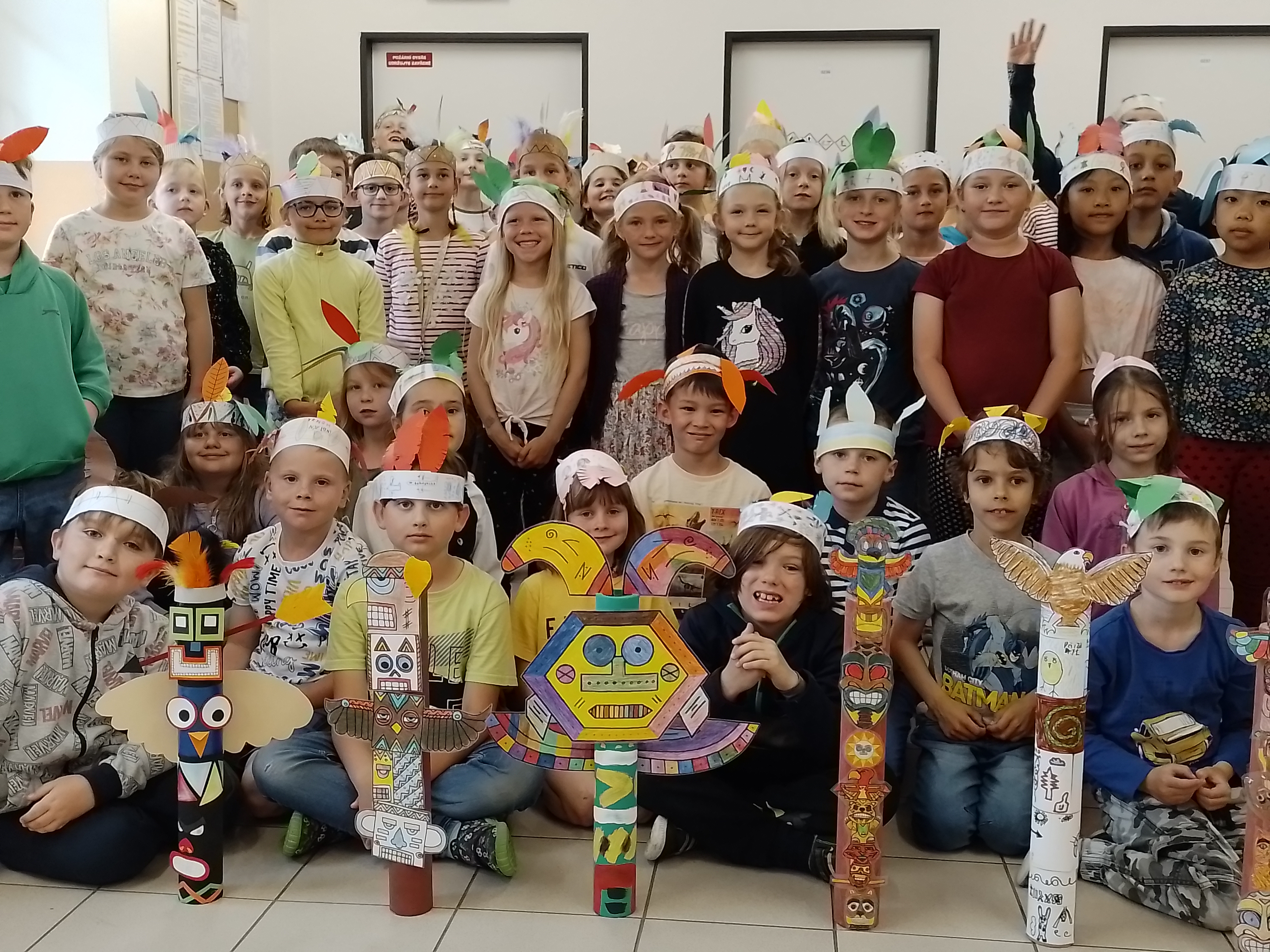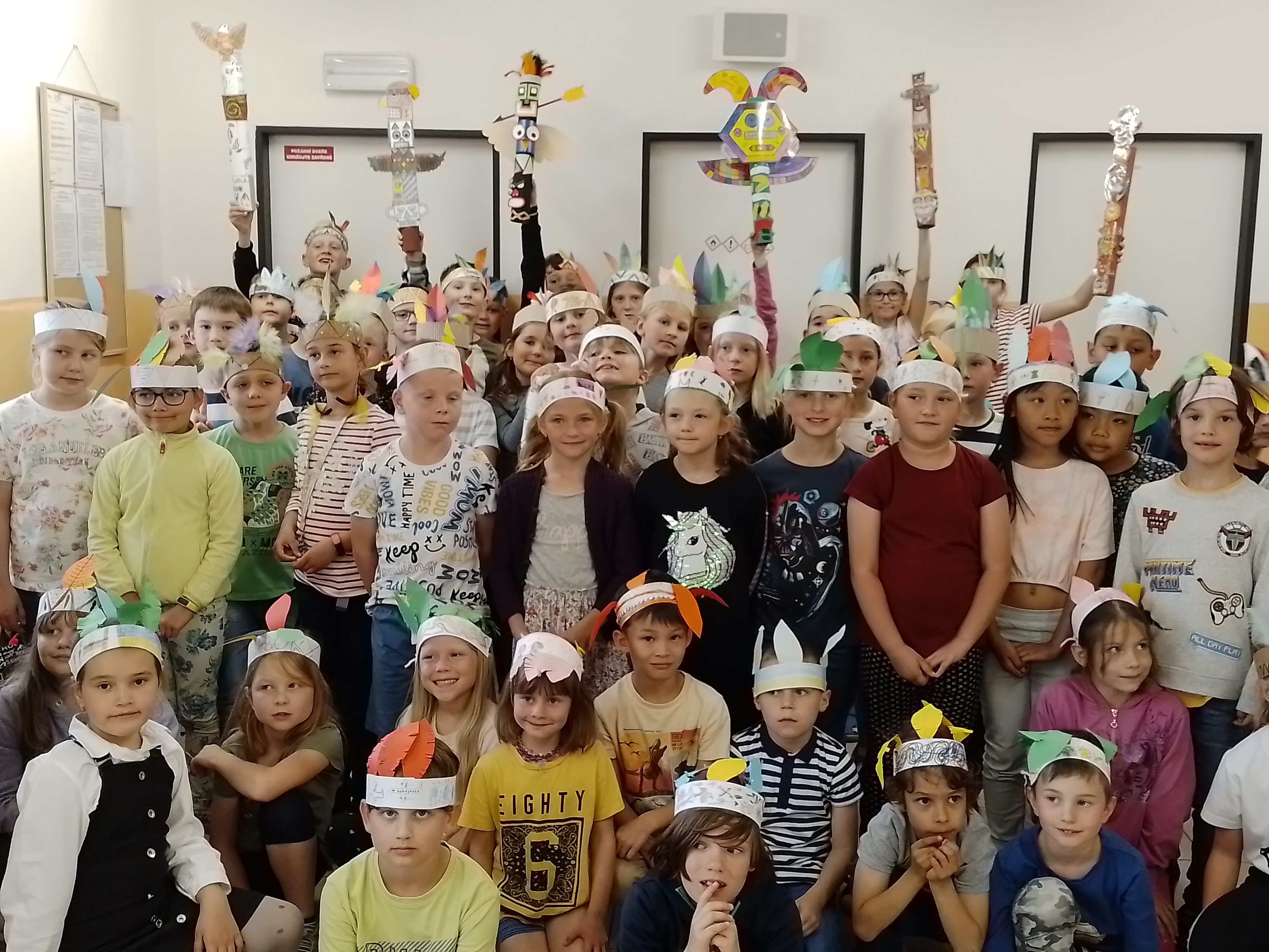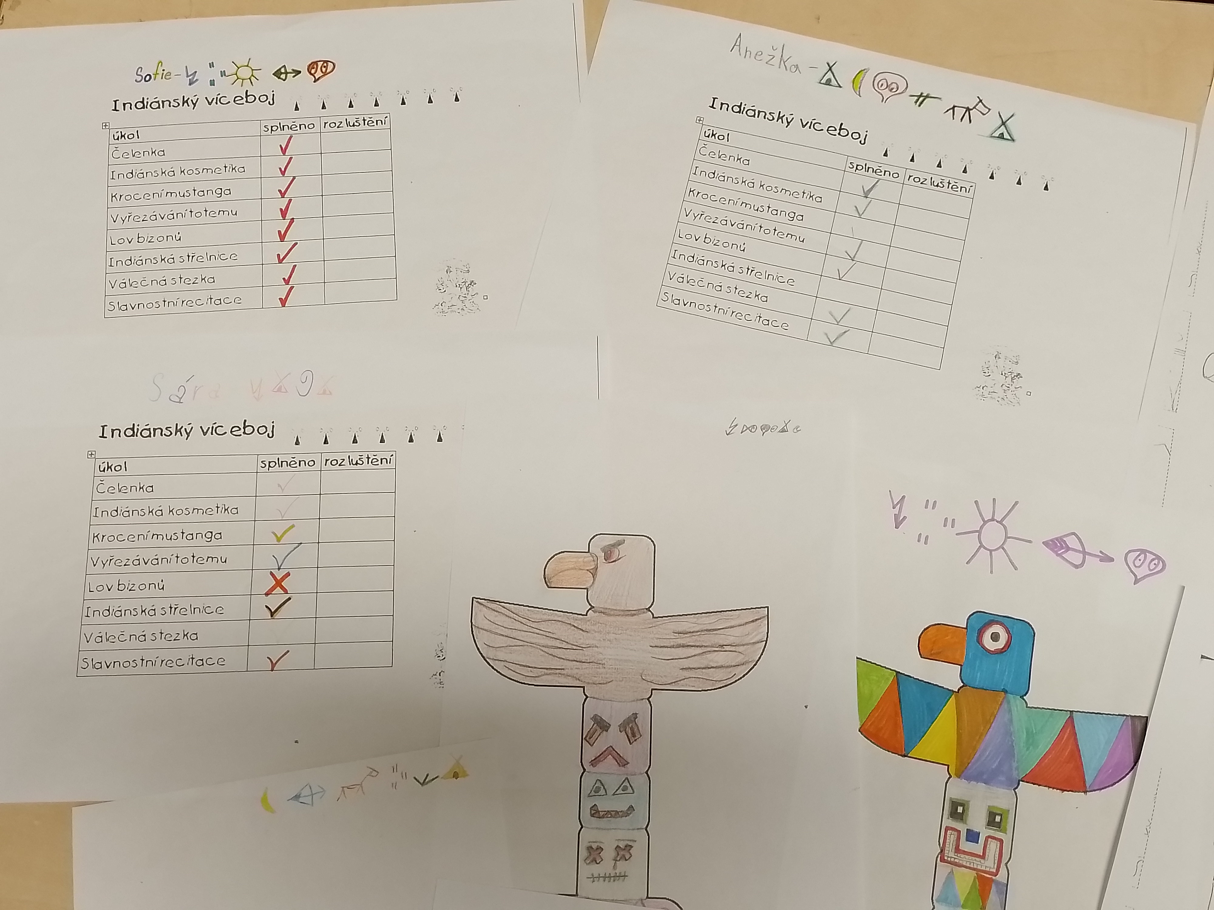 Pro náš „Kmen bystrých orlů“ jsme vytvořili vlastní totem, šifrovali si navzájem úkoly naším písmem, vyráběli krásné čelenky a zdobili je různobarevným peřím, kde každá barva znamená nějakou specifickou vlastnost – každý podle toho, jak sám sebe vnímá. Měsíc zakončíme indiánským pětibojem.