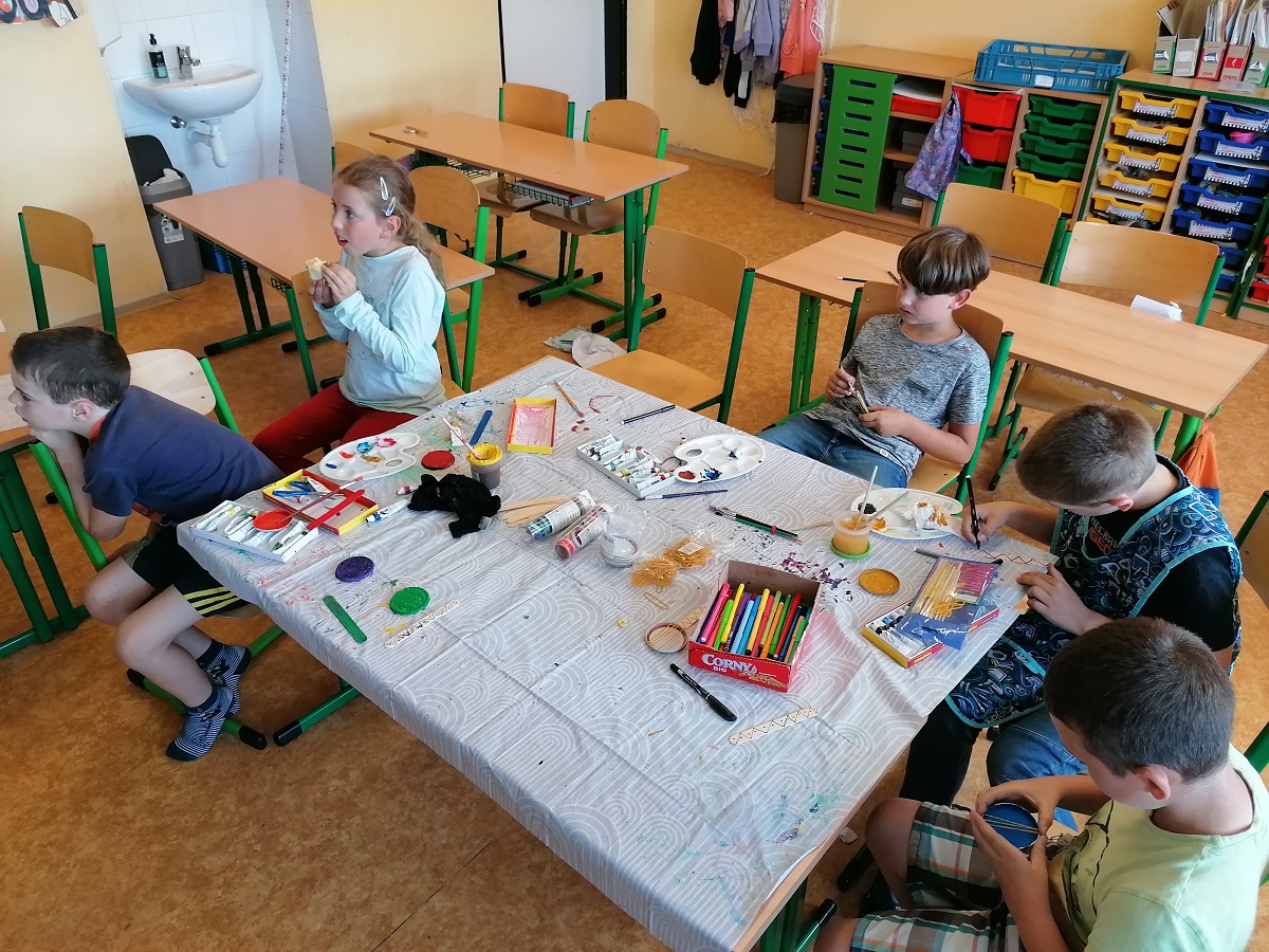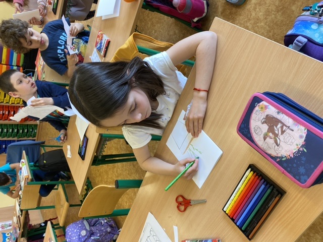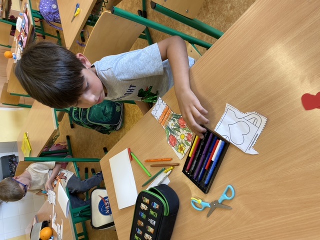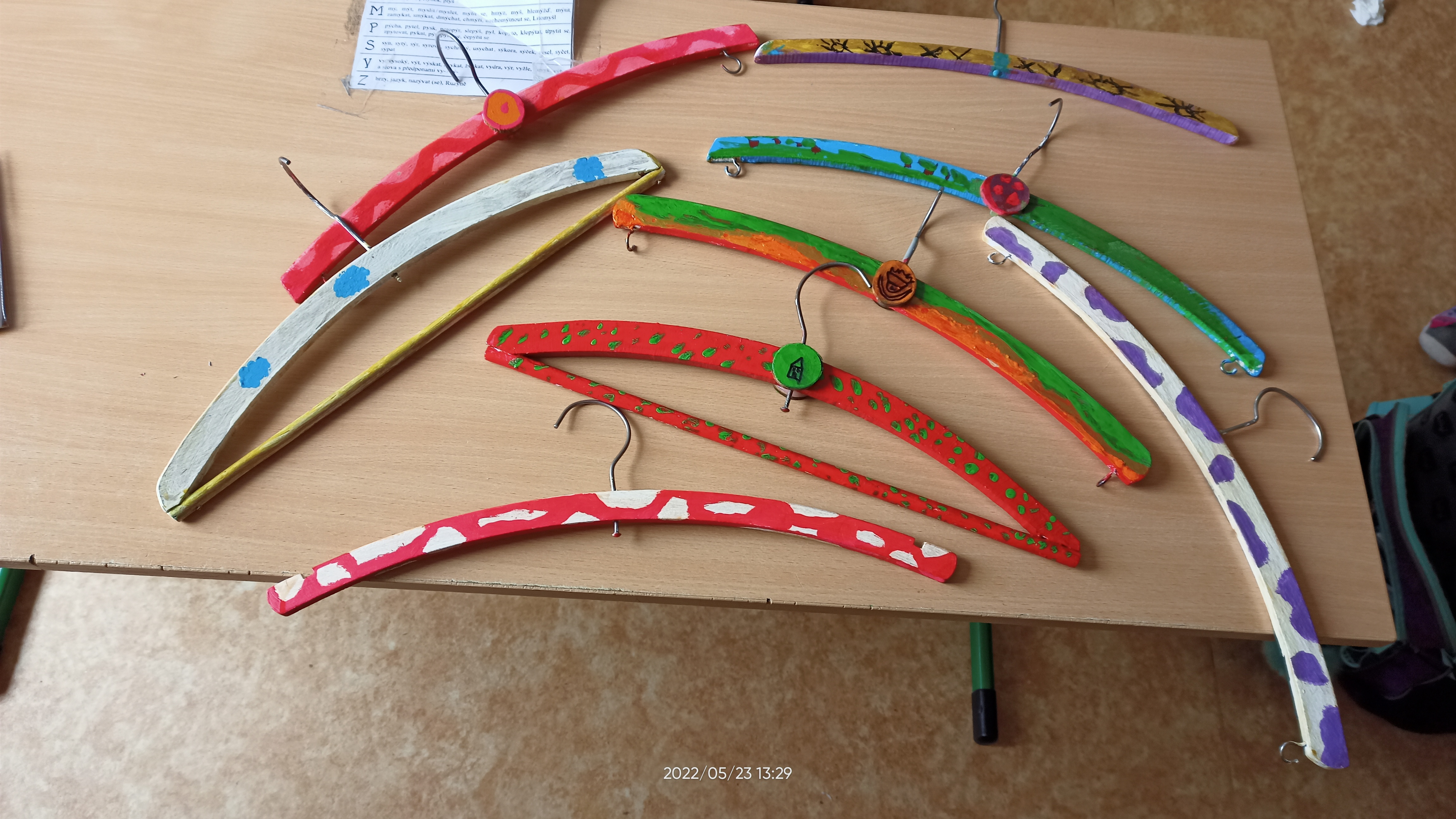 Když nám počasí nepřeje, také trochu vyrábíme – třeba maminkám přáníčko. Pokusili jsme se také dát starým dřevěným ramínkům na oblečení druhou šanci – každý ho pomaloval a přizdobil podle svého vkusu.