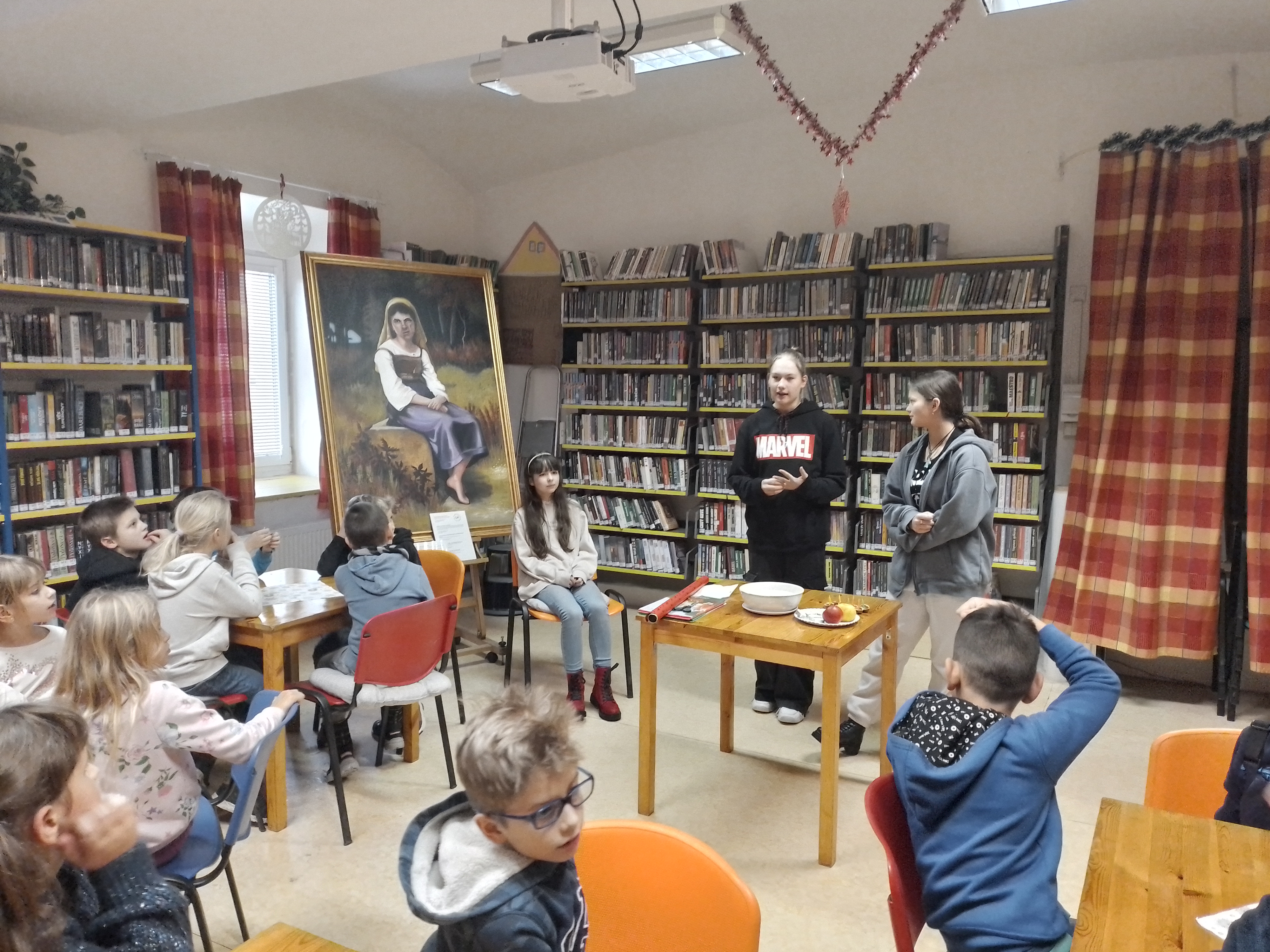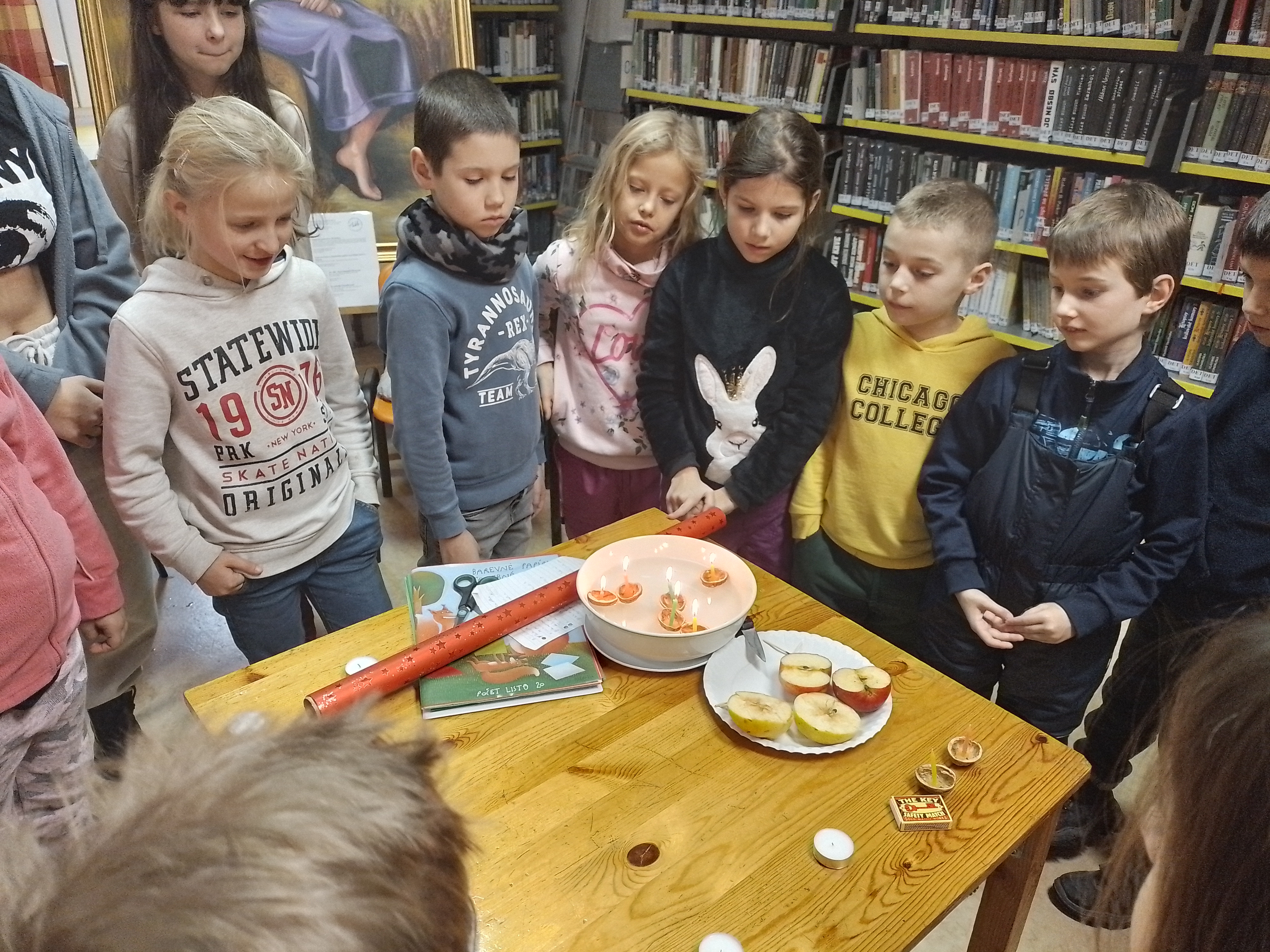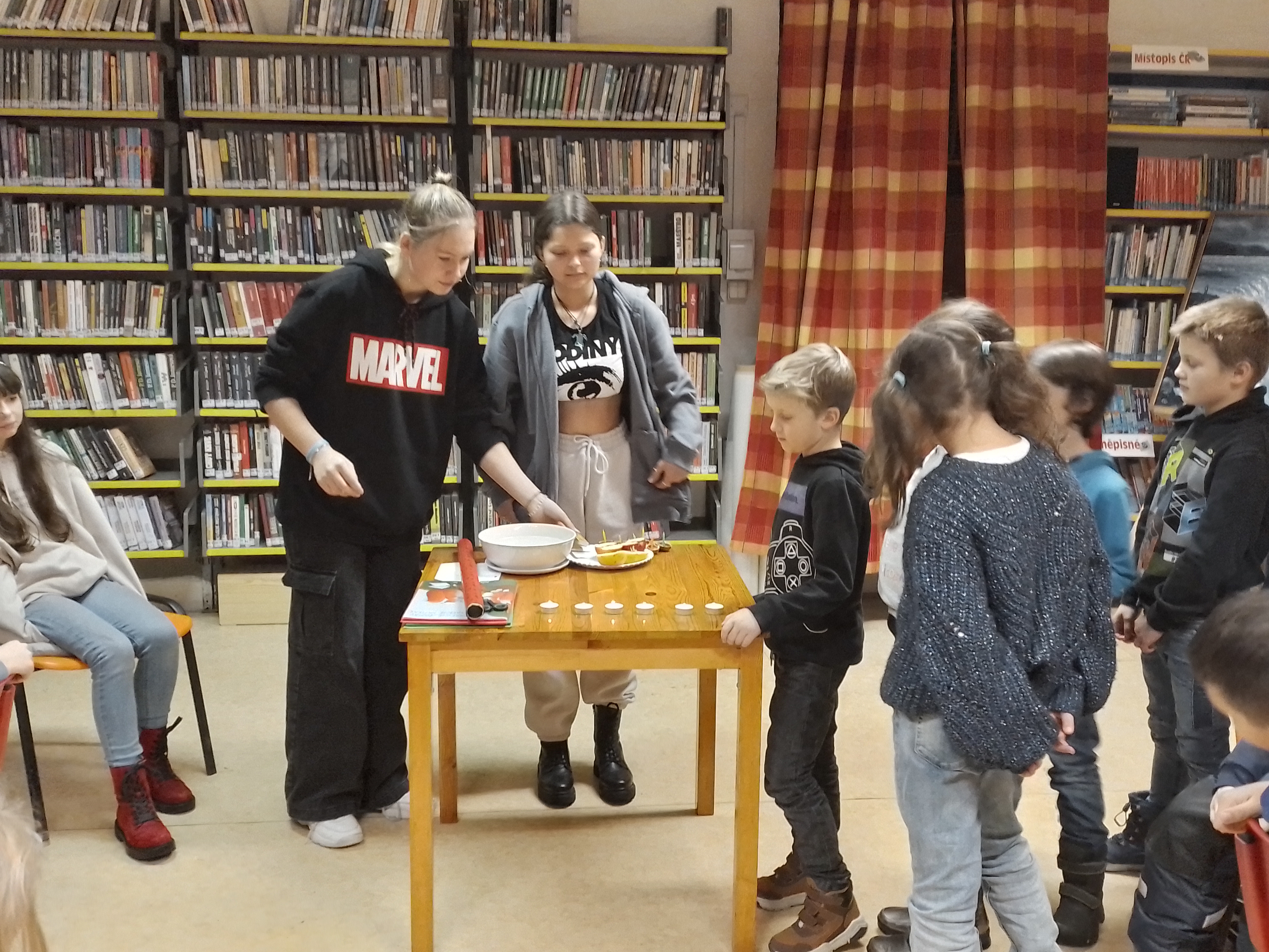 Děti z druhých tříd navštívily Knihovnu Velké Přílepy, kde je tentokrát čekalo povídání o českých vánočních tradicích, které si pro ně připravila děvčata z 8. tříd. Děti se dozvěděly např. o krájení jablíček, že po sfouknutí svíčky se má sledovat, kam jde dým, nebo o pouštění lodiček.