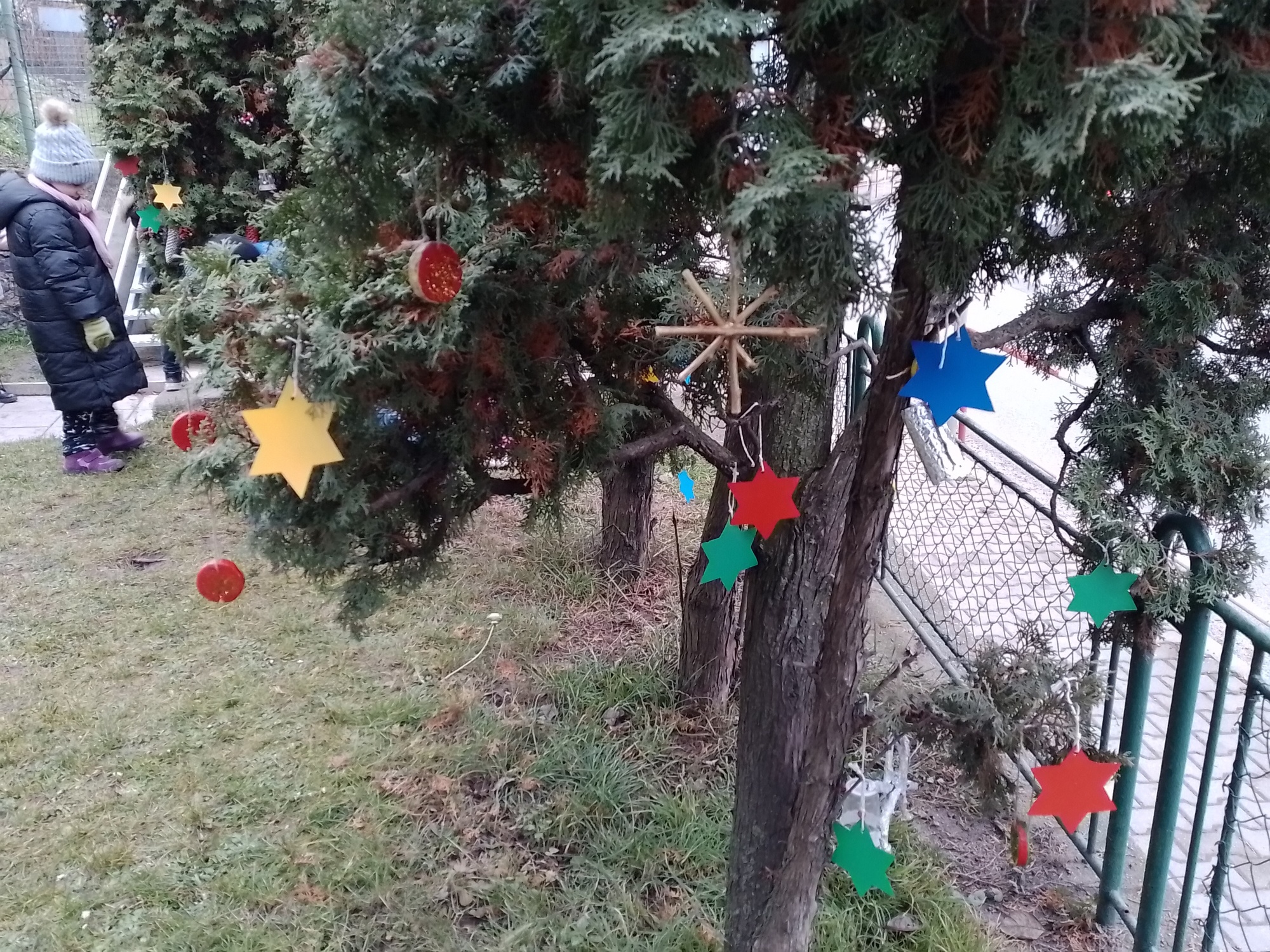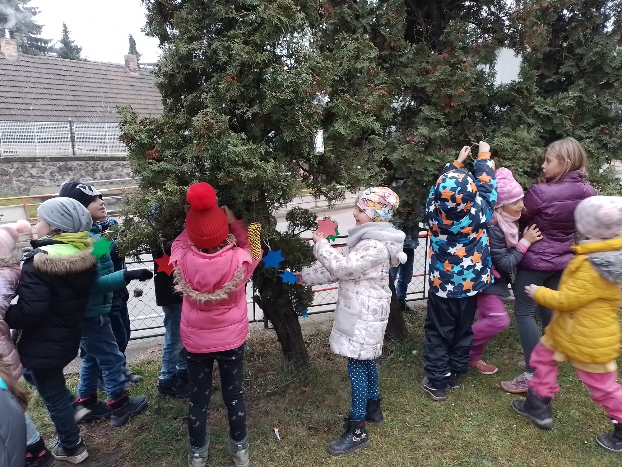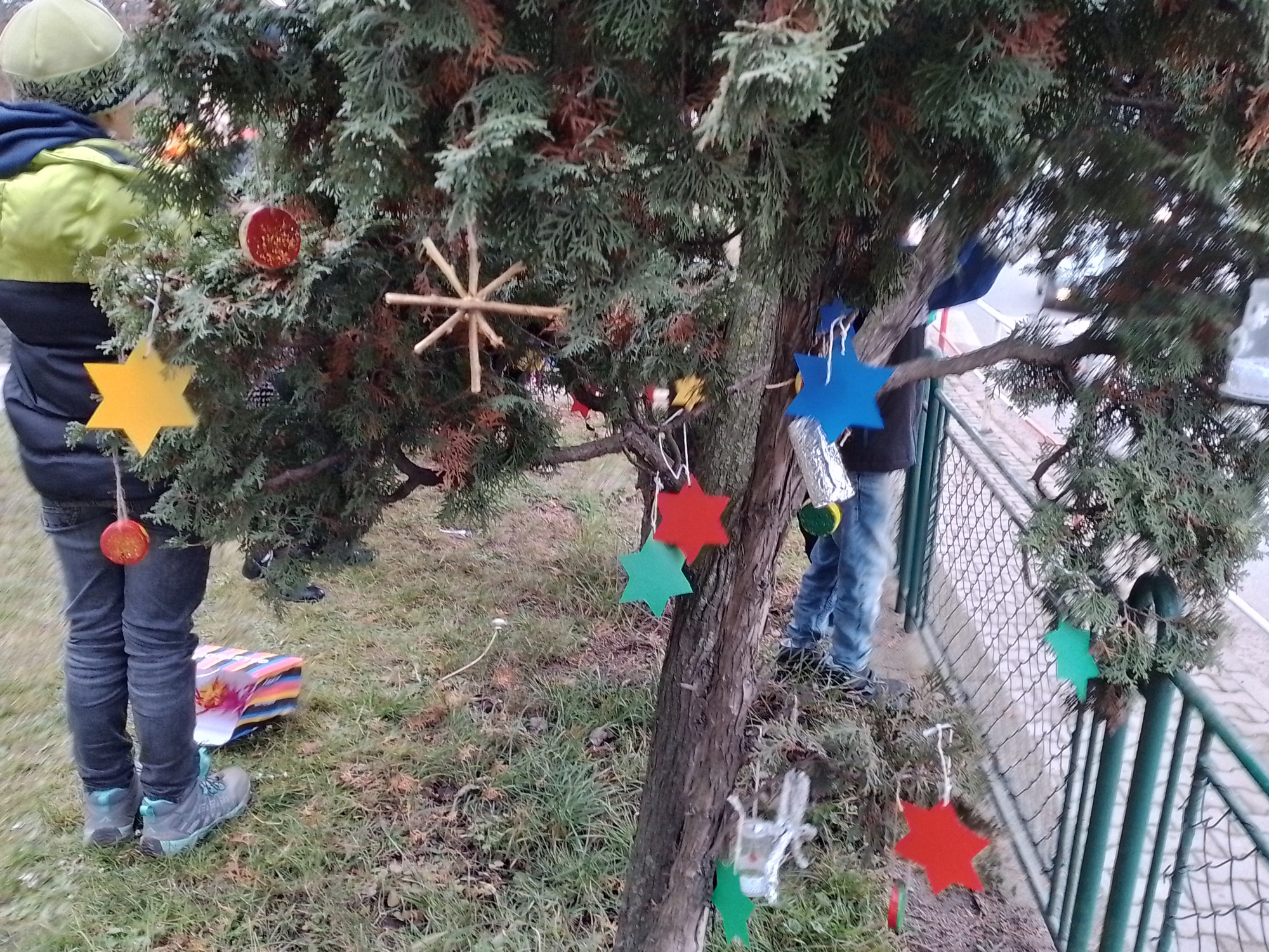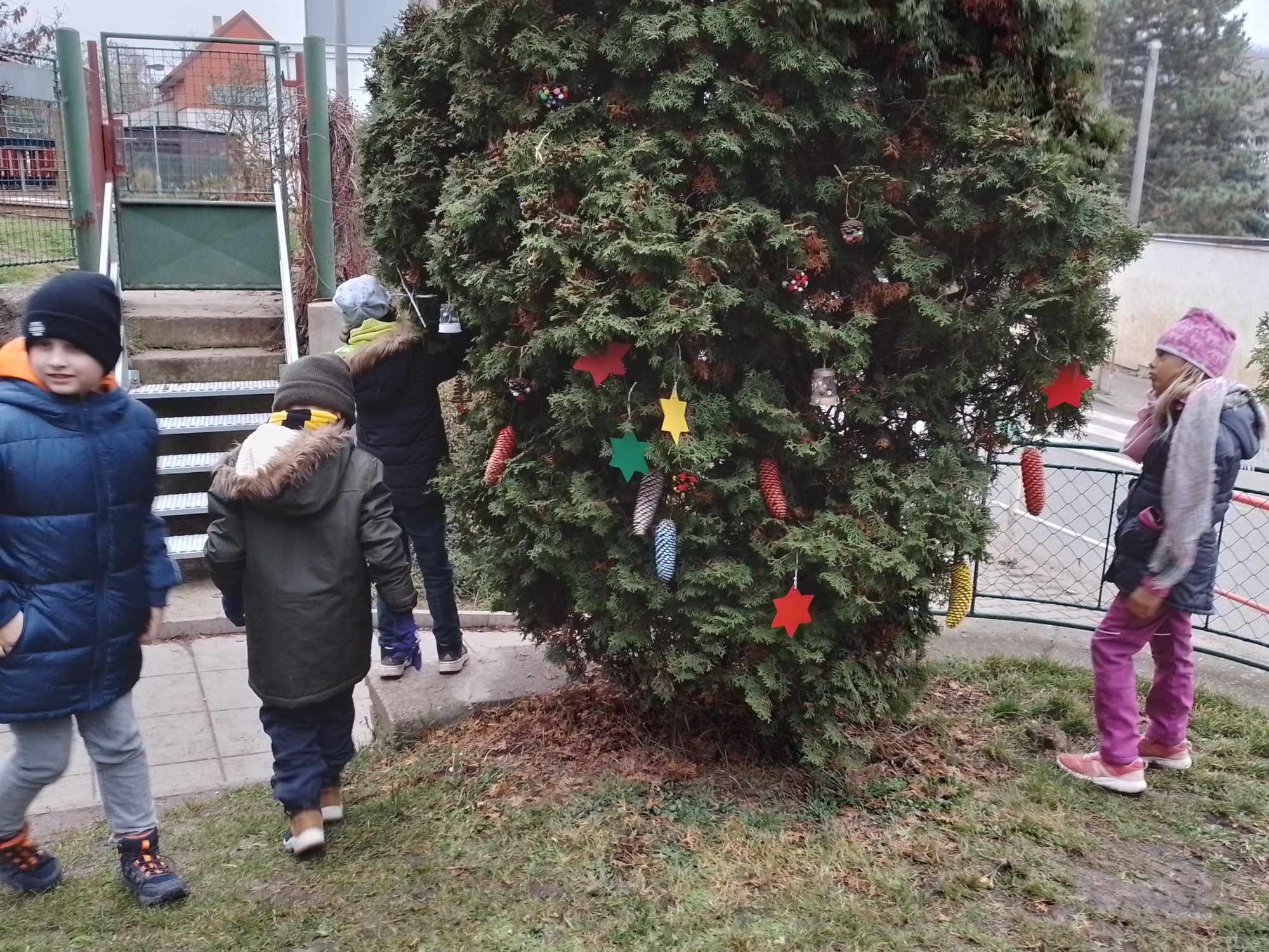 Děti z družiny letos vyrobily úplně nové ozdoby – barevné hvězdičky, zvonečky, ozdoby z klacíků, šišky různě barvené a zdobené, dřevěná kolečka a všechno pak zavěsily na túje před školou, aby všem zpříjemnily předvánoční cestu do školy.