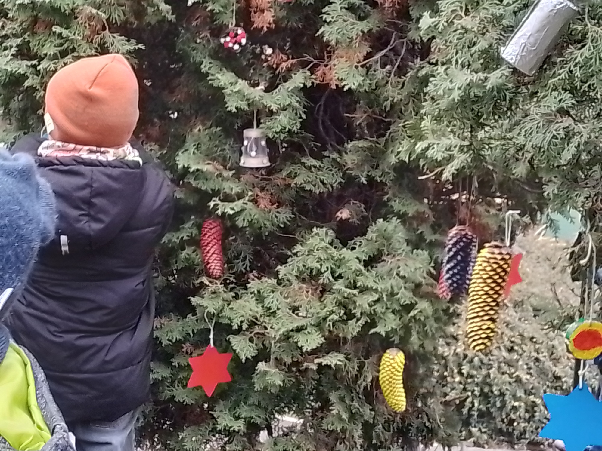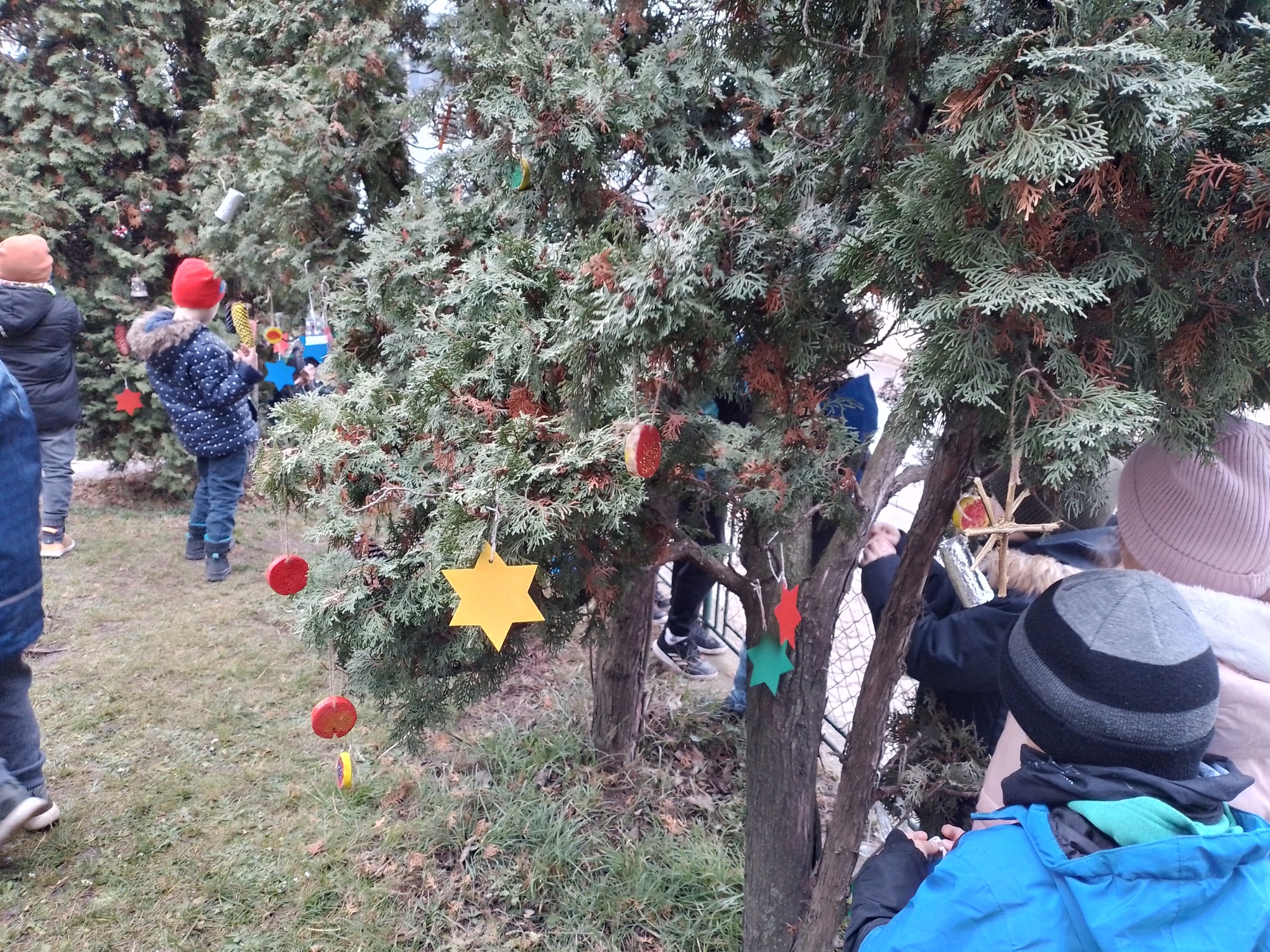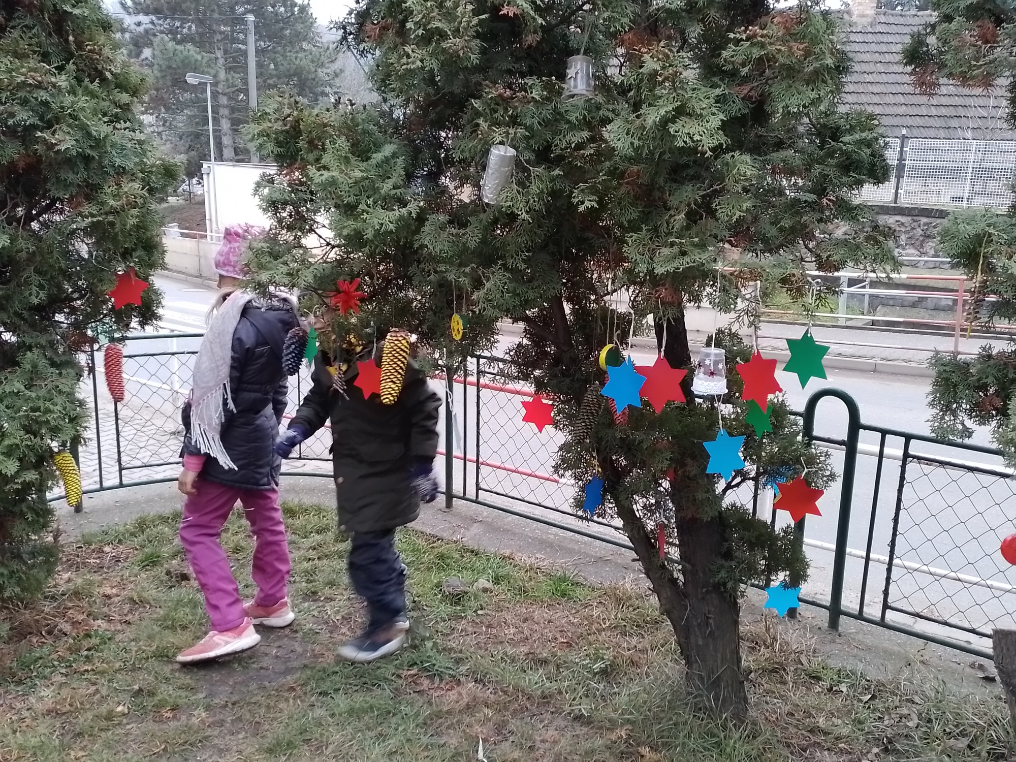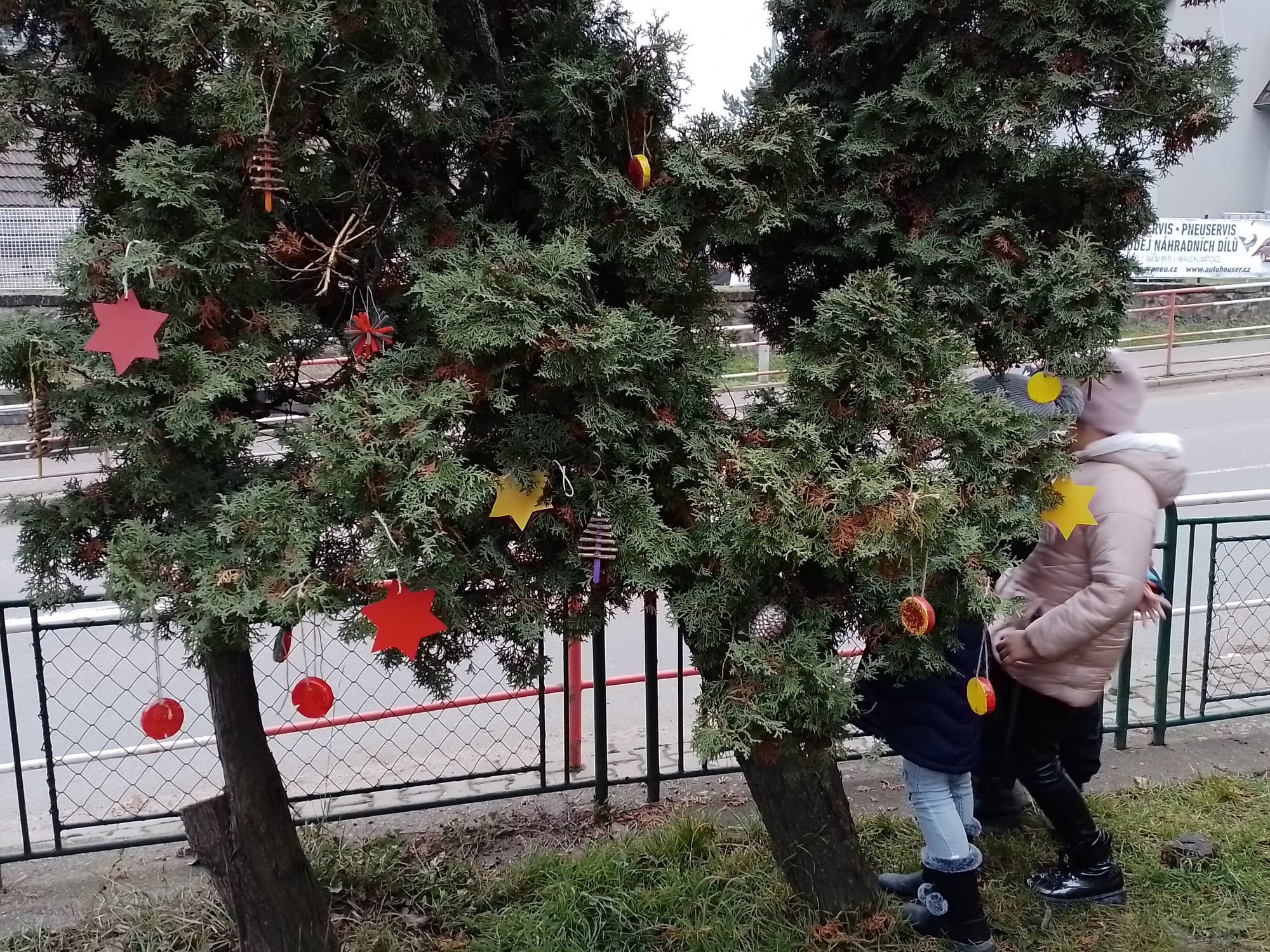 Děti z družiny letos vyrobily úplně nové ozdoby – barevné hvězdičky, zvonečky, ozdoby z klacíků, šišky různě barvené a zdobené, dřevěná kolečka a všechno pak zavěsily na túje před školou, aby všem zpříjemnily předvánoční cestu do školy.