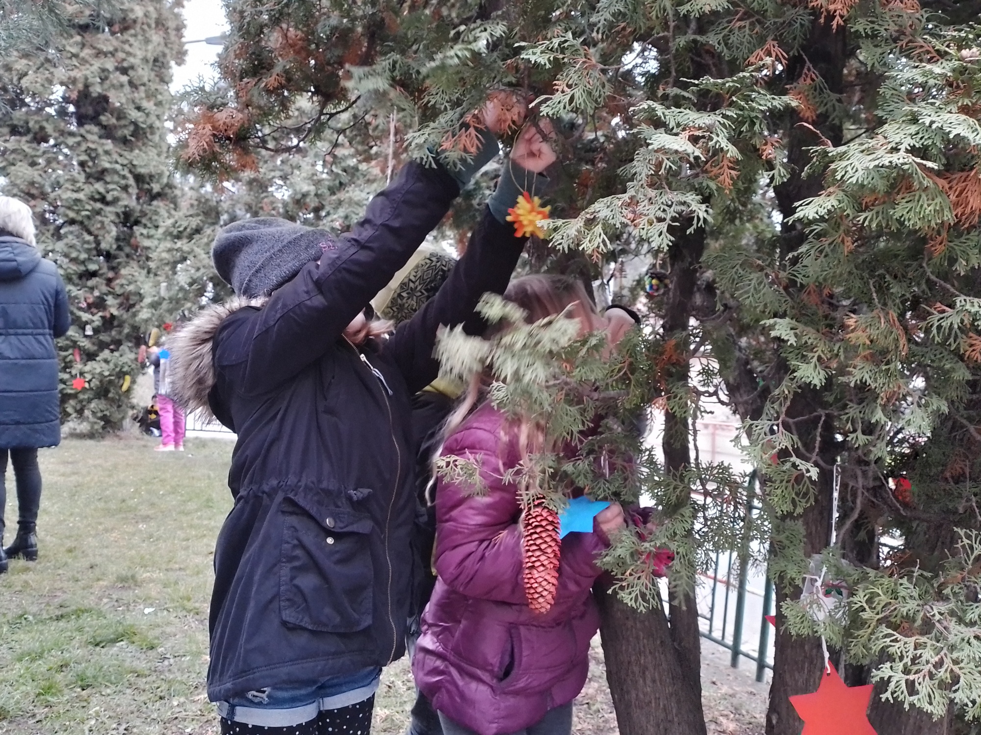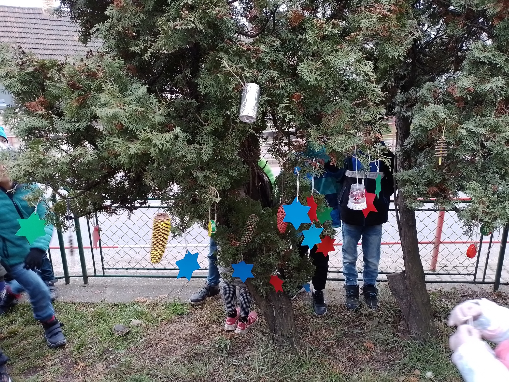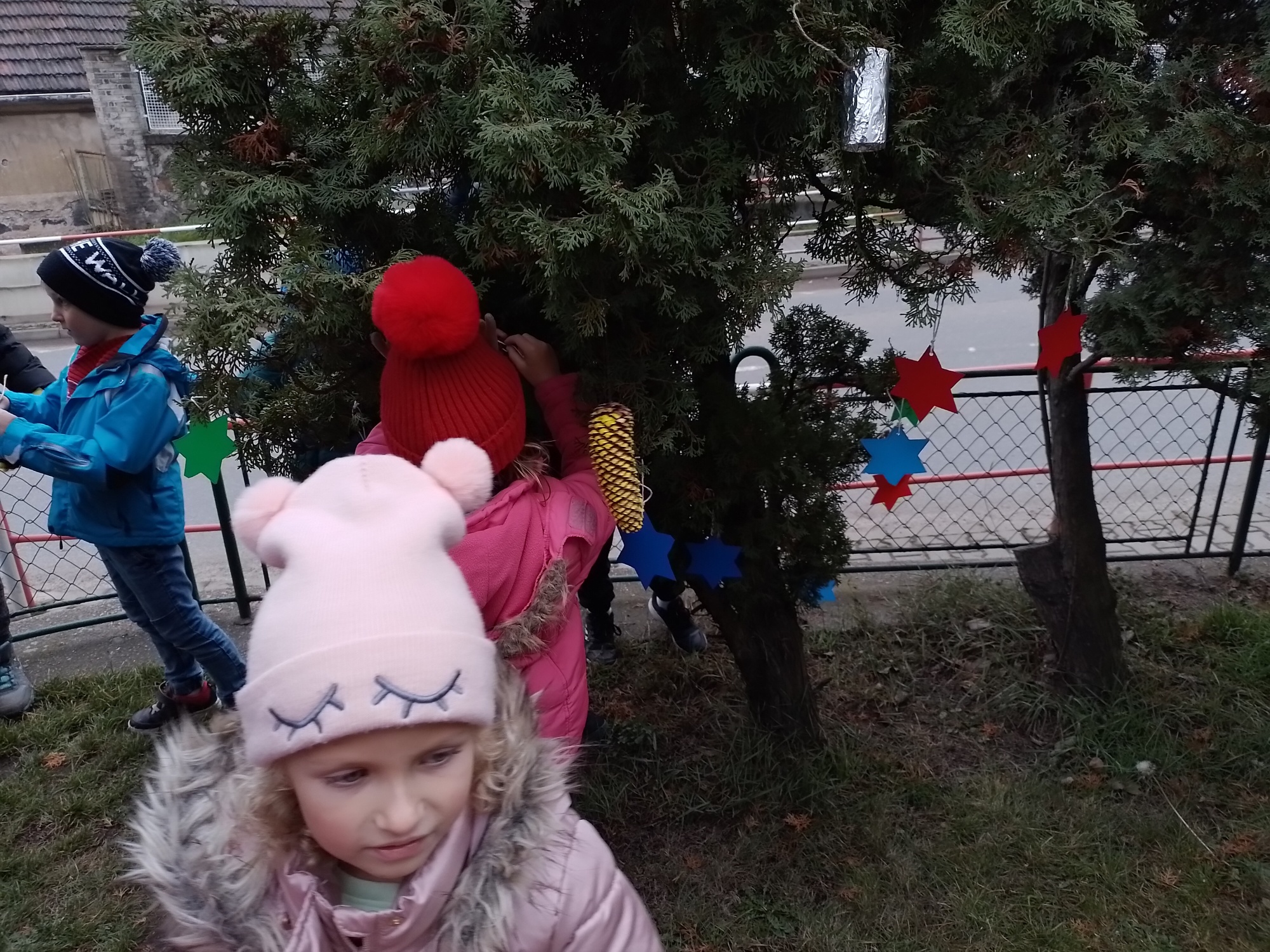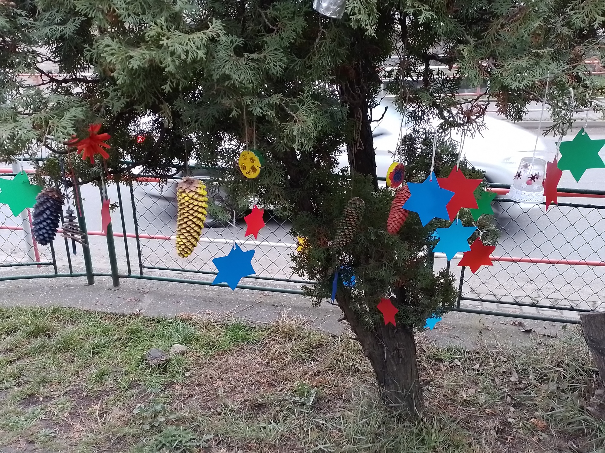 Děti z družiny letos vyrobily úplně nové ozdoby – barevné hvězdičky, zvonečky, ozdoby z klacíků, šišky různě barvené a zdobené, dřevěná kolečka a všechno pak zavěsily na túje před školou, aby všem zpříjemnily předvánoční cestu do školy.