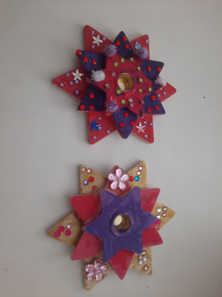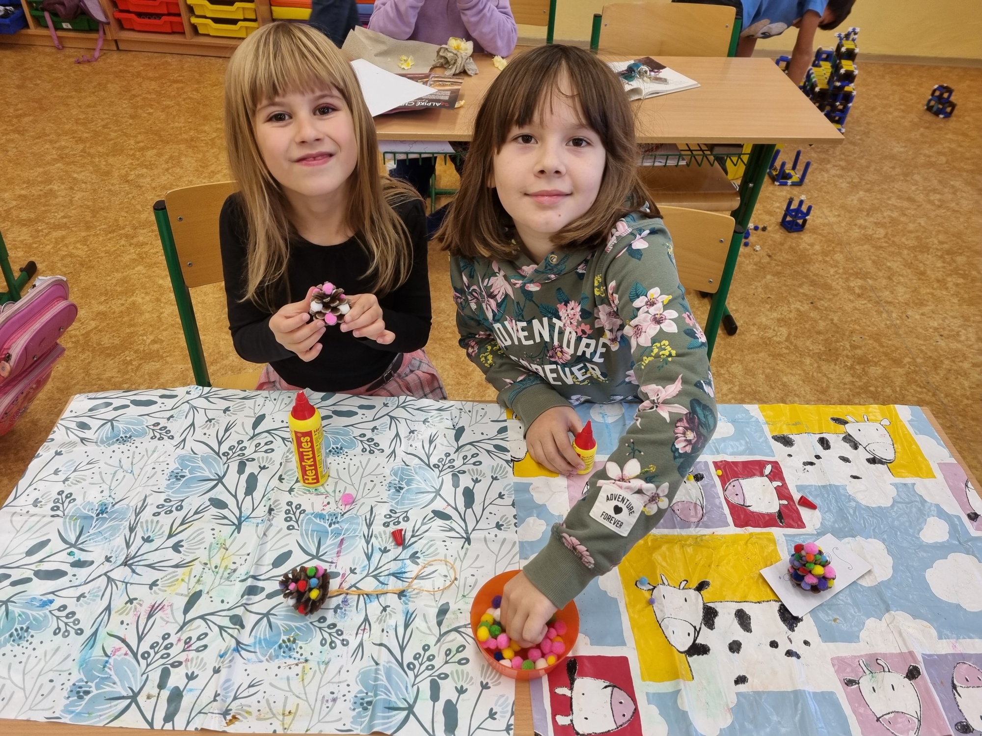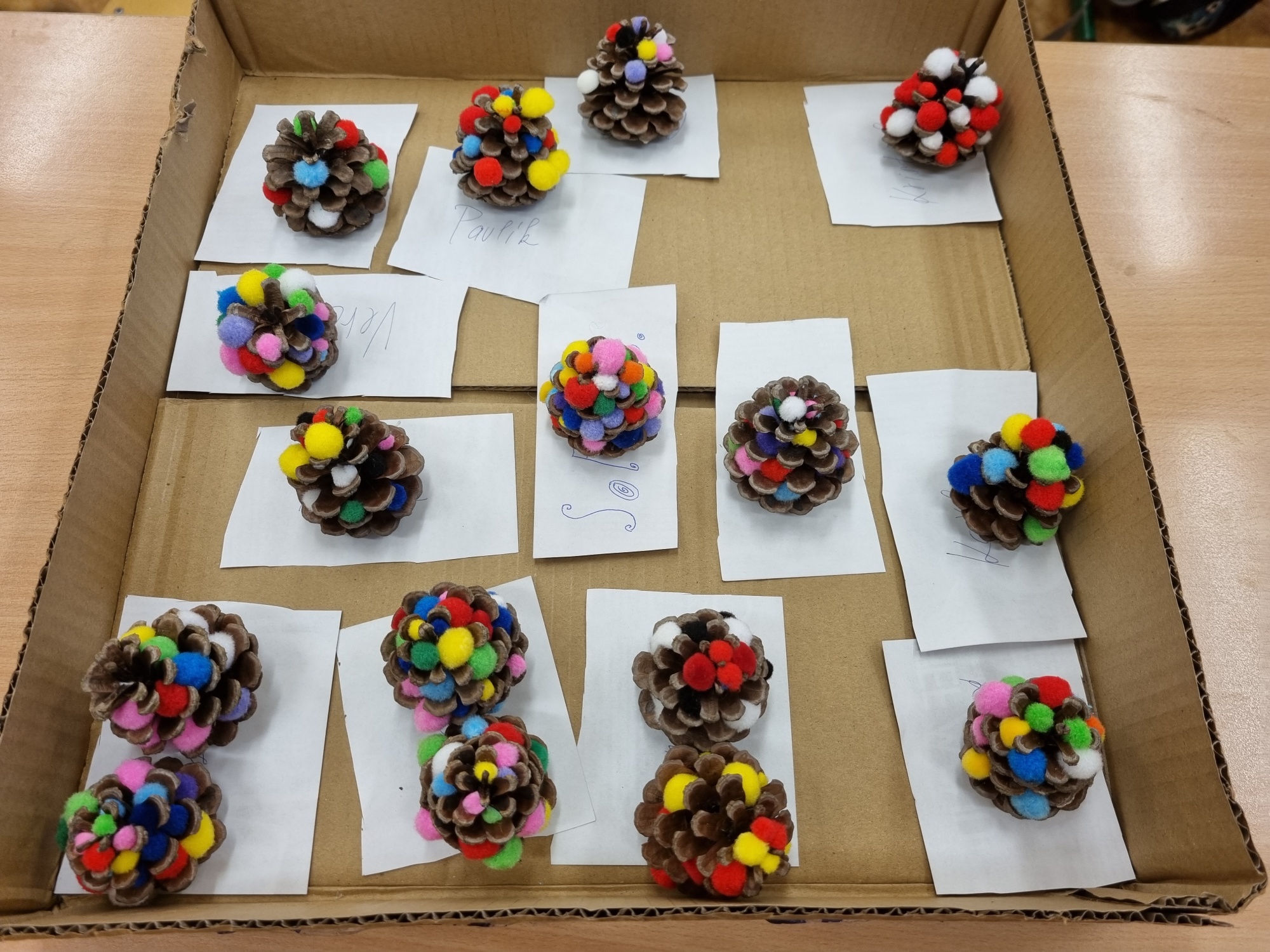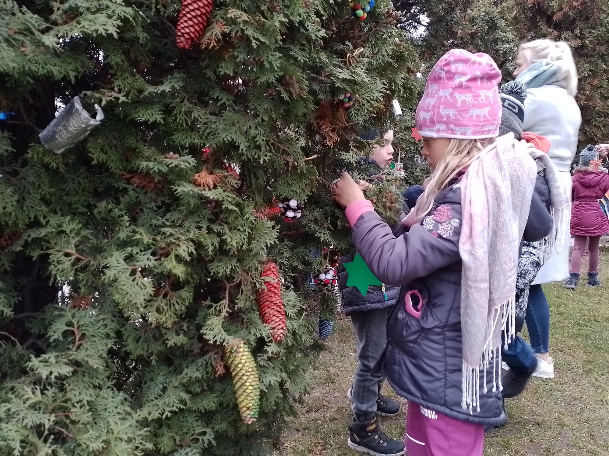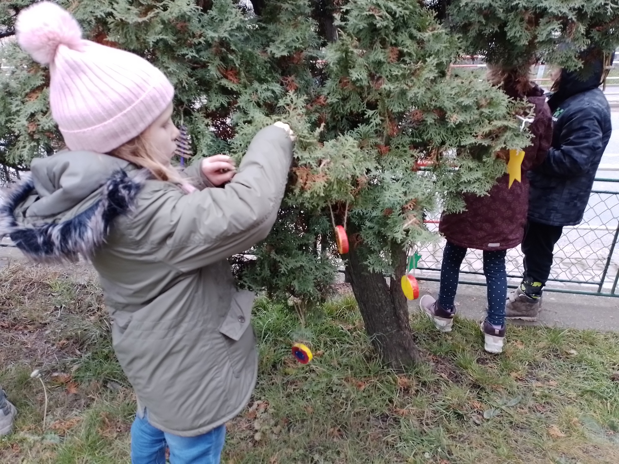 Děti z družiny letos vyrobily úplně nové ozdoby – barevné hvězdičky, zvonečky, ozdoby z klacíků, šišky různě barvené a zdobené, dřevěná kolečka a všechno pak zavěsily na túje před školou, aby všem zpříjemnily předvánoční cestu do školy.