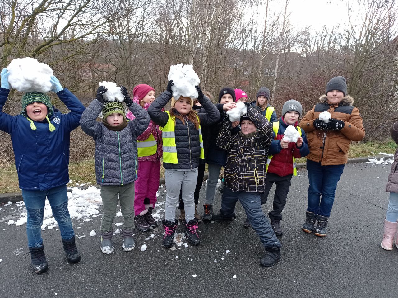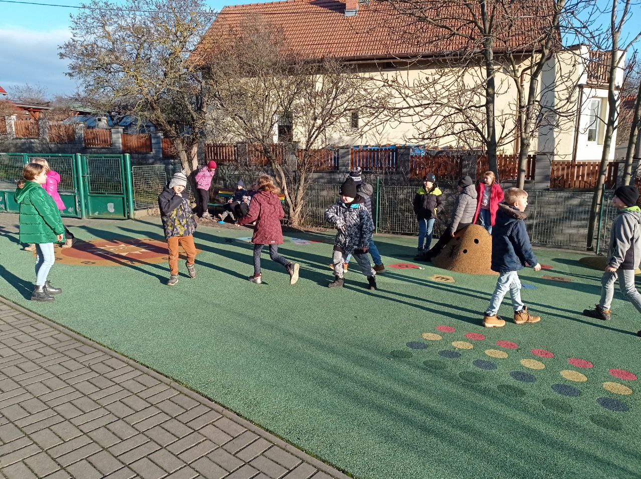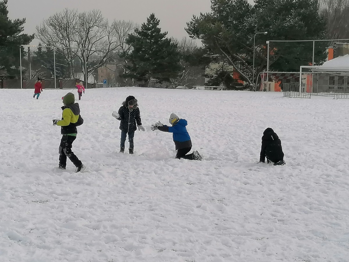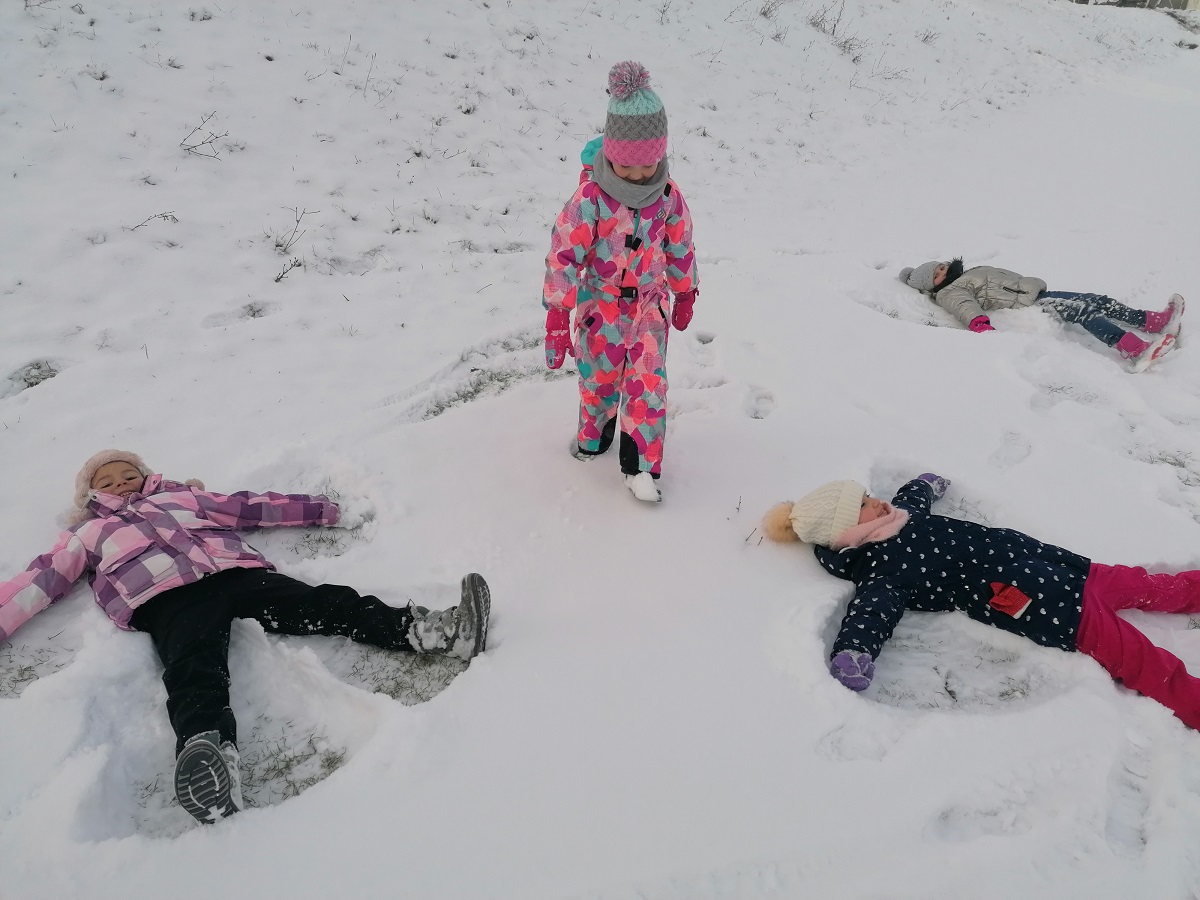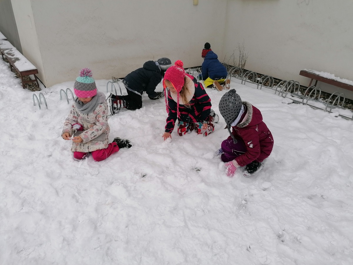 I přestože je počasí proměnlivé, umíme využít chvilku k protažení svých tělíček hrou na hřišti nebo vycházkou. Když se poštěstí a napadne sníh, hned si v něm zadovádíme 😊
