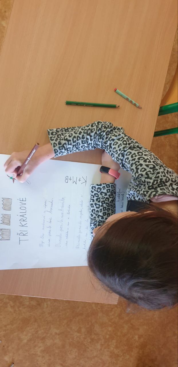 Vyprávěli jsme si o tom, jaké tradice a zvyky jsou spojené se svátkem Tří králů. Krále jsme si vyrobili z papíru, všem se povedli.