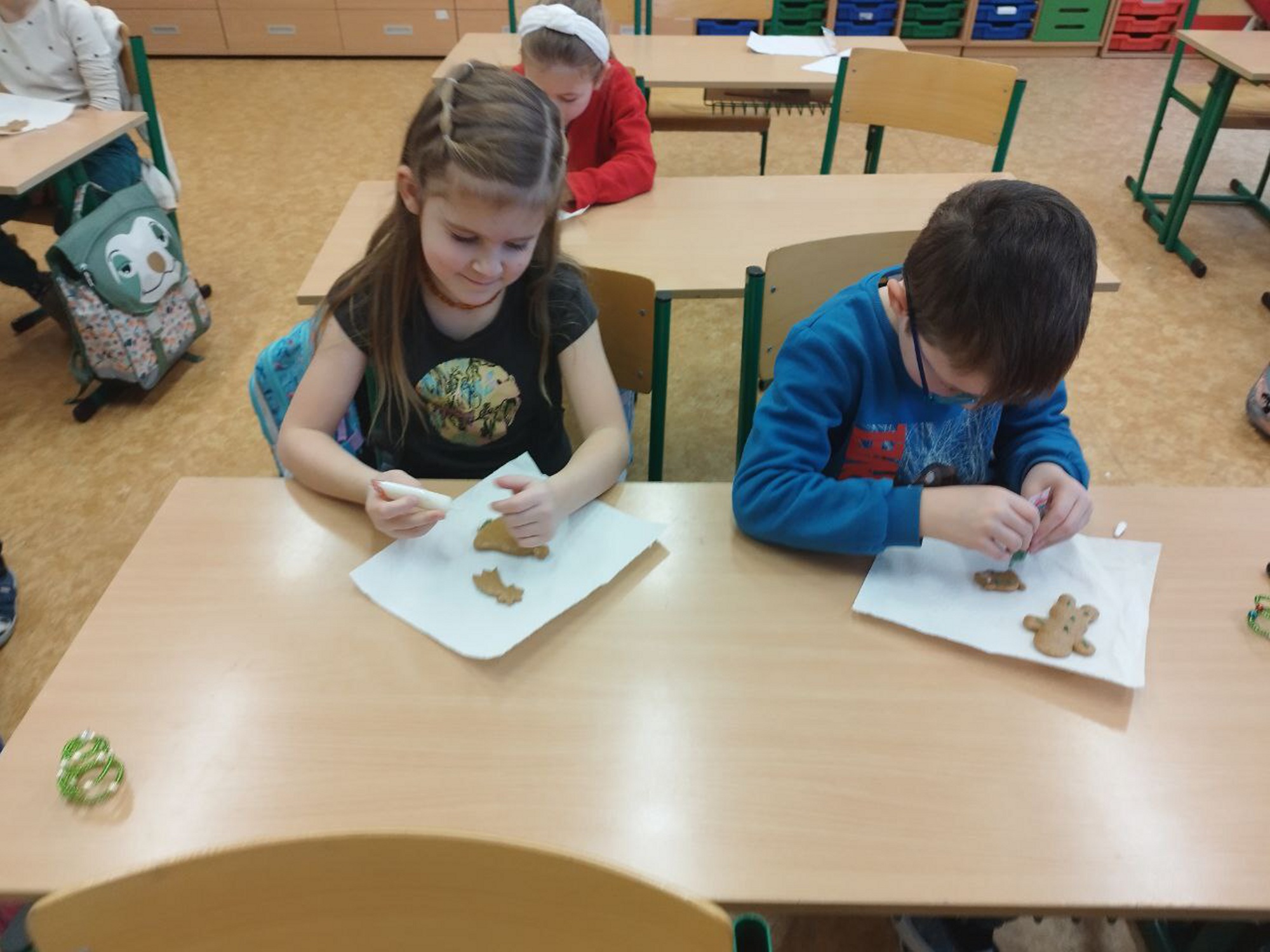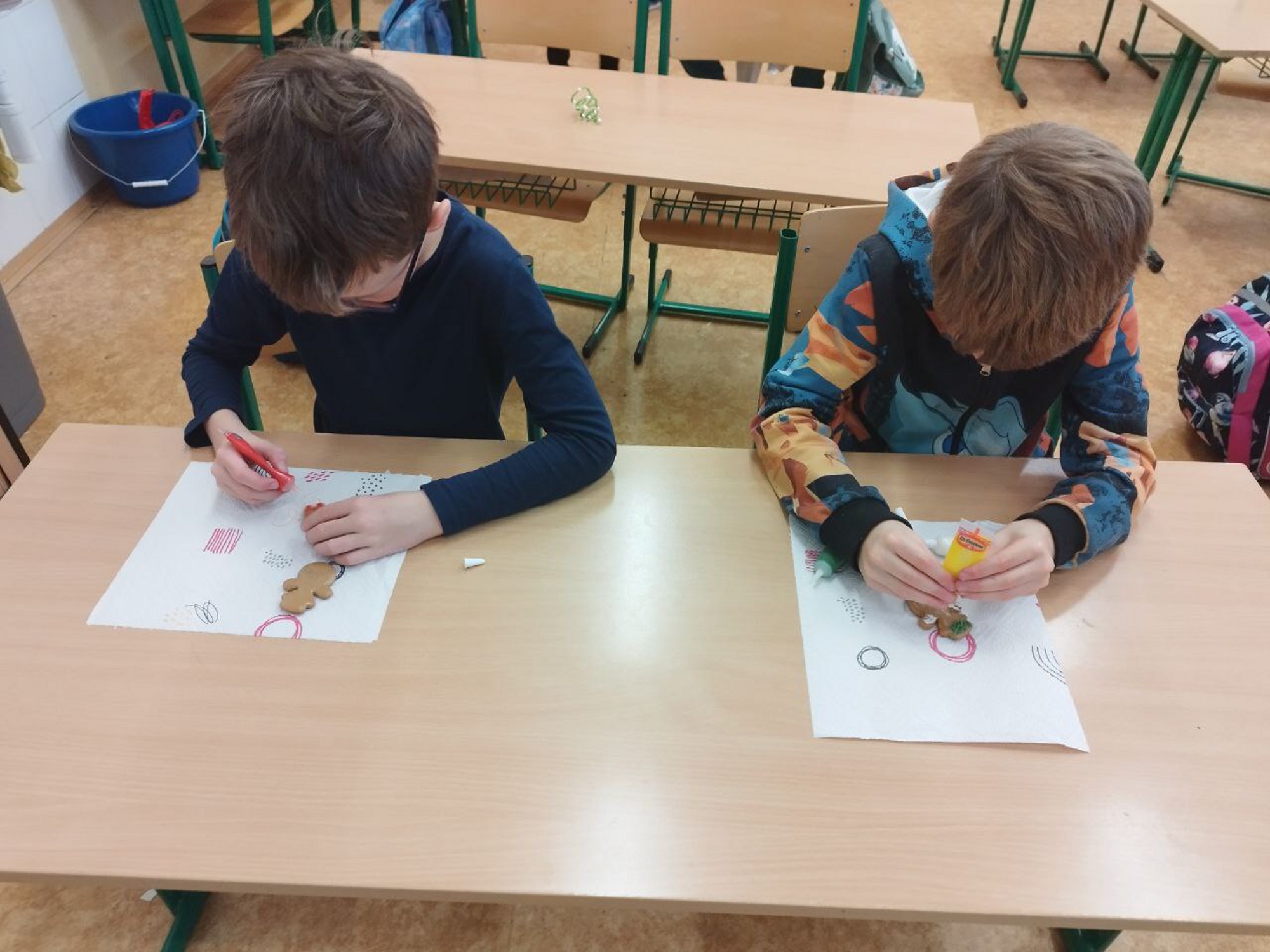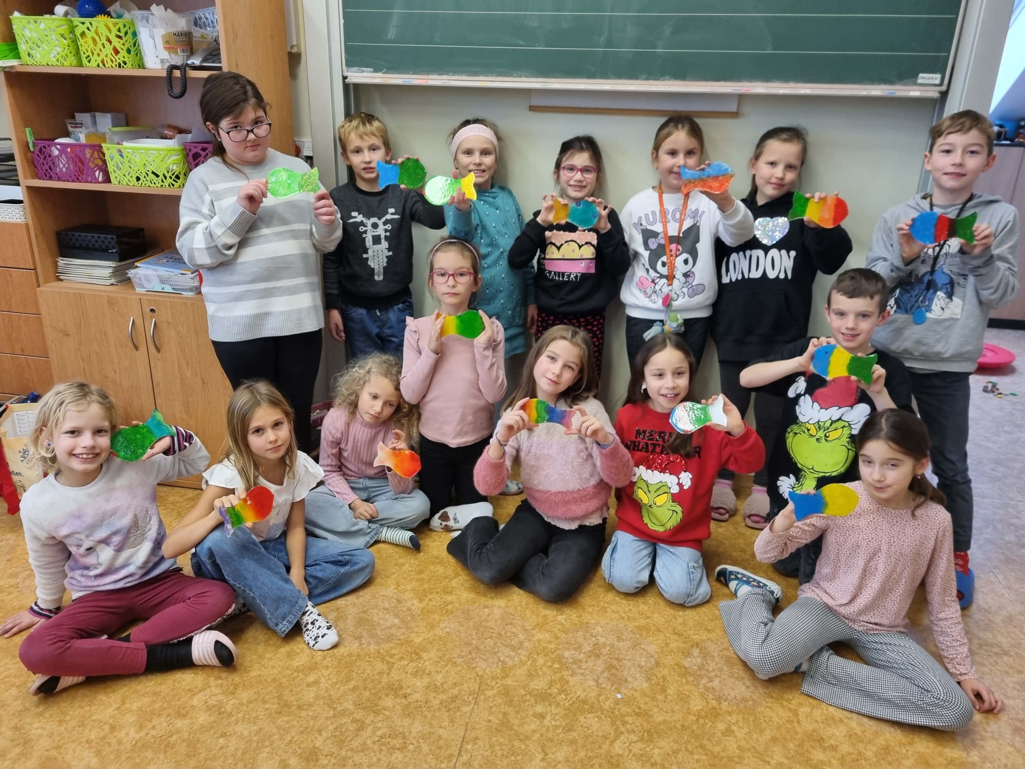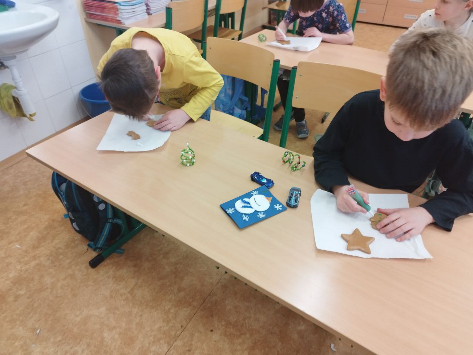 Hlavním cílem bylo vytvořit krásné dárky pro rodiče. Děti s velkým nadšením vyráběly dřevěné ozdoby a malovaly na skleněné rybičky. Práce nám šla hezky od ruky a přitom jsme si pouštěli a zpívali vánoční koledy.