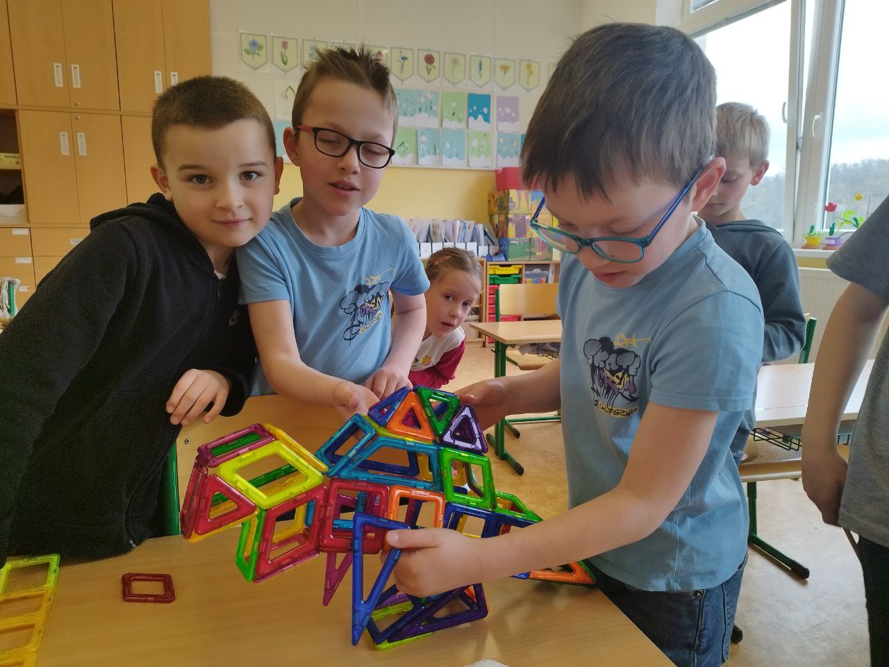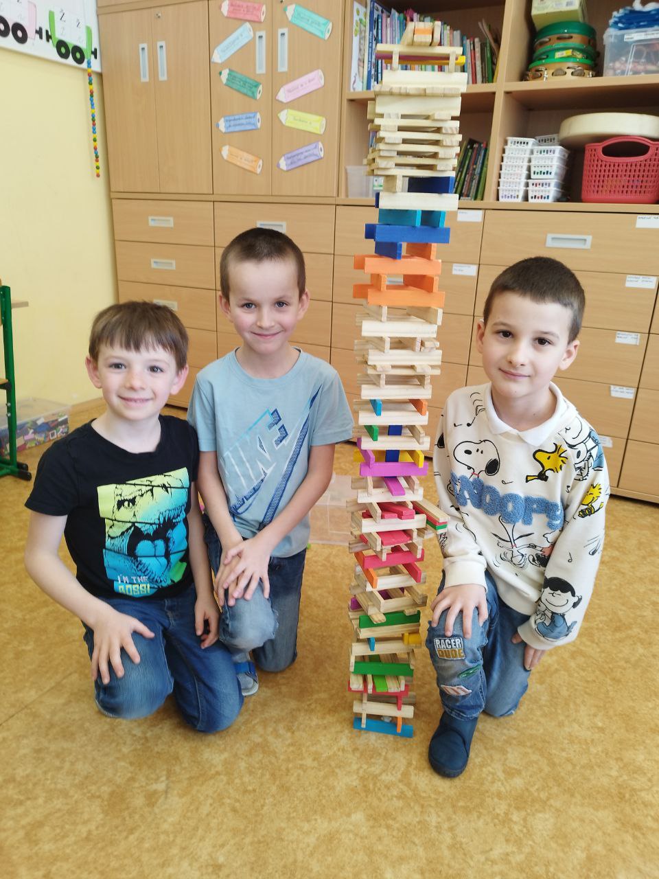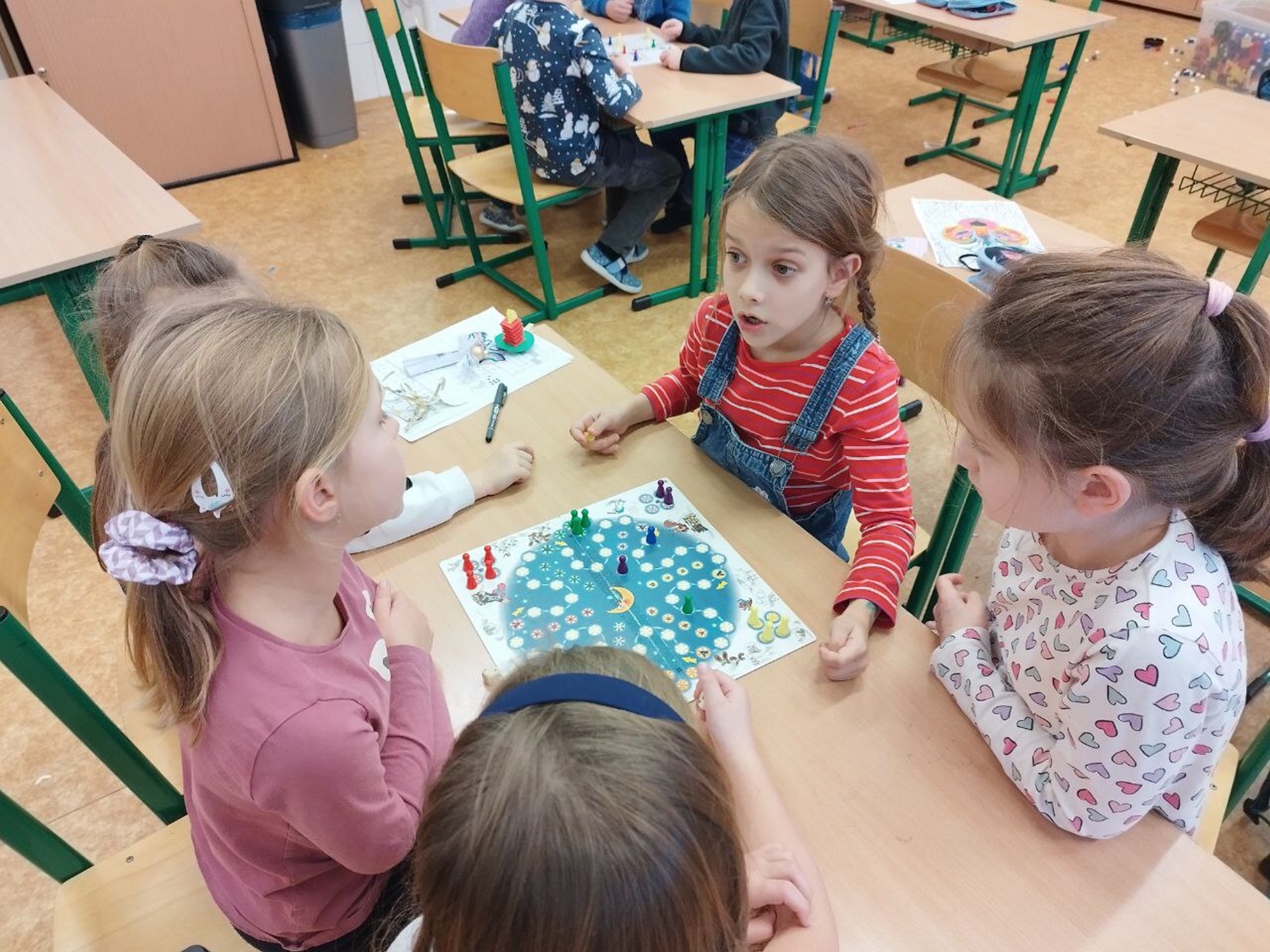 V lednu jsme využili chvilkové sněhové nadílky a užili si zimní radovánky venku. Když počasí nepřálo venkovním aktivitám, věnovali jsme se tvoření – vyráběli jsme stavby z hrášků a párátek, což prověřilo naší trpělivost a kreativitu. Také jsme si pohráli s tangramy , které nám pomohly rozvíjet prostorovou představivost. Obrovskou radost dětem udělaly nové magnetické stavebnice. Část ledna jsme také věnovali přípravě na celodružinový turnaj ve hře Dobble. Kromě toho jsme si zahráli vědomostní hru o svátku Hromnic, při které se děti dozvěděly spoustu zajímavostí o tomto méně známém dni.