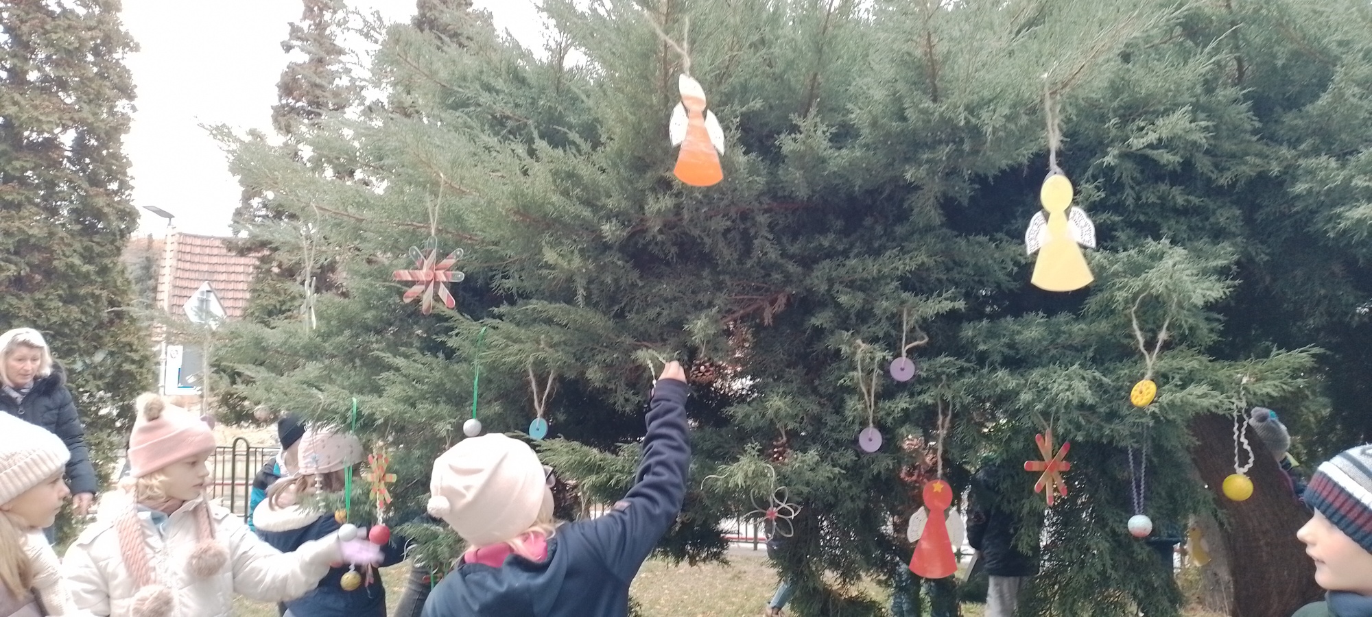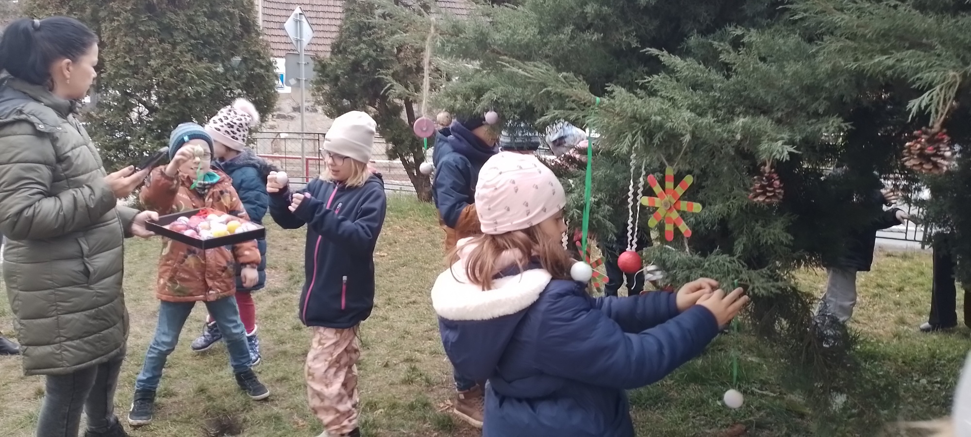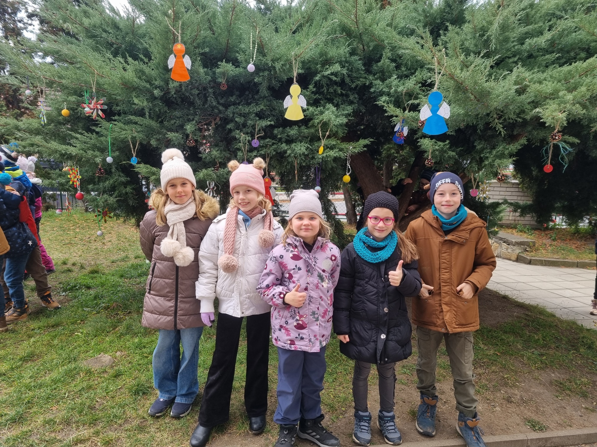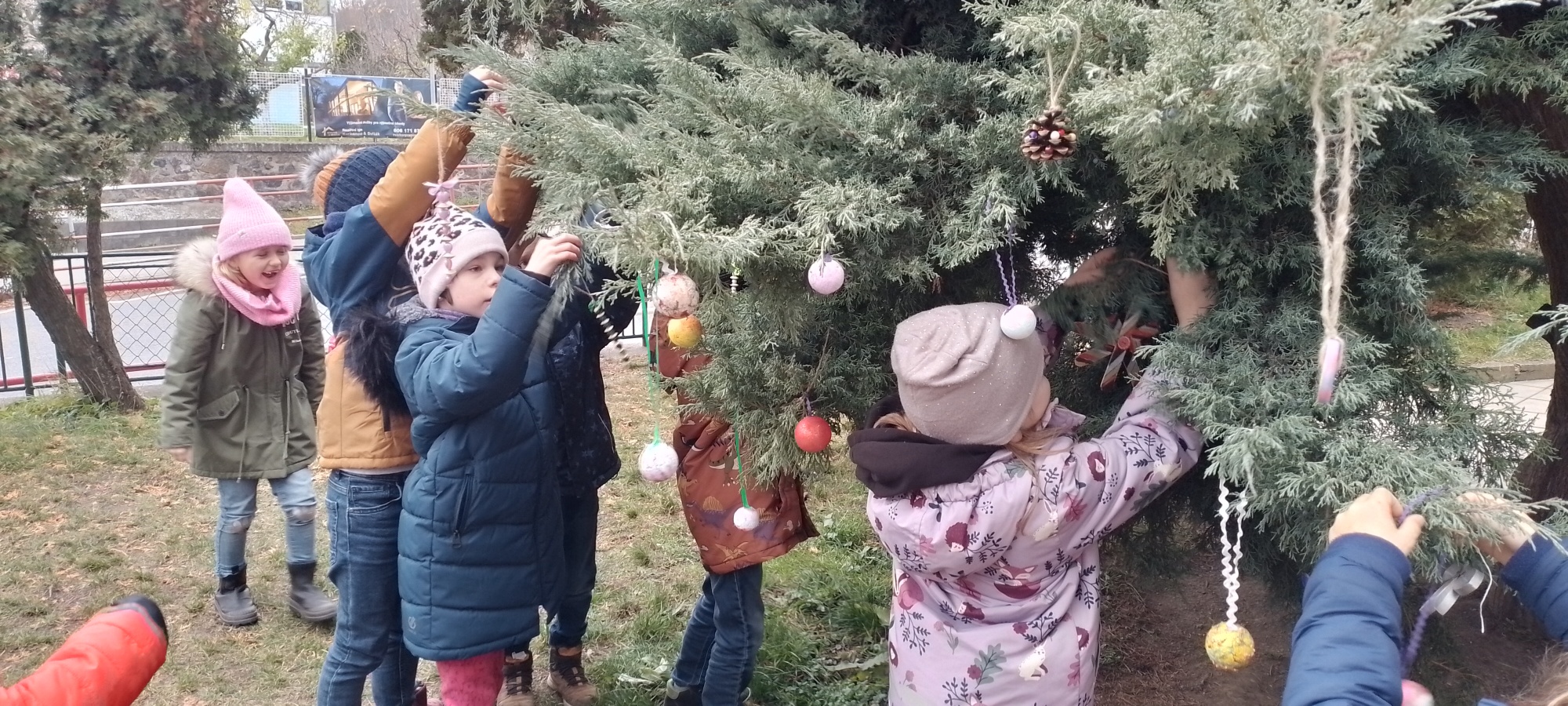 Už v průběhu listopadu děti vyrobily ze šišek, korálků, špachtlí, dřevěných koleček nebo z polystyrenových koulí vánoční ozdoby, kterými pak nazdobily na začátku adventu strom před školou.