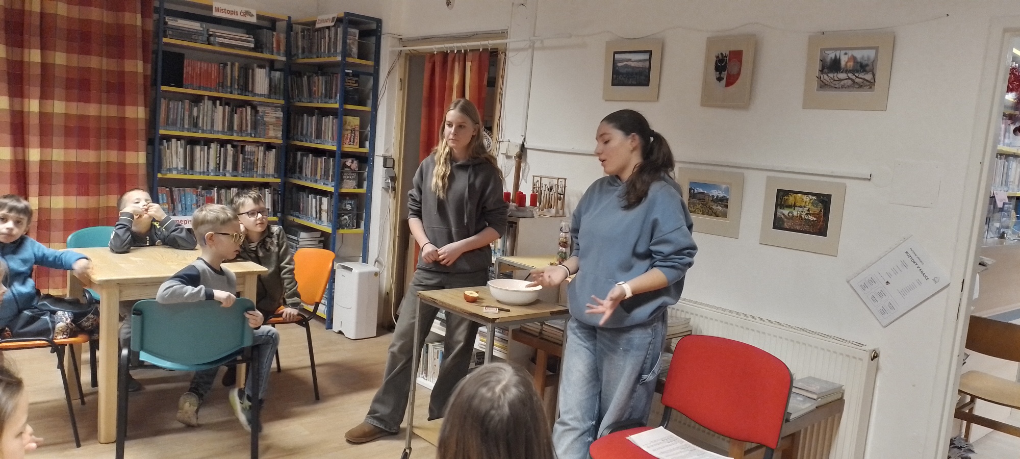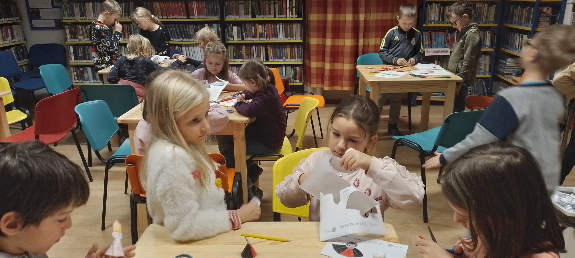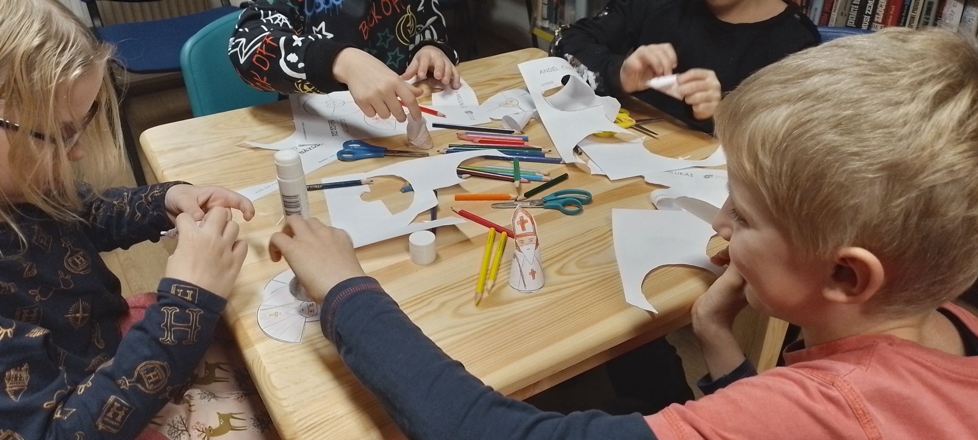 Děti také zavítaly do místní knihovny, kde bylo pro malé návštěvníky připravené poutavé povídání děvčat z osmé třídy o vánočních zvycích a tradicích, jako je např. pouštění lodiček z ořechových skořápek nebo házení střevícem. Poté si děti mohly vybarvit a vystřihnout malé figurky Mikuláše, čerta a anděla.