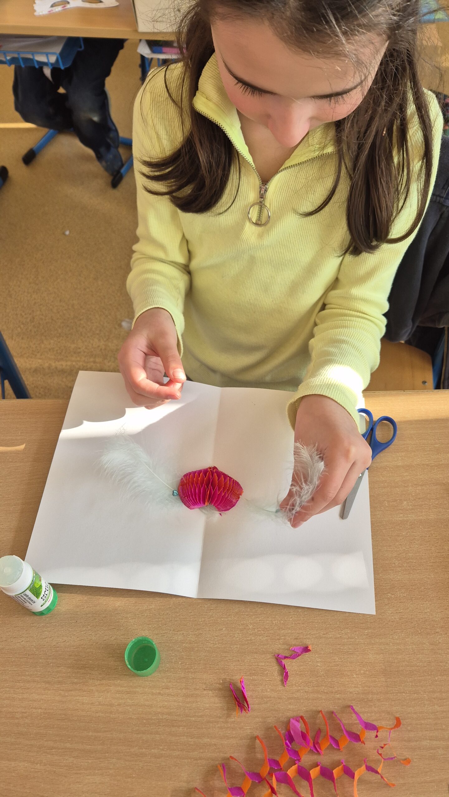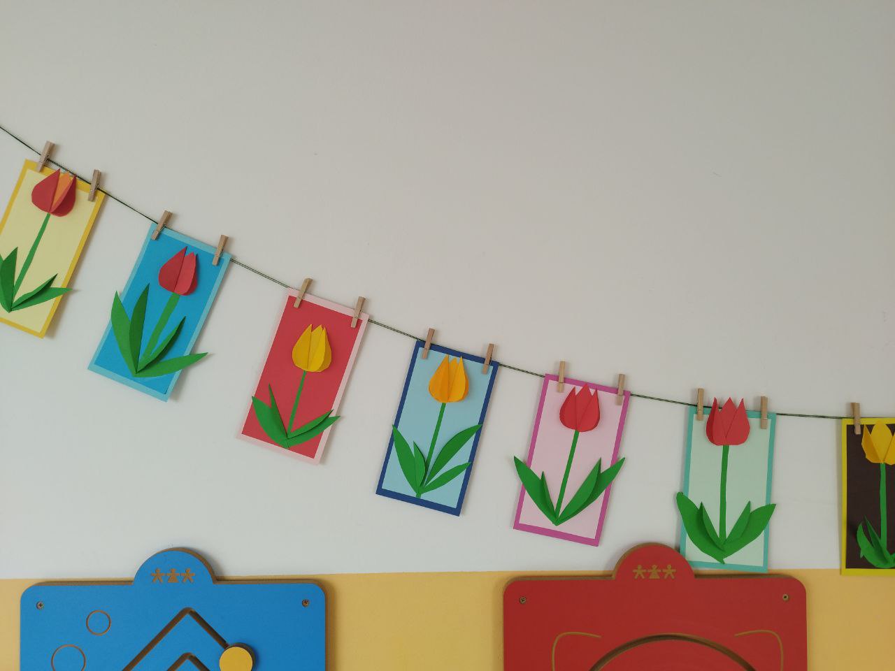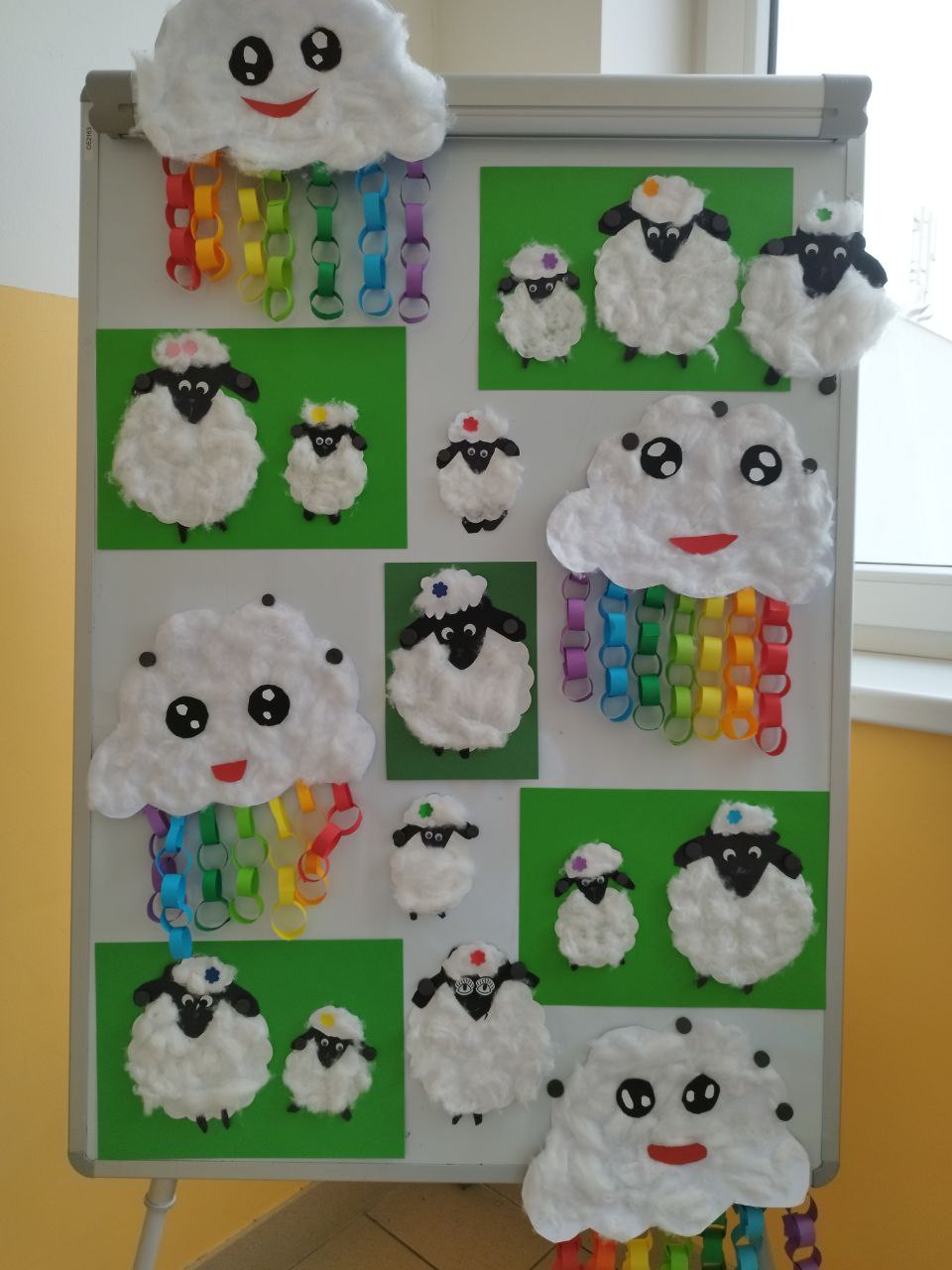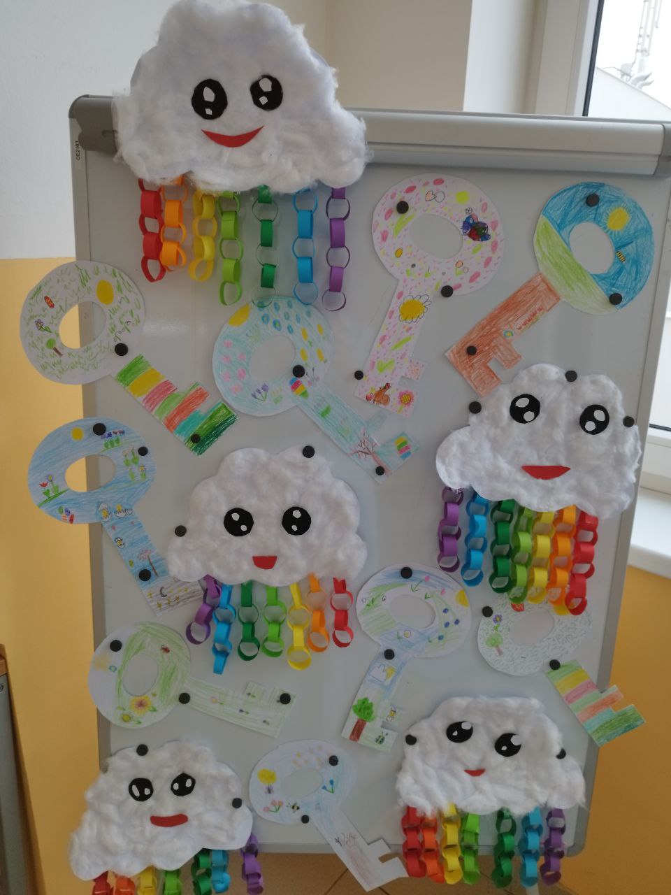 Ve výtvarné činnosti jsme jako první vyrobili papírový klíč k jaru a jarní kytičku tulipán, které přivedly do prostor družiny kousek jarní atmosféry. Dále jsme vyrobili mráček, který se dětem moc líbil a po povídání si o zvířecích mláďátkách si děti vyrobily ovečku.