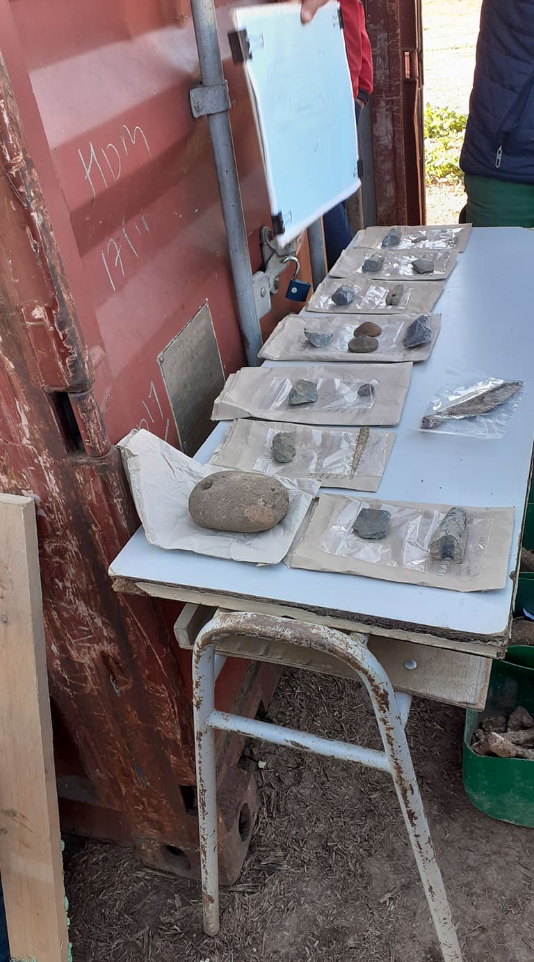 Potom si žáci prohlédli malou výstavku ukázek nálezů z tohoto místa. Zbytky keramiky, úlomky pravěkých nástrojů, závaží z tkalcovského stavu, kousek pazourku a kostěnou jehlu. A pochopitelně úlomky kostí, i těch ze zmiňovaného bojovníka. Největší pozornost vyvolal zachovalý hrot kopí.