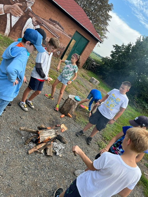 K obědu si někteří z nás přinesli buřty a tak jsme vyzkoušeli rozdělávání ohně. Povedlo se a pochutnali jsme si.