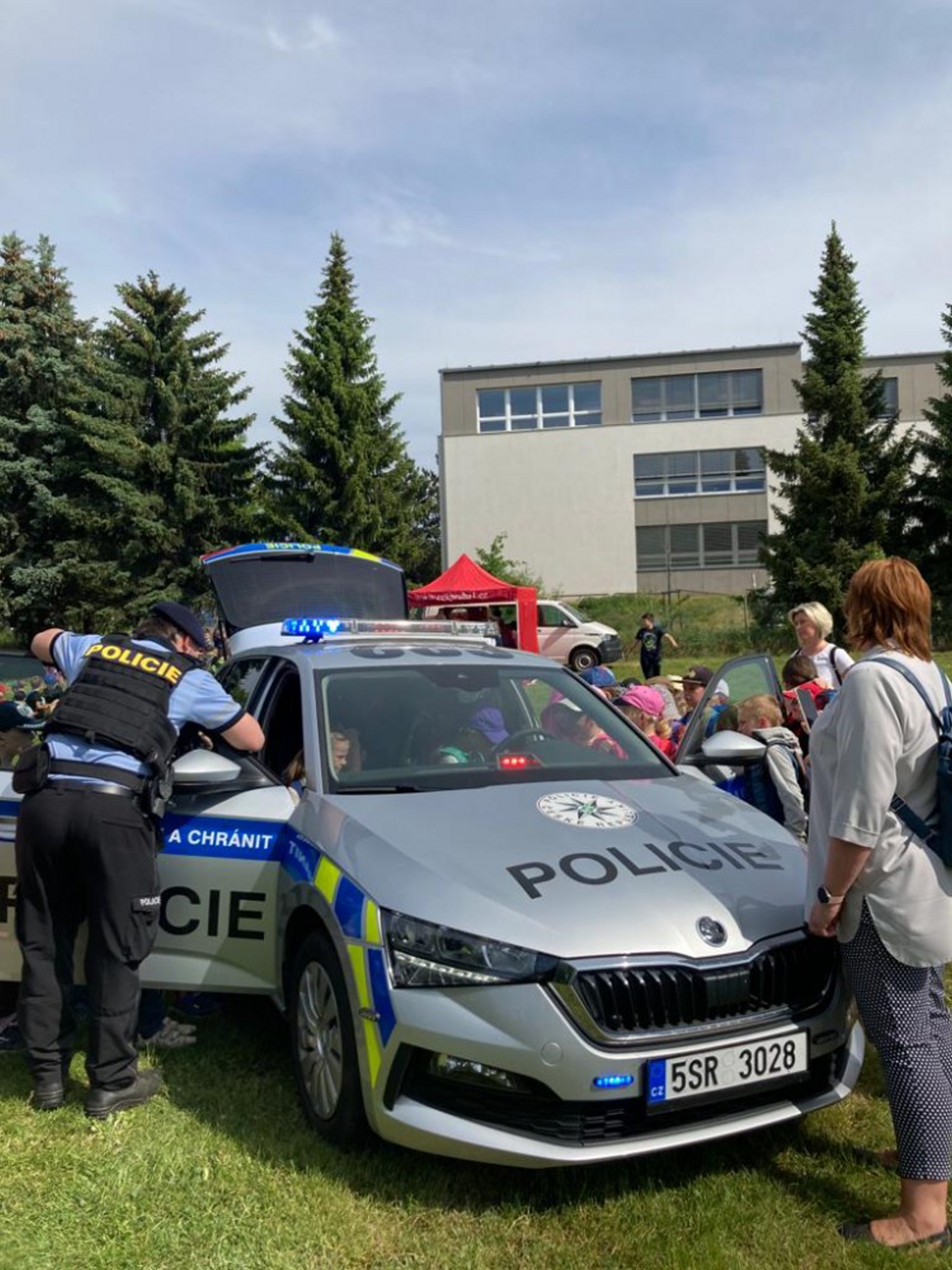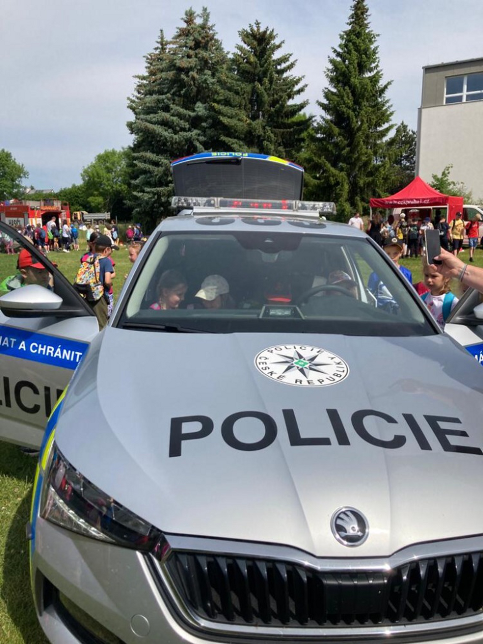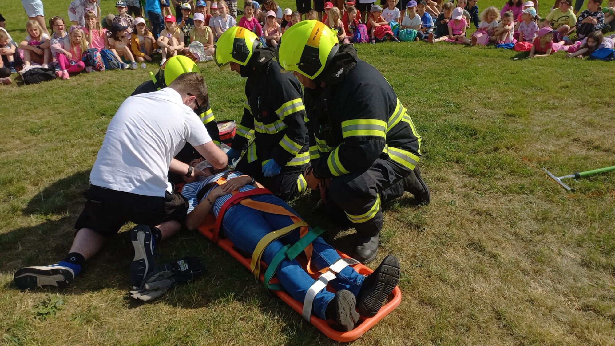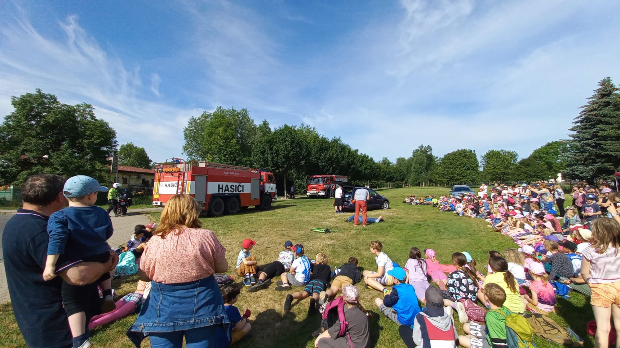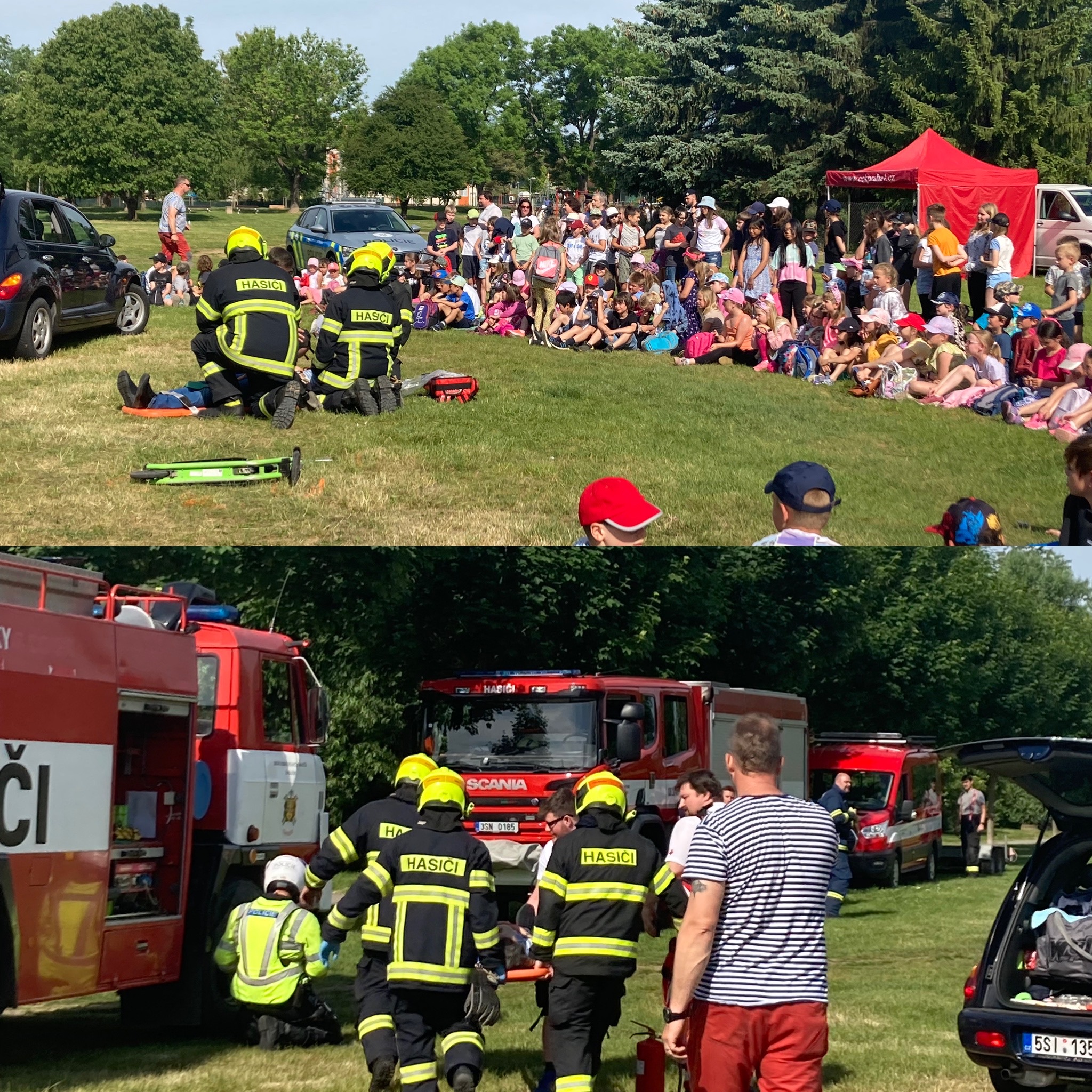 Poté se odehrával program na louce pod školou. Pro mladší děti byla připravena komentovaná dopravní nehoda. Vyposlechly si, jak se správně v takové chvíli zachovat a co dělat. Žáci druhého stupně měli možnost sledovat vyproštění z vraku auta za pomoci hydraulických nůžek.