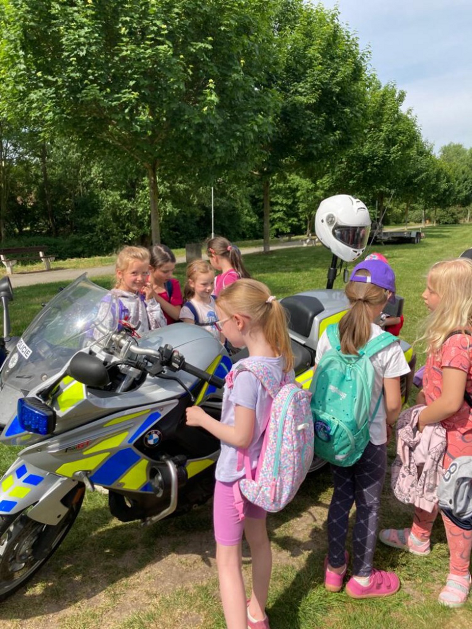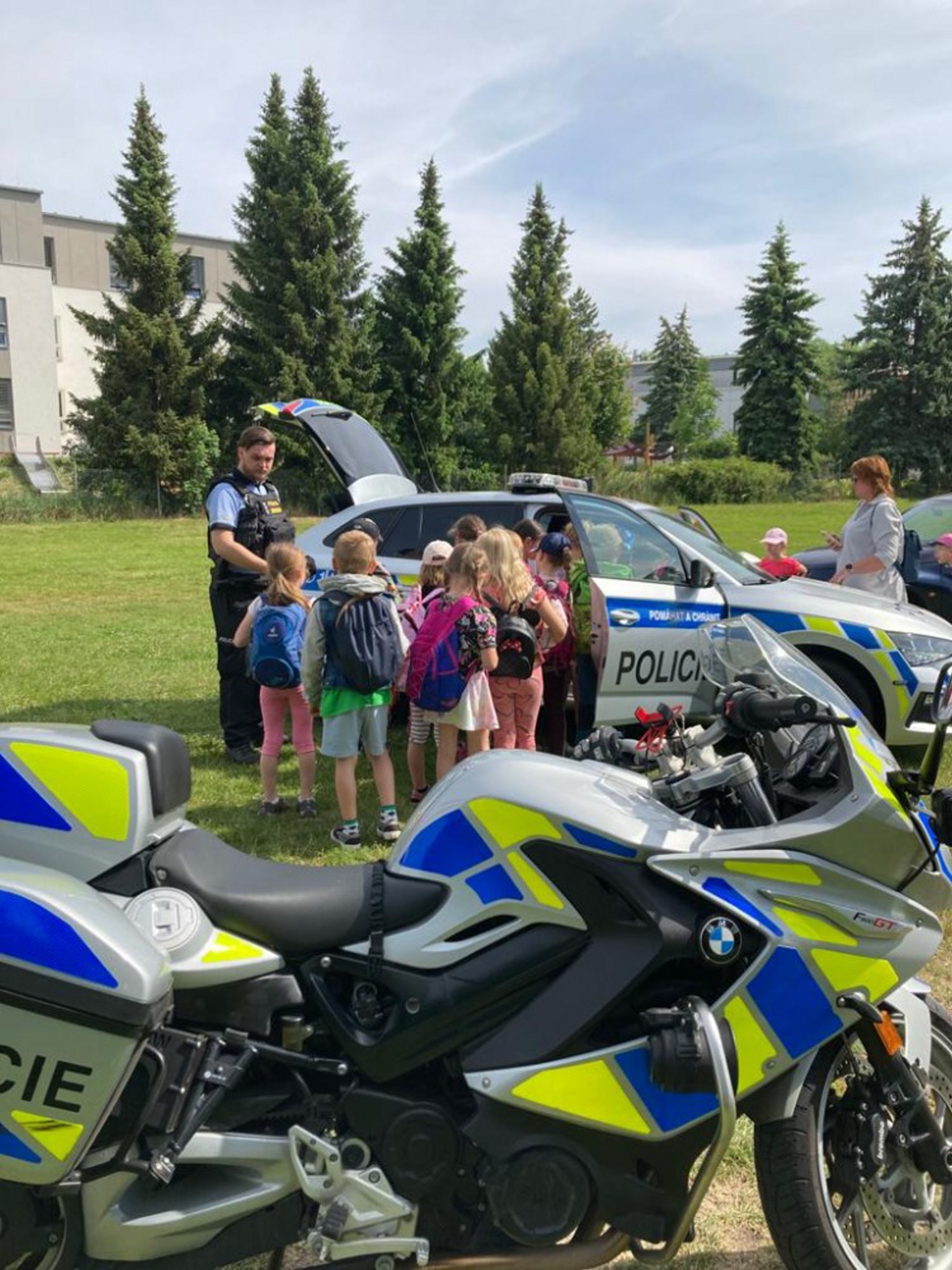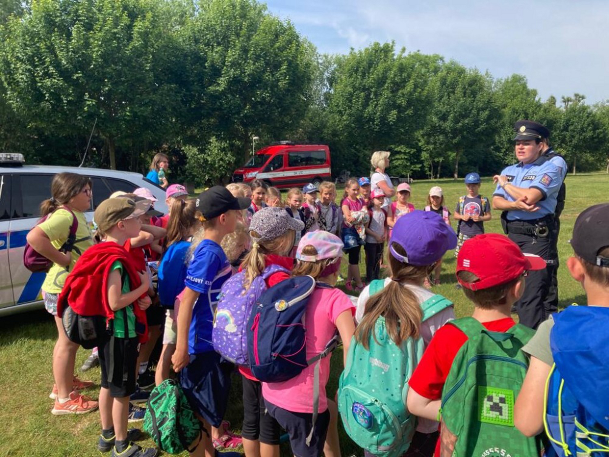 Následně se děti rozešly po louce a mohly si vyzkoušet resuscitaci osob či ošetření drobných zranění u stánku červeného kříže, popovídat si o bezpečnosti v dopravě se zástupci policie. Jejich pozornost přitahovala především zásahová motorka dopravního policisty.