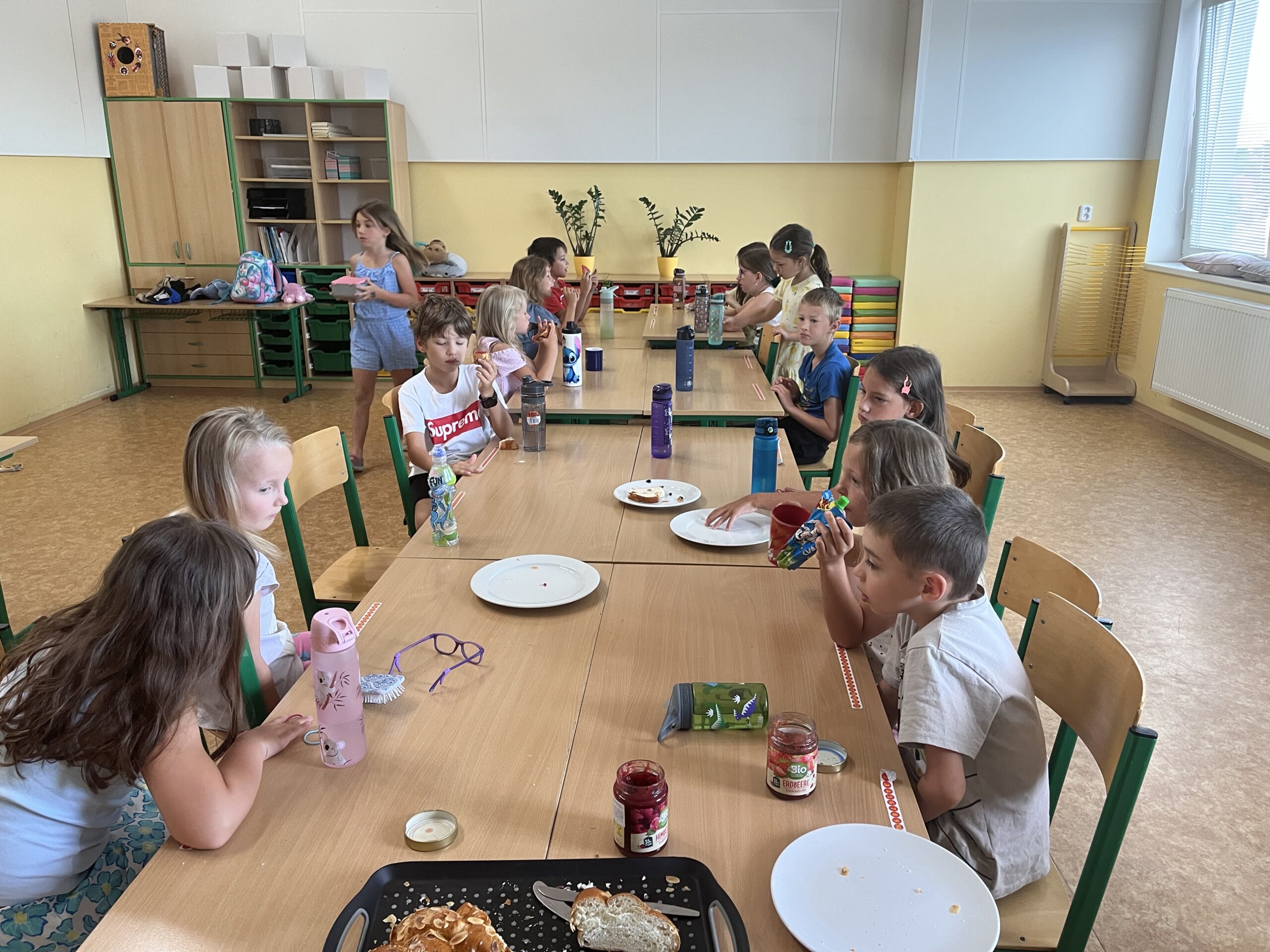 Dnes ráno jsme vstali do prosluněného dne. Budíček byl v půl osmé a v půl deváté si děti pochutnávaly na  čerstvých houskách a obloženém talíři.