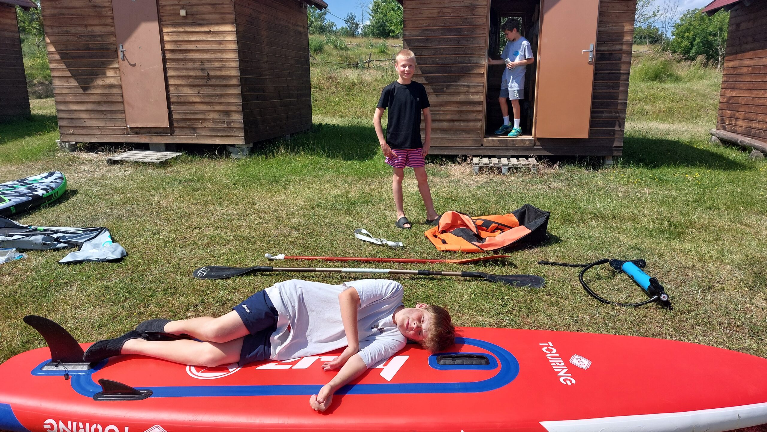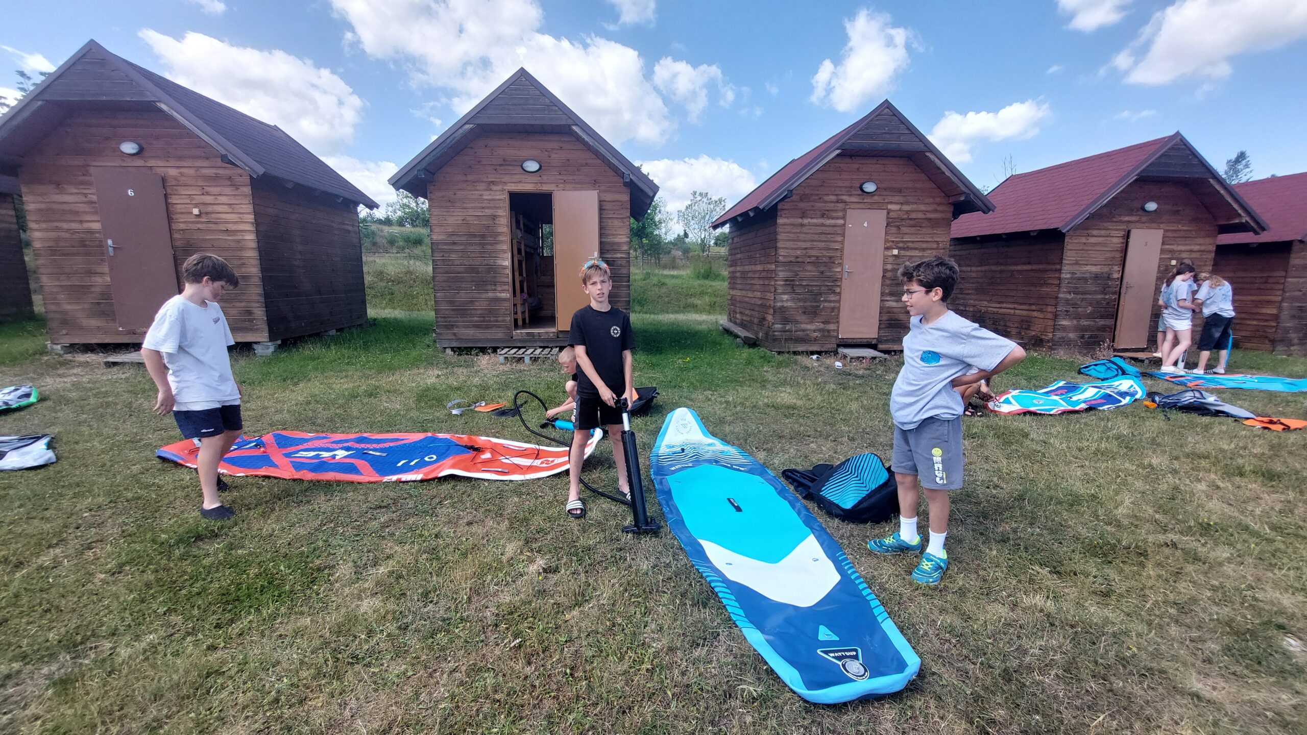 Cesta autobusem byla rychlá, ale i tak jsme si zvládli zazpívat pár písniček. Před našimi chatičkami nás uvítaly ovečky. Sluníčko svítilo, my jsme byli nedočkaví, a tak jsme hned nafoukli paddleboardy a vyrazili na rybník. Všem šla jízda skvěle a poradili jsme si i se silným protivětrem. Zvládli jsme i nasbírat mušle a zahrát si beach volejbal. Z celodenního sportování a slunění jsme krásně unavení.