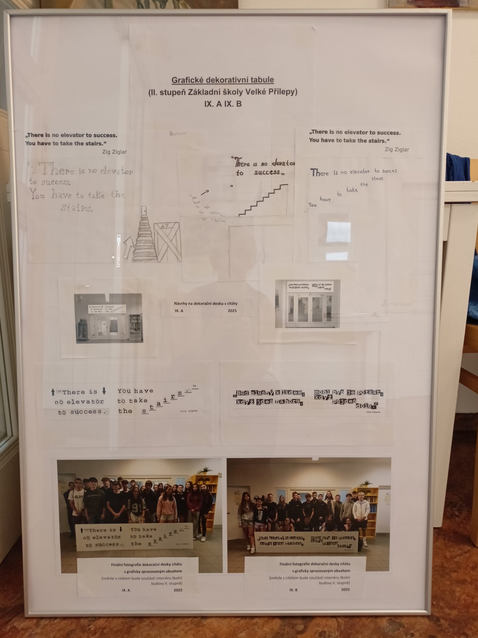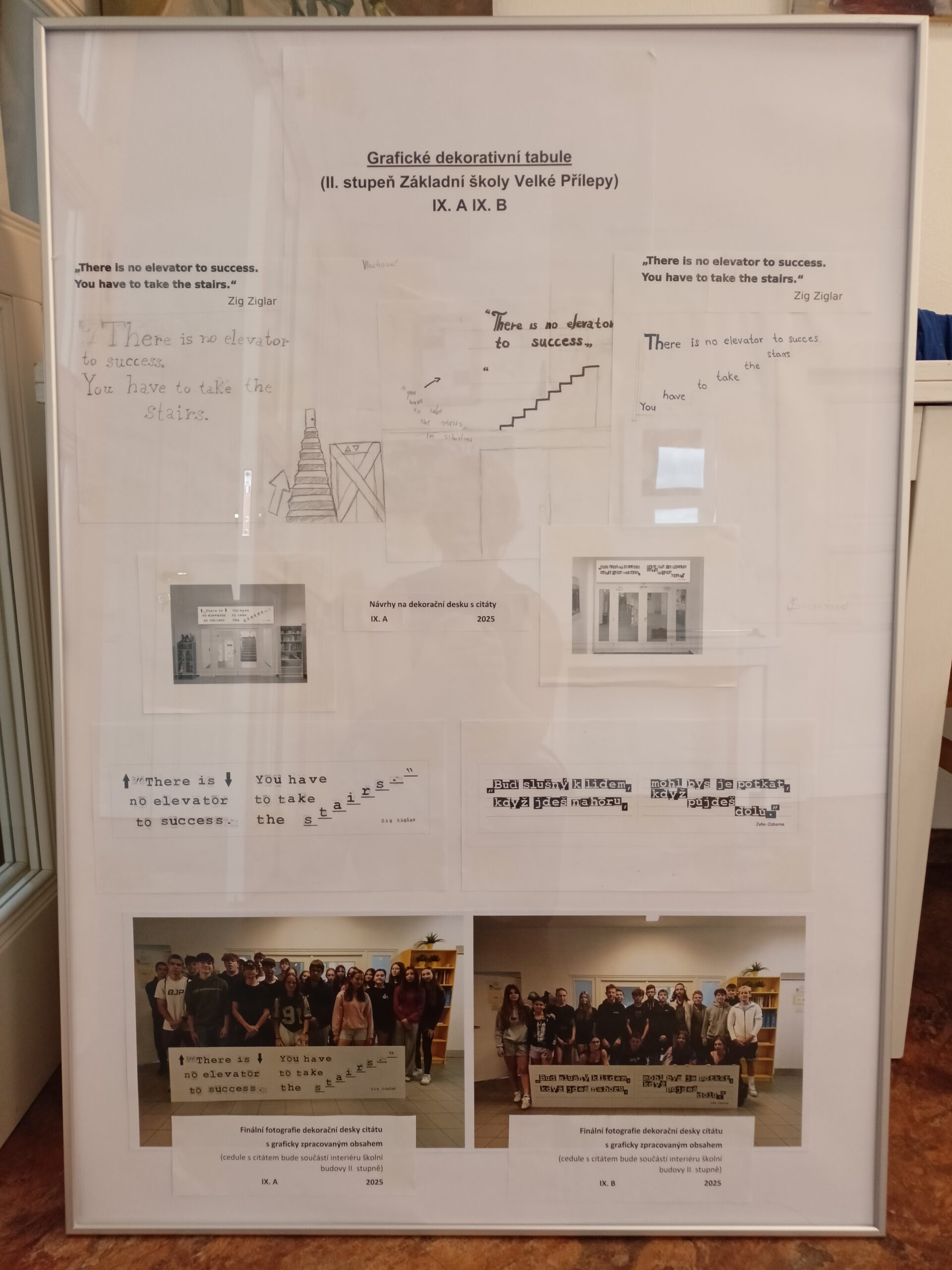 Máme nový celoplošný vizuál v budově II. stupně v naší Základní škole Velké Přílepy! 🙂 Na díle pracovali žáci IX. A a IX. B v hodinách výtvarné výchovy. Jejich grafické tisky linorytu se „transformovaly“ a staly se originálními novými fonty pro dva citáty, které tvoří obsahovou část grafických cedulí. Až se během třídních schůzek a akcí školy budete moci podívat do budovy II. stupně, uvidíte je sami. V příštím školním roce nás čeká výzva v podobě ještě jednoho citátu, který by doplnil současnou sérii grafických cedulí.