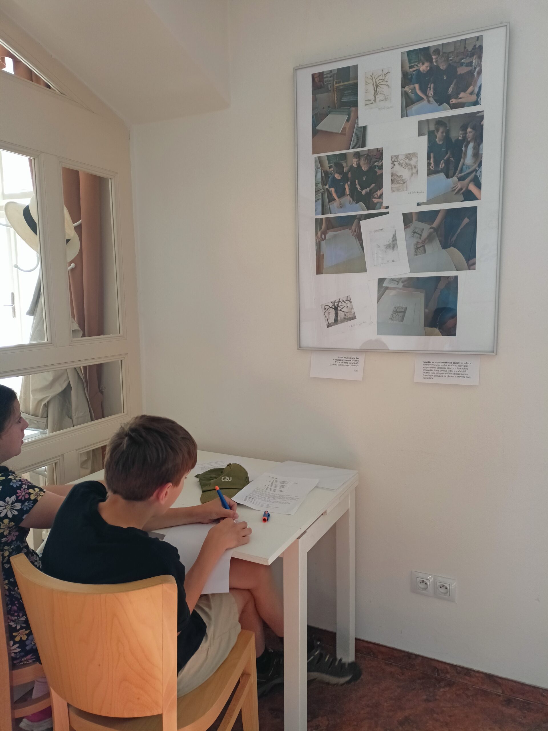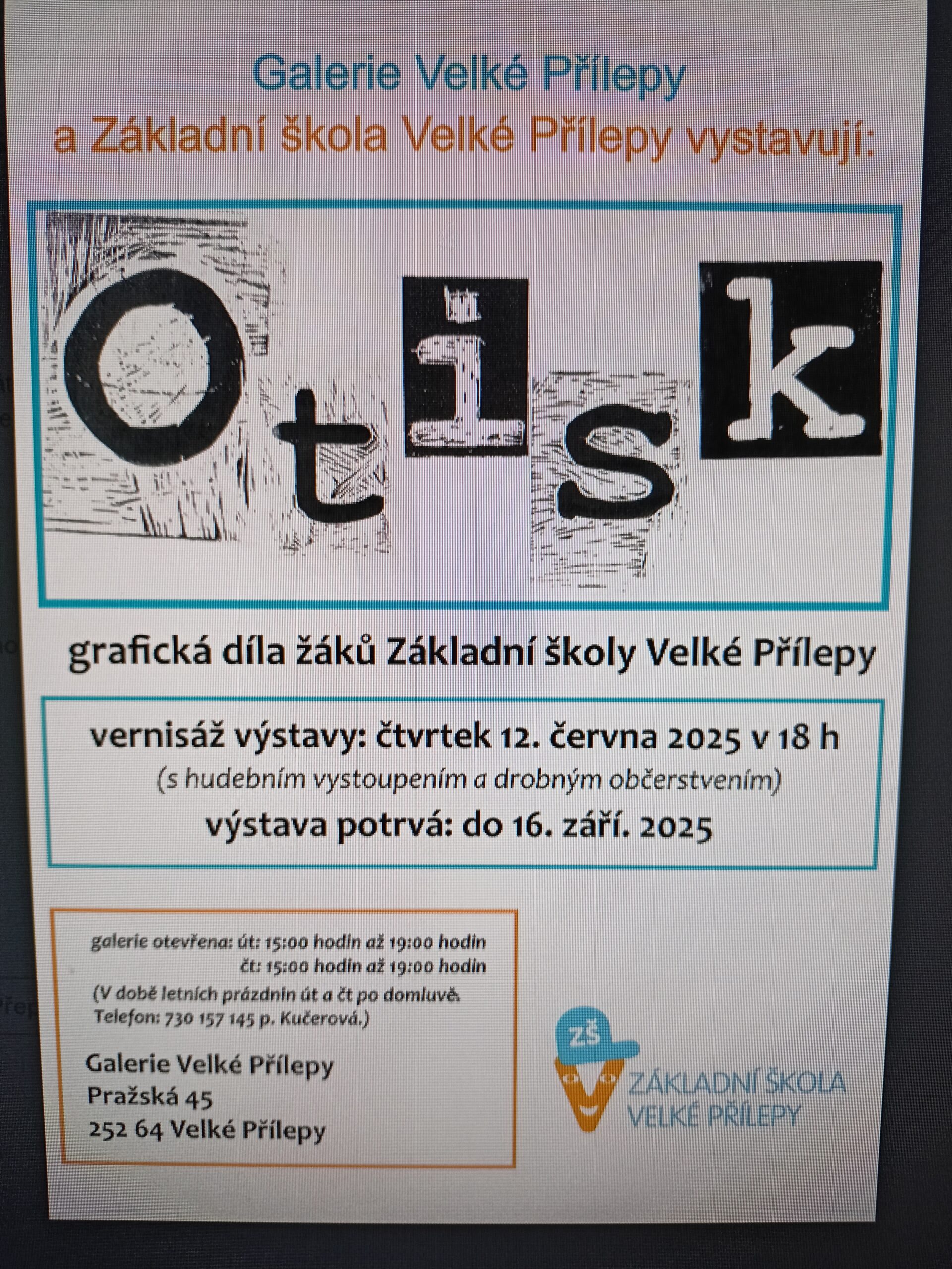 Příprava, tvorba, instalace, vernisáž. Přesně v tomto sledu se odvíjelo vše k výstavě Otisk, kterou můžete navštívit (pokud jste již tak neučinili) v Galerii Velké Přílepy až do 16. září 2025. Přesně několik měsíců intenzivní tvůrčí činnosti zabrala celá plejáda tvůrčích činností. Poděkování patří všem žákům II. stupně, kteří v hodinách pod mým vedení tvořili grafické práce. Bylo vidět zápal pro tuto nesmírně tvůrčí techniku, velké soustředění a krásné nápady. Mockrát děkuji Ondrovi, Péťovi a Martinovi kteří pomáhali při instalaci. Ti si na vlastní kůži vyzkoušeli, že cesta díla končí teprve jeho vystavením a může samotné dílo ještě více vyzdvihnout. Všichni otiskli sebe do svých grafických prací originálně a tvůrčím způsobem sobě vlastním. A jak už někdo dříve řekl, že za umělce hovoří jeho dílo, prosím zhlédněte galerii, která je průřezem všeho toho činění se v umělecké oblasti. V galerii je ještě doprovodný text k výstavě, který vše shrnuje. Těšíme se spolu s žáky, že galerii navštívíte a naživo tak shlédnete um našich žáků 😊