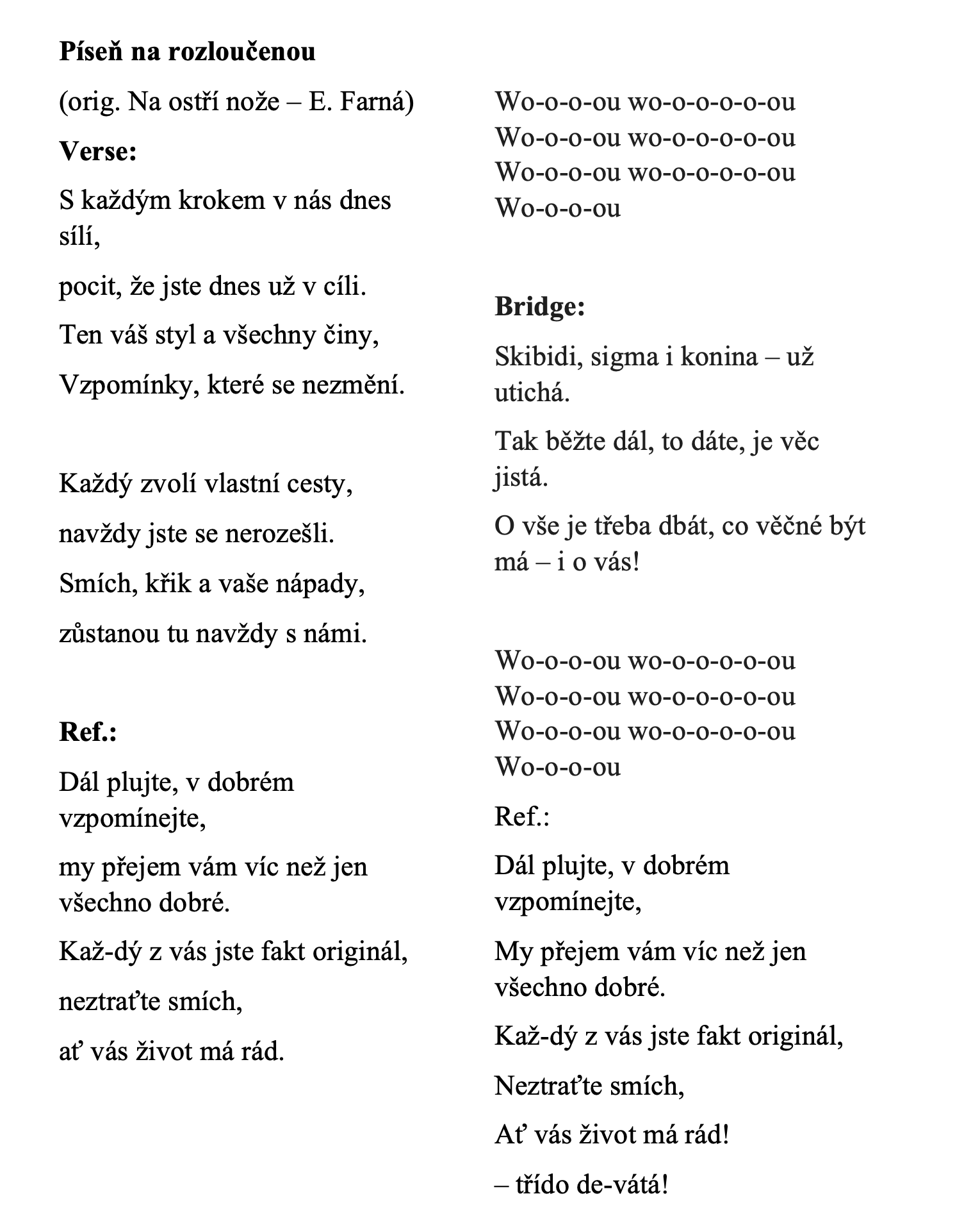 Rozlučka začala krásnými a dojemnými (a místy velmi vtipnými) proslovy zástupců obou tříd. Nechybělo poděkování všem třídním učitelkám, které s nimi prošly nejedním školním rokem plným exkurzí, lyžařského výcviku, kin, opékání buřtů i nástrah klasifikace. Kromě květin padla i upřímná slova. Deváťáci ocenili nejen jejich trpělivost a smysl pro humor, ale také fakt, že to s nimi paní učitelky někdy neměly lehké. (I když – jak sami přiznali – platilo to občas i obráceně.)