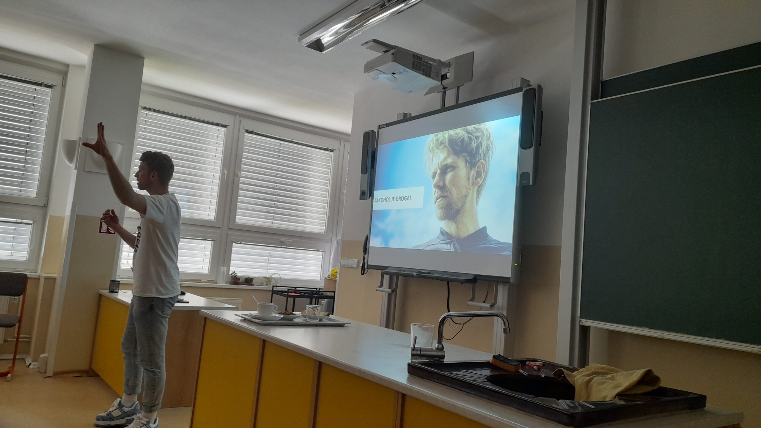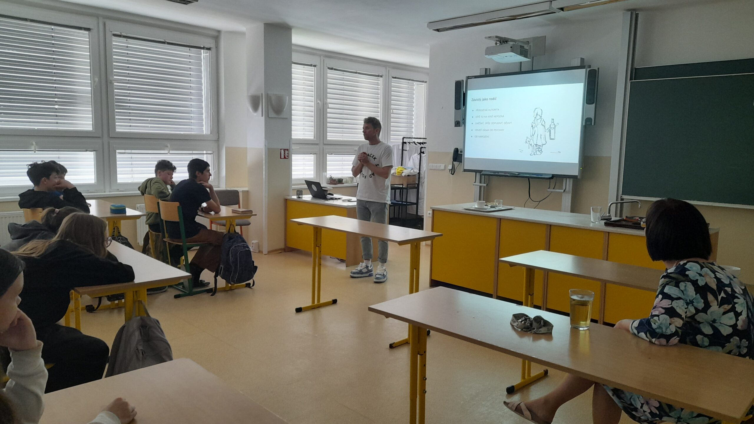 Proto jsme pozvali na přednášku pana Petra Harazima, bývalého frontmana kapely Nebe. Přestože byl velmi úspěšným hudebníkem, alkohol nad ním zvítězil. Ale byl natolik silný, že s tímto démonem svedl úspěšný boj. O svém životním příběhu, o důsledcích užívání alkoholu, o nástrahách závislostí, ale i problémech v rodinném prostředí, kde alkohol převládne, velmi poutavě povyprávěl žákům osmých ročníků.