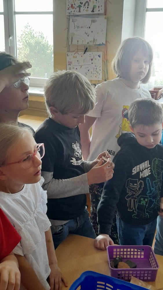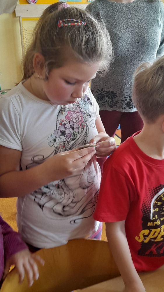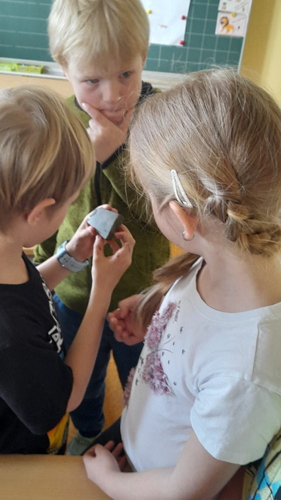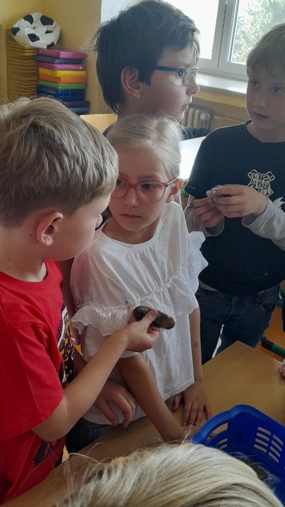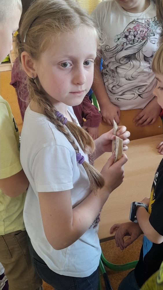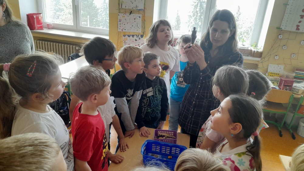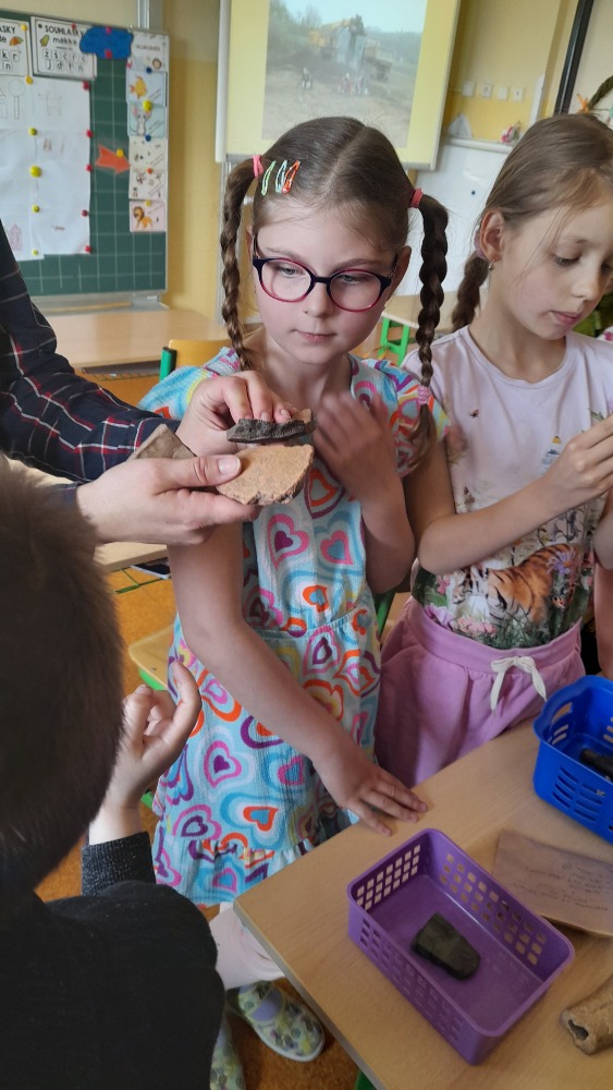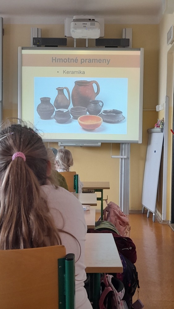 Nejprve povyprávěla žákům ve II. A. Ti sice ještě vlastivědu nemají, ale její zajímavé povídání o tom, jak probíhá průzkum, a ukázky nářadí, se kterým se artefakty po našich předcích objevují, několik opravdových nálezů a třeba i zlomky kostí pravěkých zvířat, to vše druháčky opravdu nadchlo.