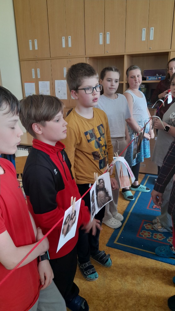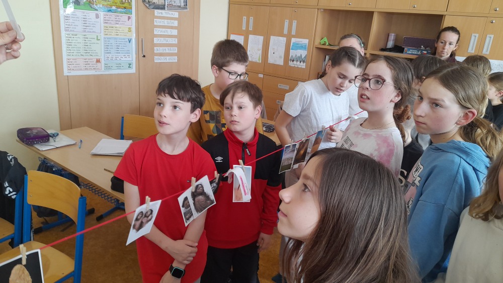 Druhou hodinu se paní Klimešová věnovala třídě IV. A, kde se žáci o pravěku zrovna učí. Tudíž skvělé doplnění výuky. Navíc improvizovaná časová osa, na kterou děti umísťovaly důležité přelomy dějin, jim názorně ukázala, jak dlouho dobu se lidstvo vyvíjí a jaký zlomek historie žijeme od počátku letopočtu.